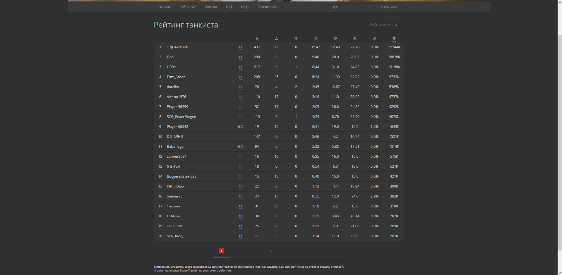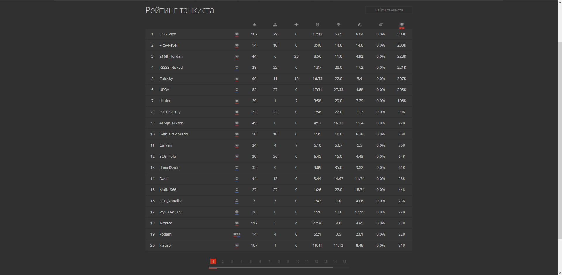 BOPOH624 Опубликовано: 7 января 2021 Опубликовано: 7 января 2021 (изменено) В дополнение к предыдущему посту: На сервере, статистика которого приведена в предыдущем посте, за семь суток побывало 153 танкиста. В первых строках рейтинга (из 20 строчек) - 18 "синих" игроков и 2 "полосатиков". "Красных" игроков на первой странице нет вообще. Бесплатные танки на сервере присутствуют. Вот статистика другого сервера за этот же период . Правда, сервер, скорее, - авиационно-танковый и танковые "схватки" на нем среди живых игроков скорее исключение, чем правило: За первые семь суток января на нем побывало 344 танкиста. В первых строках рейтинга (из 20 строчек) - 7 "синих" игроков и 1 "полосатик". "Красных" игроков -12. Бесплатные танки на сервере отсутствуют. Ну третий сервер, тоже чисто танковый: Все танкисты, побывавшие на нем за семь суток января уместились на одной странице. Итого 20 человек На этой странице 10 "синих" игроков , 1 "полосатик" и 9 "Красных" игроков. Бесплатные танки на сервере отсутствуют. Тенденции прослеживаются? Изменено 7 января 2021 пользователем BOPOH624