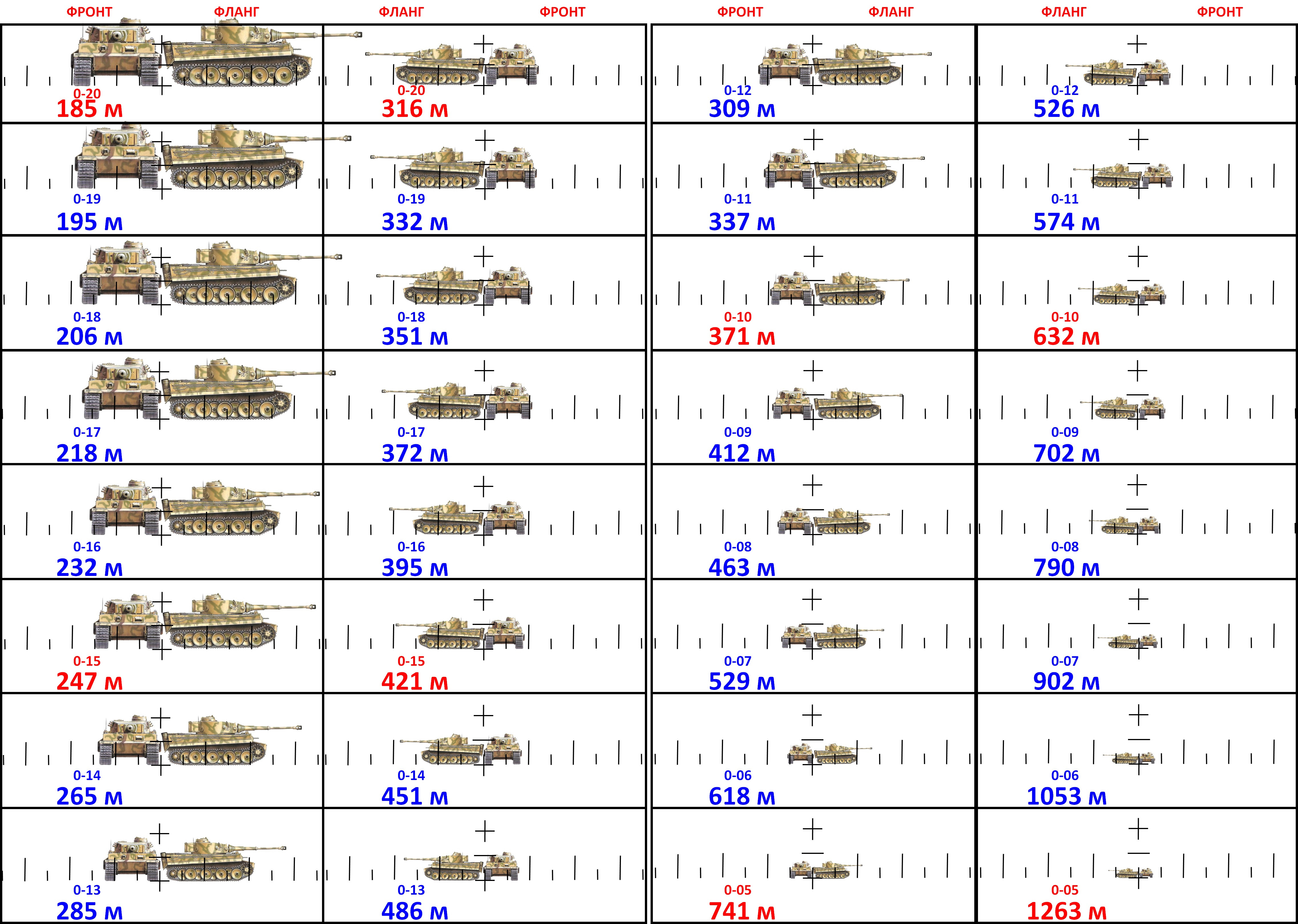 BOPOH625 Опубликовано: 23 мая 2019 Автор Опубликовано: 23 мая 2019 Для затравки: Как использовать прицел ТМФД-7 танков Т-34 и КВ-1С для определения дальности до цели? Все просто. "Дую в тысячу" То есть использую мнемоническое правило для формулы "тысячной": Д = В х 1000 / У, где Д - дальность до цели в метрах, В- высота (ширина, длинна) цели в метрах, У - видимый размер цели в "тысячных" (делениях угломера или прицела, или бинокля) Цена одного деления в прицеле ТМФД-7 = четыре "тысячных" или "ноль-ноль-четыре" (0-04) Если считать лень, или вы не умеете: Наглядная таблица определения дальности до танка Pz-VI "тигр" (габаритные размеры длины и ширины корпуса - 6,316 м и 3,705 м соответственно). и для Pz-III L (публиковал неоднократно, но пусть будет): 6 2