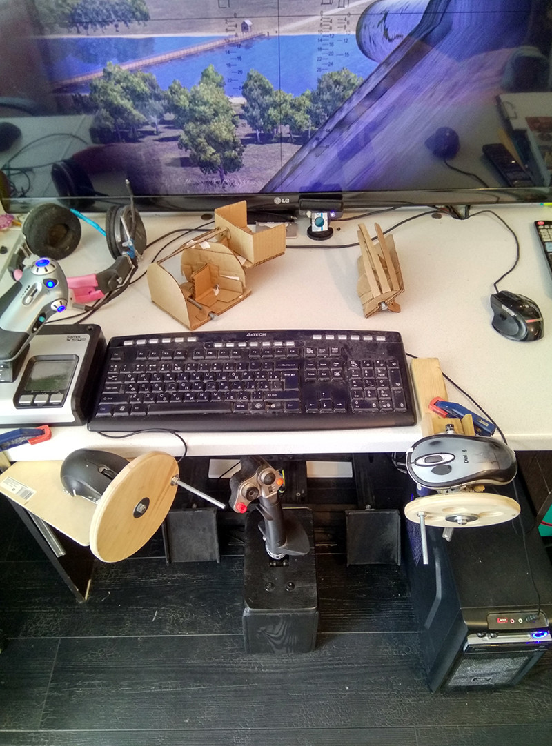 Valentin_K Опубликовано: 11 августа 2019 Опубликовано: 11 августа 2019 Привет танкистам и пилотам! Задумался о самодельном управлении для наводчика орудия. Первоначальную задачу себе поставил - собрать максимально простые органы управления, чтобы любой заинтересовавшийся смог повторить. В целом получилось. За основу самодельного управления брал место наводчика в Т-34. Цена вопроса - 2 вечера, 2 старых мышки, деревяшки и 30 руб. на железо. В первый вечер определился с выбором танка и управления, сделал картонный макет, во второй вечер собрал рабочую альфу, протестировал. Скрытый текст Впечатления Если коротко, то управлять с места наводчика обычной мышкой больше нет желания. Описать можно схожими ощущениями как после мышки и клавиатуры впервые сесть за напольник, РУД и педали. Т.е. я сел в танк. В общем у меня были подозрения, что симулятор - это 50% программная и визуальная среда, а 50% это органы управления - я для себя эту формулу подтвердил. Целиться стало много сложнее, но теперь целишься как реальный наводчик. Наведение орудия по горизонтали осуществляется вращением левого маховика - можно им в буквальном смысле вести движущую цель сопоставив её скорость и скорость вращения. Расположение его такое, что в горизонте наводишься интуитивно. Правый маховик вертикальной наводки наоборот требует привычки и практики (в Тигре расположение лучше). Расположение обоих маховиков удобно, эргономично. У Т-34 слева от наводчика располагался ручной спуск - это нифига не удобно) Ножной спуск - самое то чувствую будет. За счёт того, что маховики ходят чуть с усилием, можно не боятся что микродвижением собьется наведение. Стрельба стала ощущаться по другому, теперь это не контрстрайк. Танк стал в целом ощущаться более медленным, более тяжёлым. Башня теперь не летает за курсором, ты её теперь двигаешь, руками. Особенно это ощущается на Pz. 3 с выключенным движком, когда скорость вращения маховика и орудия совпадают с озвучкой - ощущается круто. Как это работает На оси горизонтального и вертикального устройства наведения надеты картонные цилиндры d=18 мм., одна мышь расположена датчиком горизонтально относительно оси вращения, другая вертикально. К компьютеру подключено 3 мышки - которую Виндовс и игра по умолчанию воспринимает как одну, но перехватывающую друг у друга управление. В настройках мыши (в Виндовс), во время игры, чувствительность выставляется в минимум. Обзор в процессе игры осуществляется трекиром. Из недочётов По "железу". В целом по железу один недочёт - расположить мышки так, чтобы было чёткое движение по оси со 100% точностью не получится. Если орудие поднять вверх, а потом опустить вниз, то вертикальный прицел от первоначальной точки, хоть на несколько пикселей, но уйдёт. Аналогично для горизонта. В целом в динамике боя это не мешает. По игре. Тут вскрылся ворох проблем. 1. Движение по оси Х и Y - не линейно. Т.е. один оборот маховика без зума и при разном зуме, даёт совершенно разные результаты. 2. У наводчика Т-34 два прицела + вид от первого лица на одной кнопке - путает сильно. 3. Камера и орудие постоянно уезжают из поля зрения, что мягко говоря неестественно. 4. Отвлекающие промежуточные действия между поворотом маховика и игровым поворотом орудия (переключись на наводчика, взгляни в прицел, прицел уехал, дождись пока вернётся в поле зрения, возьми управление ор