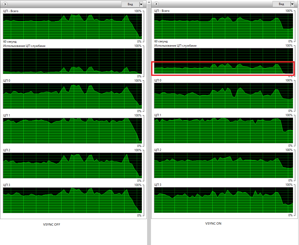 Вот загрузка процессора на одном и том же треке с вкл и выкл синхронизацией. Странно выглядит загрузка "цпу" службами.