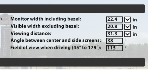 В настройки вводится горизонтальный размер монитора с рамками, горизонтальный размер без рамок (матрицы), расстояние, на котором находится игрок и угол между боковыми и центральнм монитором.