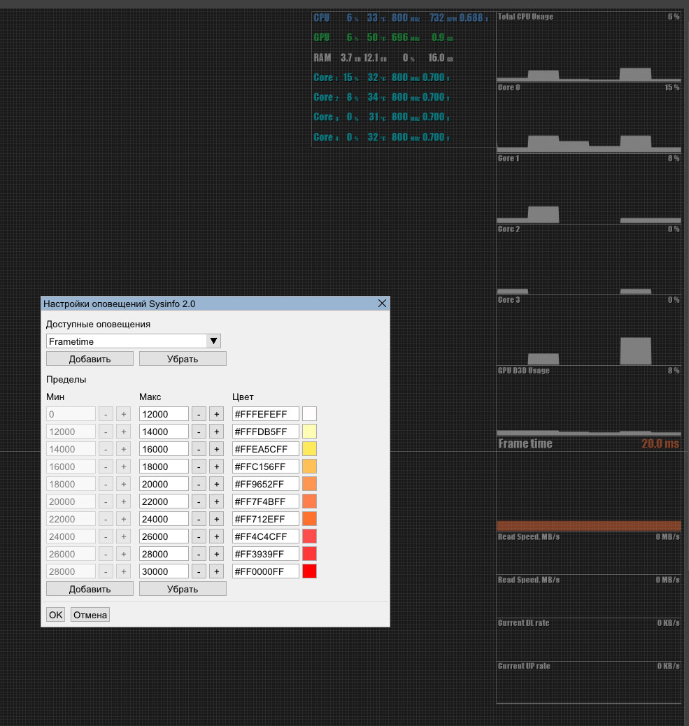 Сначала настройки цветового оповещения для FPS Monitor, что бы было наглядно, красный цвет это значение Frametime > 20 мс. Обратите внимание на график Frametime ниже на картинках, какое количество кадров имеет красный цвет (т.е. более 20 мс), в 1 секунде из 60 кадров.