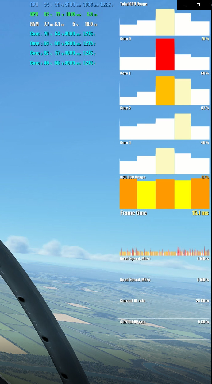 У меня история такая, что пришлось откатиться с 970 на 670 GTX. На средних настройках графики, на сервере берлога в час-пик, сейчас это 40-50 чел, вполне себе комфортно летается, статтеров почти нет. Вот когда дело доходит до облаков, вот тогда да. Но посмотрев несколько видео на ютубе, понял, что старушка 670 их действительно не вывозит.