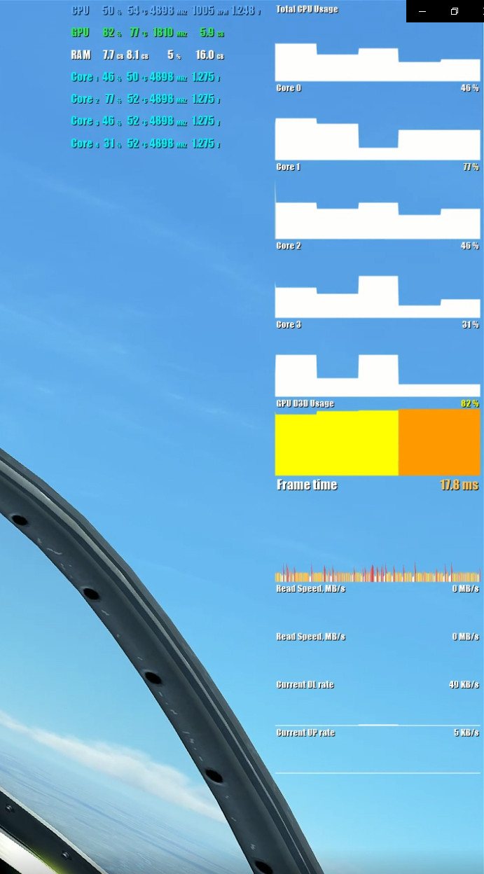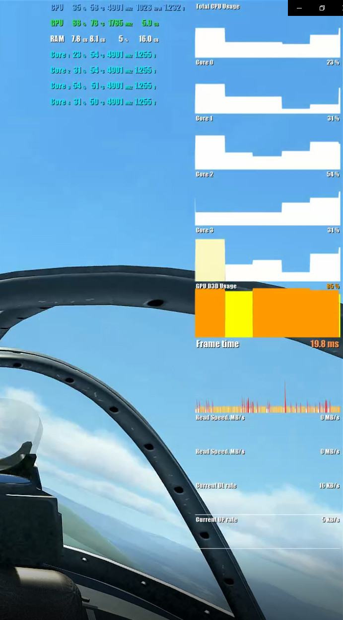 Смотрим далее - в общей сложности приблизительно 23 кадра из 60 имеют время кадра > 20 мс, при этом нагрузку на компоненты железа мы видим вообще смешную: