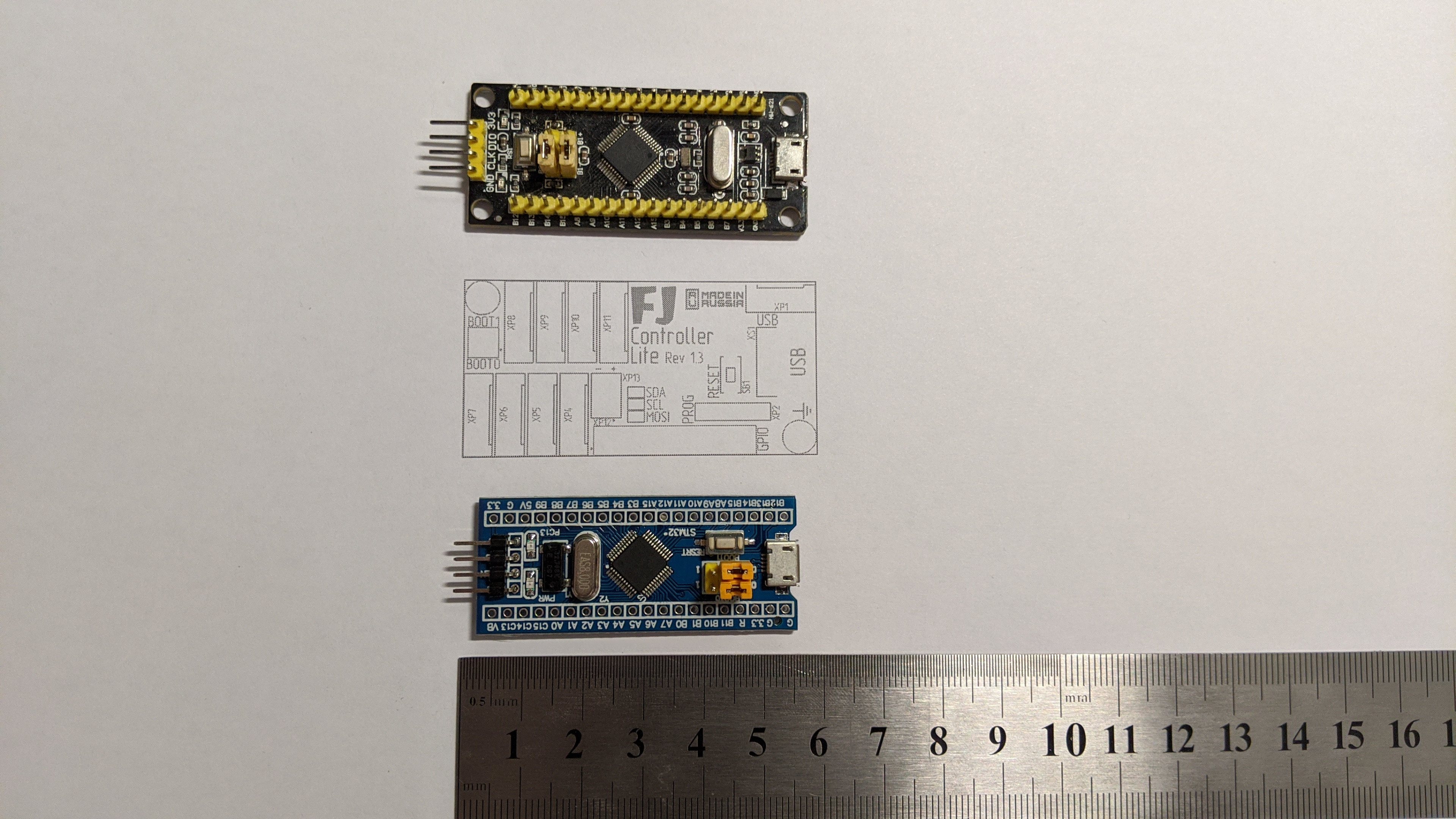 Улетели платки контроллера в производство. Вот наглядное сравнение размеров того, что получится с bluepill и blackpill: