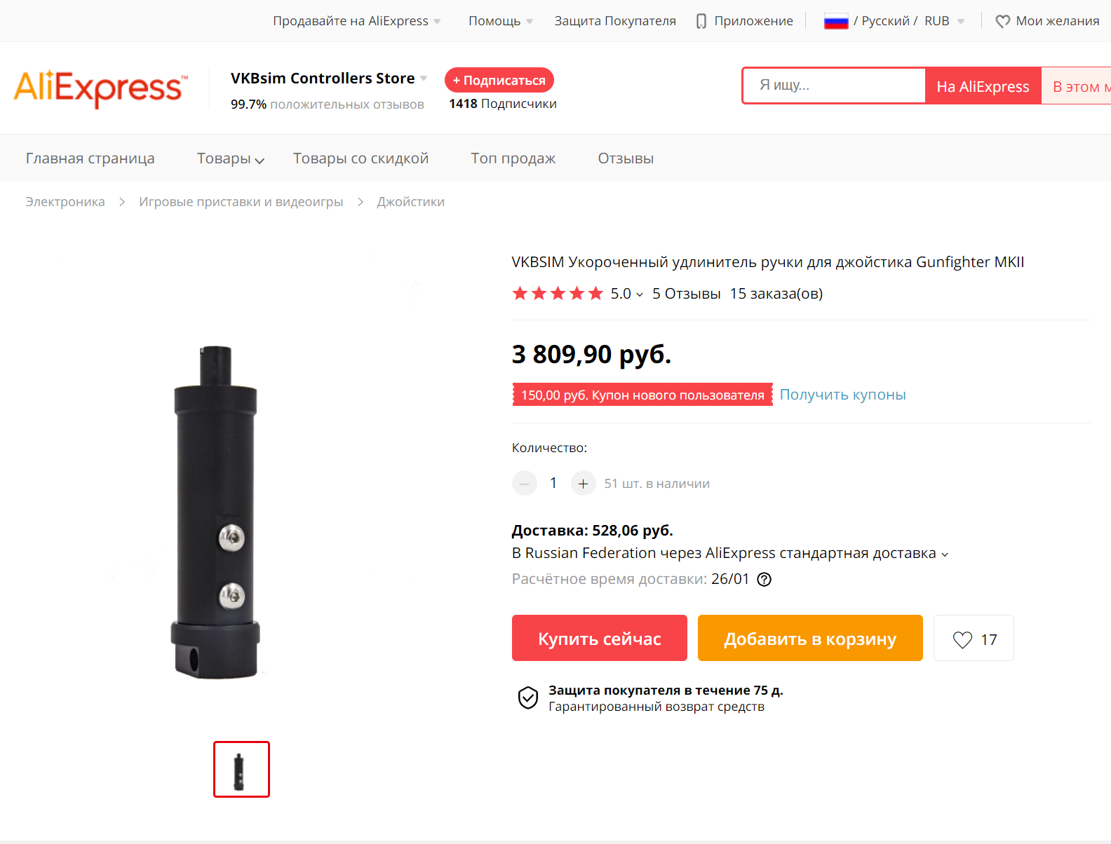 Kolomiiets Опубликовано: 4 января 2021 Опубликовано: 4 января 2021 1 час назад, Vumpel18 сказал: https://vkbcontrollers.com/?product=stick-extension-kit-50-mm-straight Показать содержимое Так речь то в общем то о стик или ручках SCG в состоянии покоя ? Либо я долблюсь в глаза, либо на Али действительно нет 50 мм. удлинителя в каталоге. Ну, зато я точно знаю что он есть. А значит смогу как-то заказать.