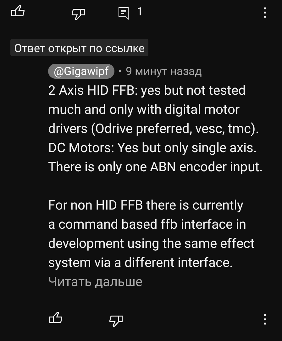 propeler Опубликовано: 15 декабря 2022 Автор Опубликовано: 15 декабря 2022 9 минут назад, Sieben_Sieben сказал: Это для серво мотора. Никакого отношения не к DC не к авиа, проект не имеет. Currently supported motor drivers: - FFBoard TMC4671 - ODrive (CAN) - VESC (CAN) - PWM (centered, pwm+dir, RC ppm, dual PWM) PWM (centered, pwm+dir, RC ppm, dual PWM) - это способы управления DC мотором. Проект поддерживает 2 оси. Что вам еще надо для DC и авиа? 13 минут назад, Sieben_Sieben сказал: Да всё круто, но это не повод положить на DC. Скажите это Thrustmaster-у. Их рули уже сто лет в обед используют BLDC моторы, пускай и не DD. И всем остальным. Первый повод положить на DC - это их бесперспективность в плане того FFB каким его вижу я. Я делал устройства FFB на щеточных моторах. Эти устройства не соответствуют моим понятиям о качественном FFB. Я не хочу чтобы мое имя ассоциировалось с такими устройствами. Второй повод положить - финансовый. Я потратил слишком много времени и денег из своего личного кармана на развитие темы FFB и создание чего то вменяемого. Я почти уверен что больше чем кто либо в сим комьюнити И на второй такой подвиг я не готов. Так что если вы считаете тему FFB на DC моторах перспективной - у вас есть возможность проинвестировать ее разработку и поддержку 3