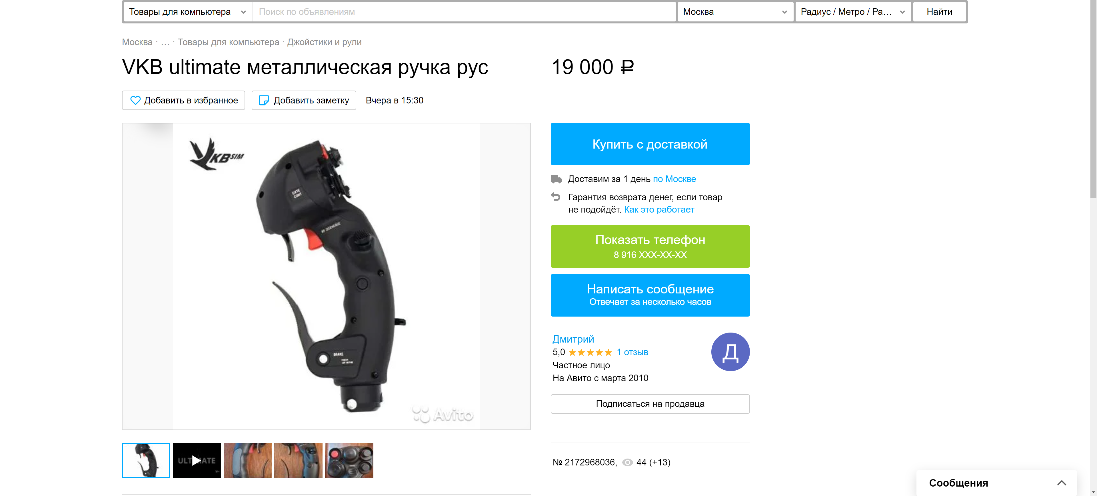 Mutabor Опубликовано: 24 мая 2021 Опубликовано: 24 мая 2021 (изменено) Готовый комплект: https://www.avito.ru/istra/tovary_dlya_kompyutera/dzhoystik_nastolnyy_rus_brd_1745084170 https://www.avito.ru/istra/tovary_dlya_kompyutera/brd_kamov_rul_napravleniya_pedali_dlya_aviasimulya_1745084290 https://www.avito.ru/istra/tovary_dlya_kompyutera/klipsa_dlya_obzora_alya_free_track_1745084401 Самоделкину: https://www.avito.ru/mytischi/tovary_dlya_kompyutera/dzhoystik_thrustmaster_hotas_cougar_1752974536 Изменено 24 мая 2021 пользователем Mutabor