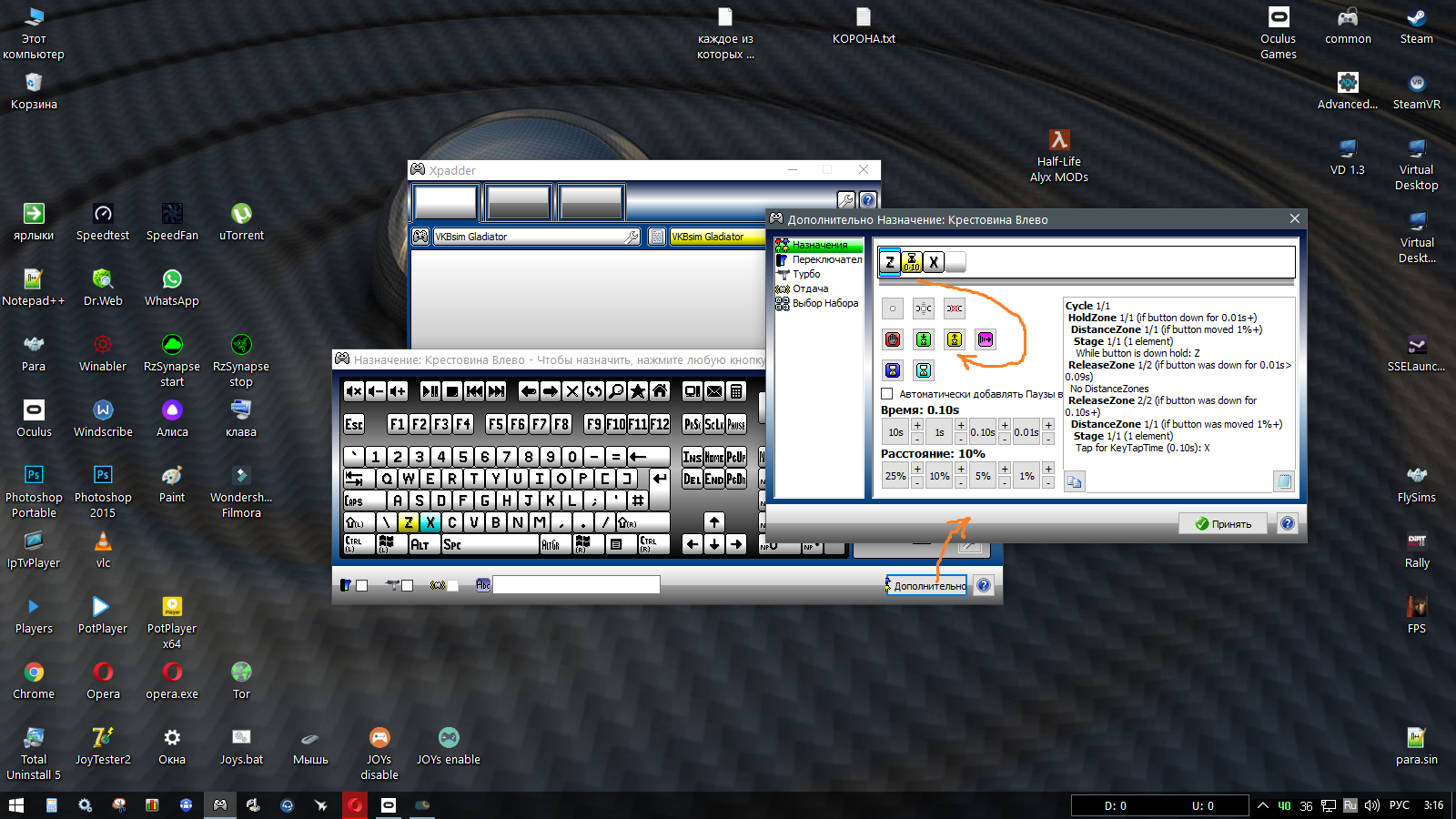 huligan Опубликовано: 1 июня 2020 Опубликовано: 1 июня 2020 Поковырялся в проге Xpadder (аналог JoyToKey) и нашёл,как в ней так же,как в JoyToKey на нажатие и отжатие кнопки джоя(хатки) разные кнопки клавы прикрутить
