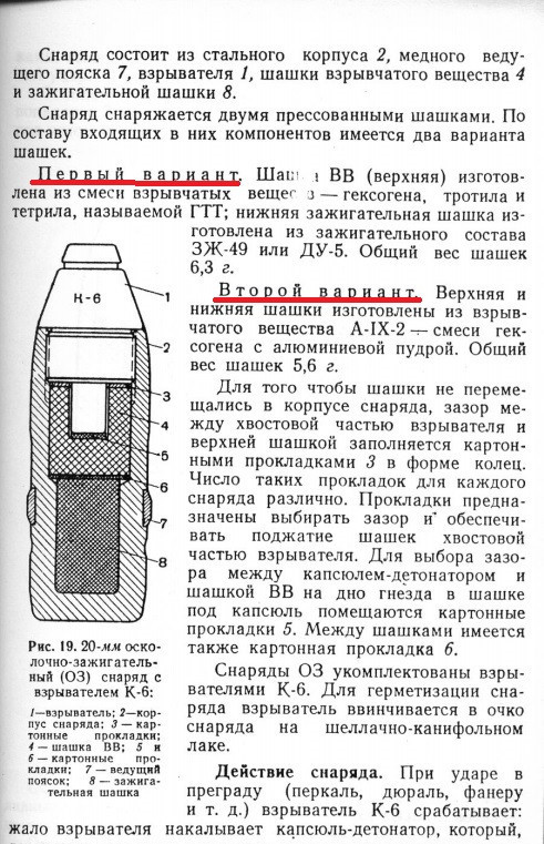 "Несмотря на многочисленную модернизацию снарядов, их действие было достаточно слабо для калибра 20 мм. Сразу после войны в СССР, как и в союзных странах (Великобритания и Франция), за счёт усовершенствования технологий, была увеличена степень наполнения 20 мм авиационных снарядов взрывчатым веществом (в СССР — вдвое)."(с)