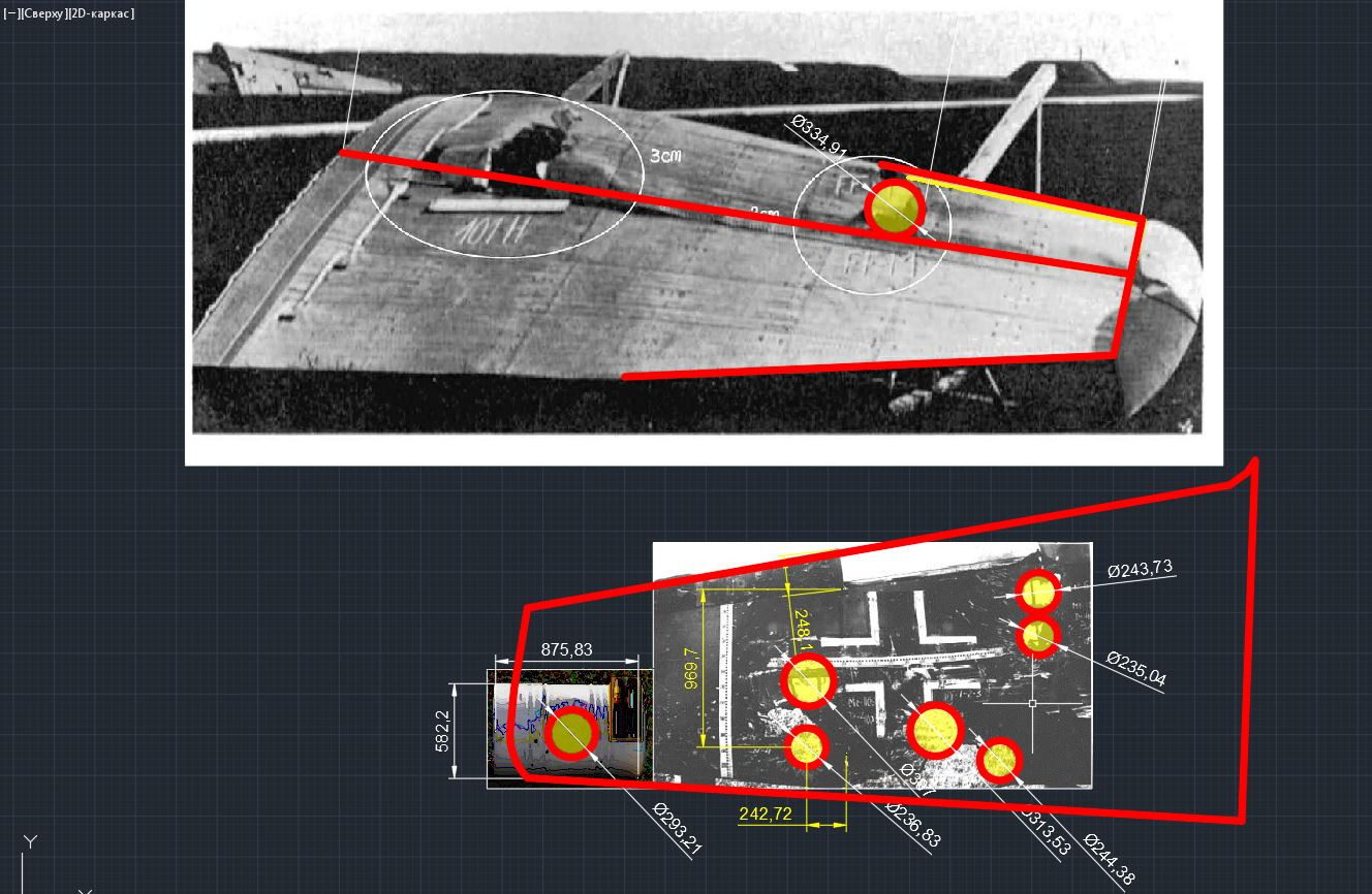 Наверху крыло Хеншеля 124 из немецкого отчета с дырками от МГ-ФФ.