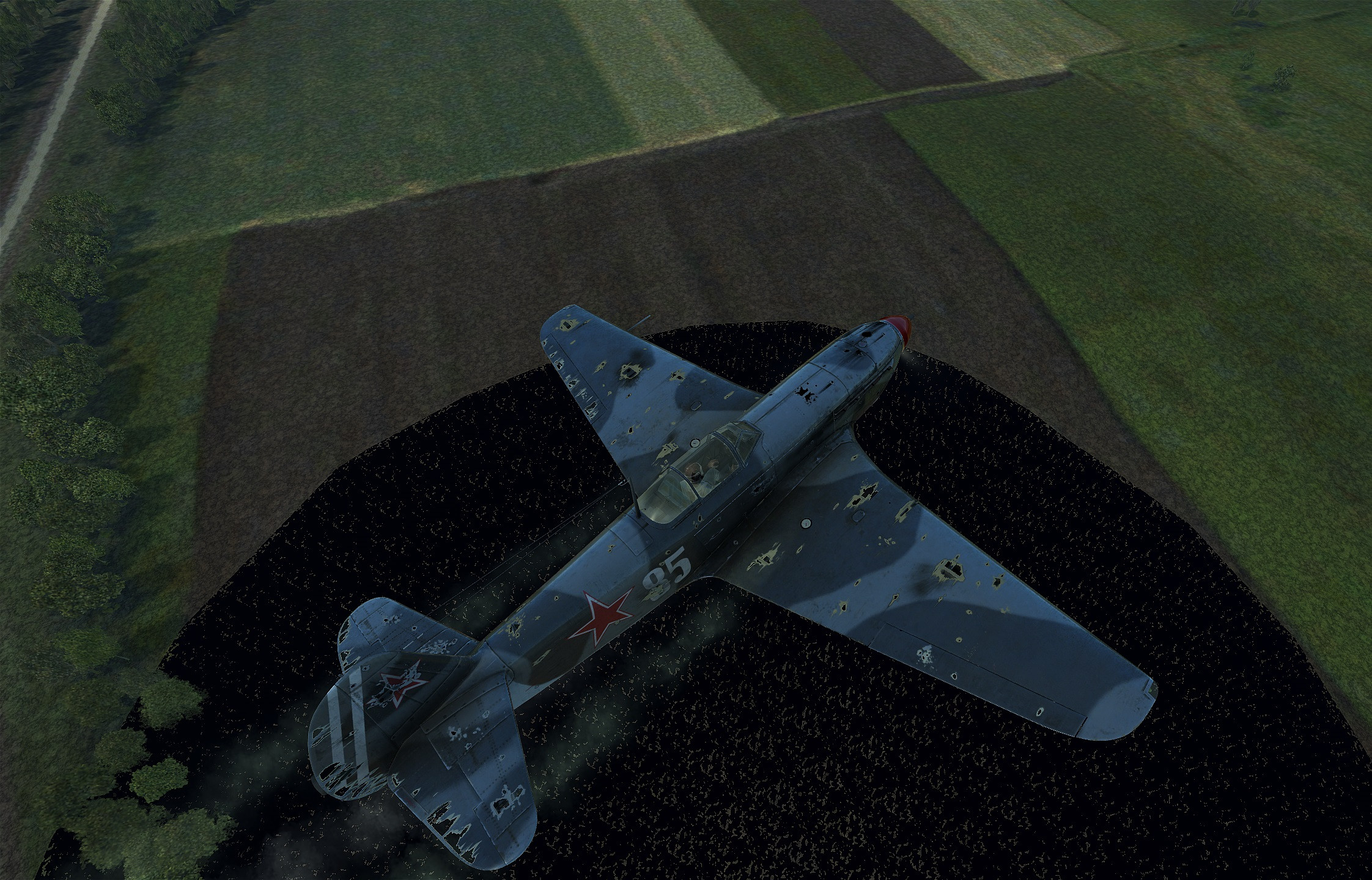 Причём, при посадке при определённом угле к солнцу этот круг исчезает. Один раз заметил как так же (наверное) забликовал переплёт У ЛаГГ-3 на пару секунд. Подумал сначала, это сглаживание так работает, но пригляделся и покрутился - сглаживание работает отлично и без багов. Больше этот баг мне ни разу не попался с переплётом. А вот при посадке этот круг на земле был всё время, но не появлялся на самой ВПП, только по бокам от неё. На этом скрине этот круг не видно, как суслика, но он есть! :biggrin:  Потому как бликует и не на каждом скрине захватывается. Его надо представлять сбоку от утоптанного "пробега".