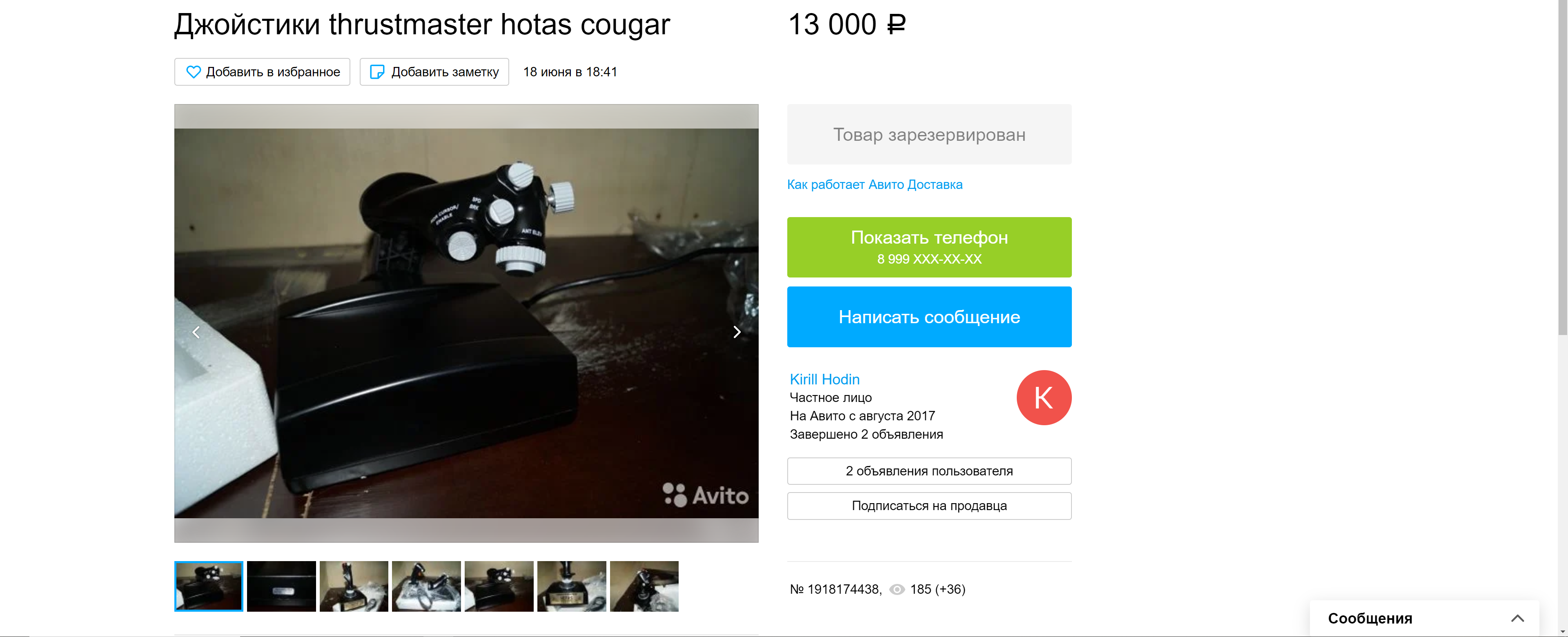 Botanik Опубликовано: 16 июля 2020 Опубликовано: 16 июля 2020 16 000 ₽ https://www.avito.ru/moskva/tovary_dlya_kompyutera/dzhoystik_rud_thrustmaster_hotas_cougar_1976610238 10500 руб https://www.avito.ru/novokuznetsk/tovary_dlya_kompyutera/thrustmaster_hotas_cougar_1907365759?slocation=621540 13000 руб - Новый https://www.avito.ru/kubinka/tovary_dlya_kompyutera/dzhoystiki_thrustmaster_hotas_cougar_1918174438