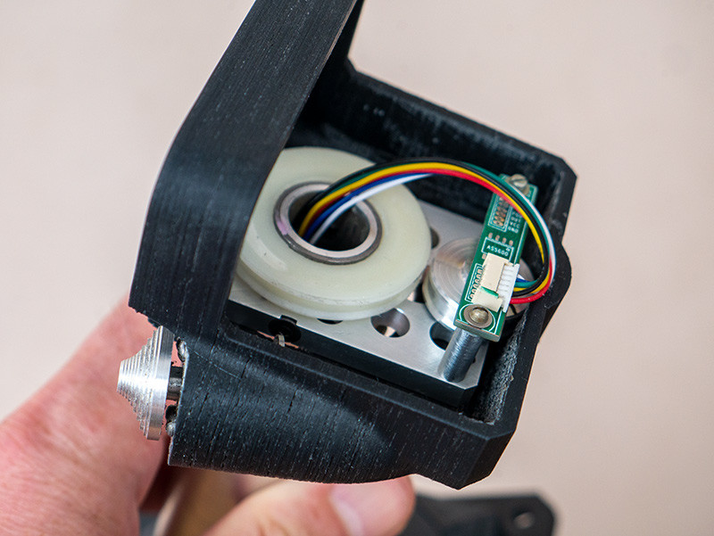 micro-flight Опубликовано: 24 августа 2021 Автор Опубликовано: 24 августа 2021 Запустил вчера первую ось, на поворотной ручке. Результатом очень доволен, стабильное поведение оси, высокое разрешение. Ось получилась на 16 т. отсчетов, на почти 90° хода ручки. Для моего РОШа впервые ставлю редукторную схему для получения сигнала, отработанные решение не подходили и приходилось пробовать много новое. Например ведомый шкив делать из капролона а ведущий располагать на одном единственном подшипнике. Конструктивно получилось тоже неплохо, довольно компактно. К общему весу это дополнение добавило около 30 грамм, теперь вес всей конструкции в сборе составляет 236 гр. 4