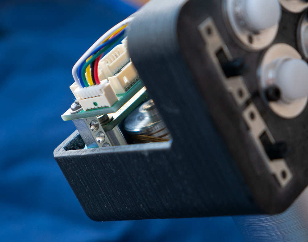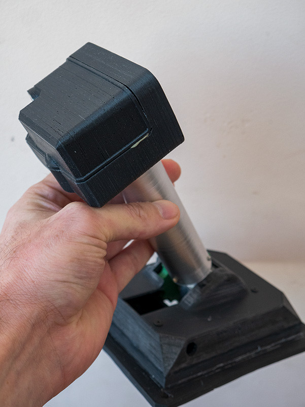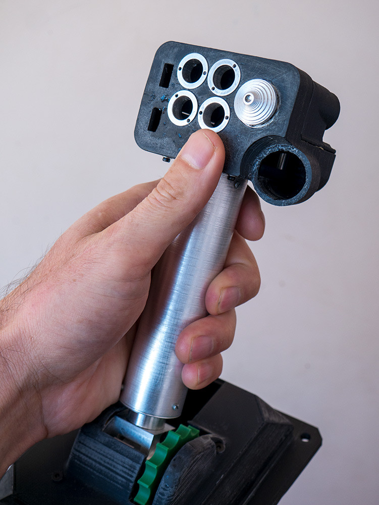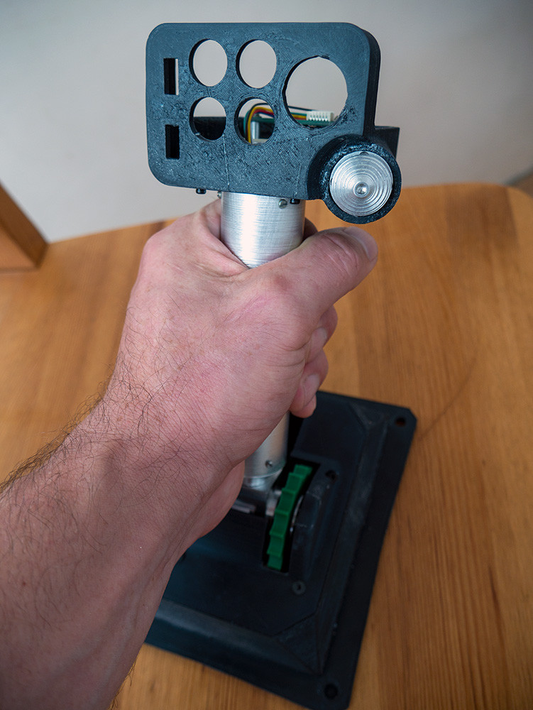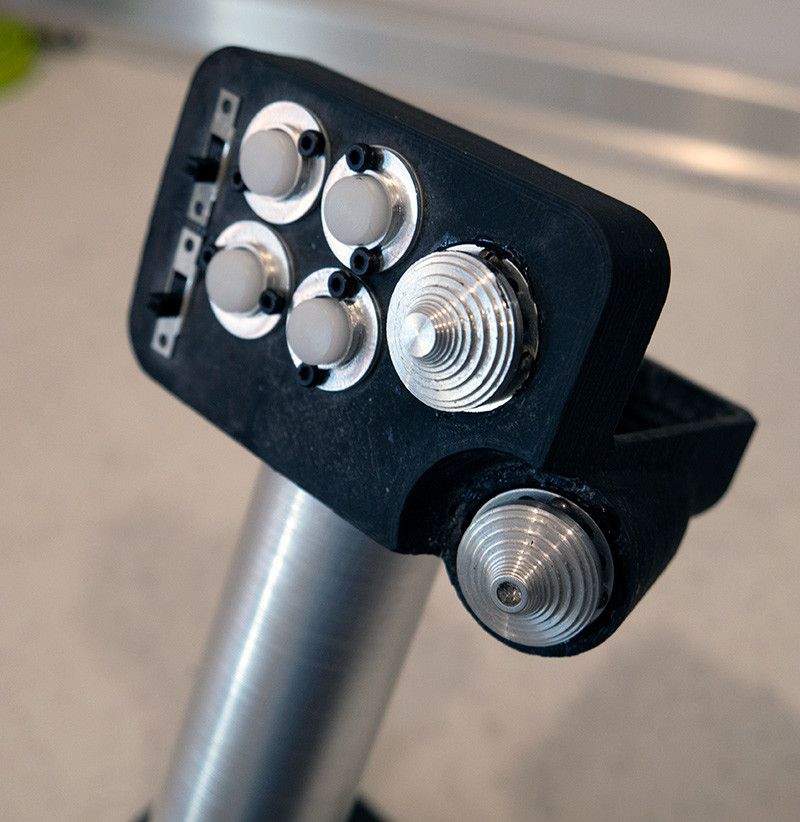 micro-flight Опубликовано: 3 октября 2021 Автор Опубликовано: 3 октября 2021 Еще небольшой шаг вперёд. Сделаны и установлены кнопки и вторая хатка. Полное удобство трудно оценить, так как ручка голая и скользкая без оплетки. Но в нижнем положении руки (расслабленном), большим пальцем без проблем управляется нижний ряд. Крайне правая хатка, две нижних кнопки и нижний переключатель. Уже второй или третий раз стал делать дюралевые стойки для плат и это очень хорошее решение, компактное и неожиданно жесткое. Получилось довольно компатно и с достаточно рациональным использованием объема. Вся голова монтируется на толстой 5 мм дюралевой пластине, сначала идёт механизм редукции, потом датчик на стойках, над ним плата под кнопки с удобным доступом и куча места под провода. Стойки под плату кнопок каждая по 0.8 грамма. В корпусе тоже вроде все уместилось. Кое чего не рассчитал при печати, пришлось подтачивать и подгонять, но не принципиально. Главное, что всё влезло И вид с другой стороны Еще один момент, сделал временную цангу из дюрали. Хочу переделать на стальную. Но вот какое то долгое время рычаг гонял туда-сюда, снимаю цангу посмотреть в каком состоянии. И никаких следов износа. Обычно, когда дюраль скользит она оставляет черный такой след, пока что не его не вижу. Поверхность цанги чистая и зеркальная, смазка чистая на латунной оси загрязнений тоже нет. Так что пока оставлю так. Следующий шаг-пробовать подключить оси уже в собранном корпусе. Потом кнопки, потом доделка крышки. 3
