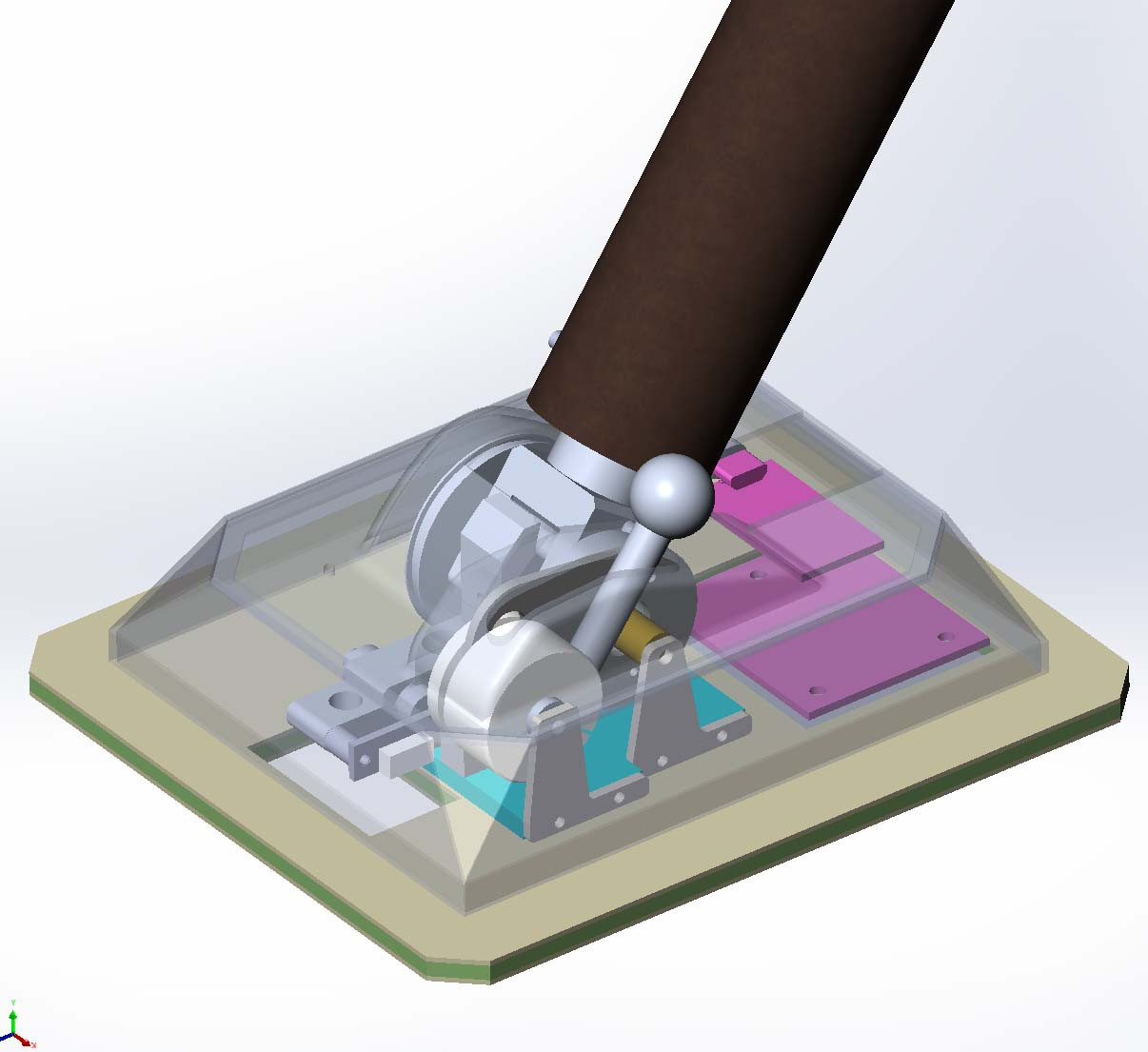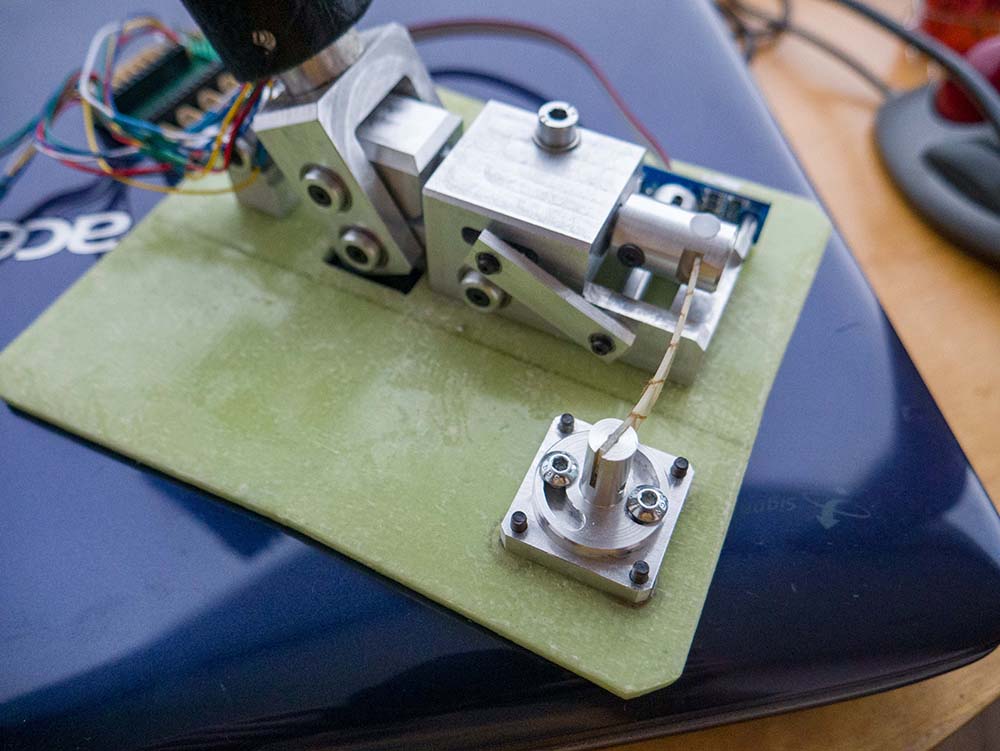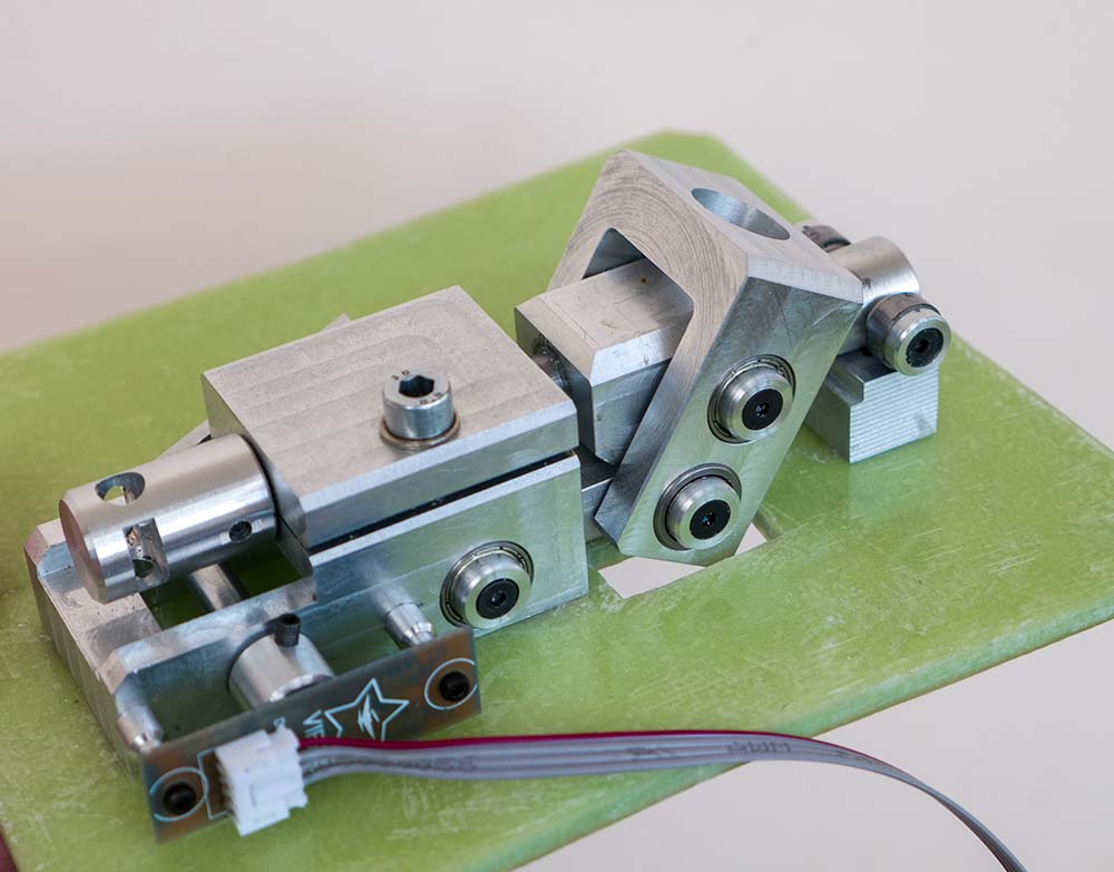 micro-flight Опубликовано: 17 июля 2022 Автор Опубликовано: 17 июля 2022 Вариант выше не очень подходит, неэффективный и сложный. Какое то время вынашивал другой замысел для универсальной оси. Посматривал на заднюю рычажную бабку токарного станка, она прям ну один в один имеет нужную кинематику. И может замертво зажиматься. Заодно догадался, как сделать кинематику узла вместо шкивов. Достаточно сделать одну тягу и получаю те же самые 180° или сколько там потребуется, на датчик. По идее блок должен быть немного жестче текущего, зажимать рычаг можно будет полностью даже при большом плече рычага. За счёт изменения узла редукции датчика, всю механику можно сделать чуть более плоской и компактной.