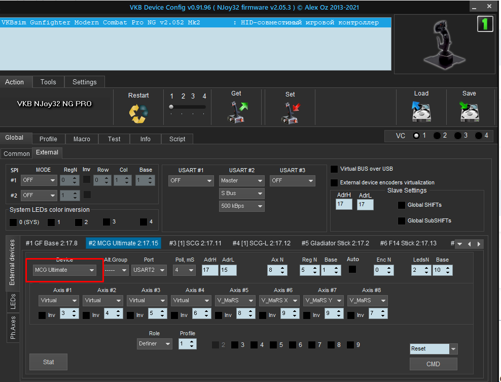 -DED-Ron Опубликовано: 4 июня 2021 Опубликовано: 4 июня 2021 (изменено) 25 минут назад, FrAG_archer сказал: А откуда столько профилей? Это у тебя столько устройств? И что значит "по аналогии добавить №7 в этот стройный ряд настроек с последующим сохранением." Что такое №7? У MCGU другой шинный адрес, количество регистров, раскладка кнопок и свои Leds - естественно при смене MCG контроллер заартачится. Берем прошивку MCGU и делаем скриншоты настроек и потом, зная их, забиваем в пустующее место под #7 в External мультипрошивки. И тогда при смене подхватится ручка, для которой есть такая настройка. Но это никак не отменяет загрузку профиля под конкретную игру и самолет. И это только первая часть марлезонского балета, вторая - правильная организация осей на основном устройстве (Ordinal) и сменных (Definer). Изменено 4 июня 2021 пользователем -DED-Ron 1