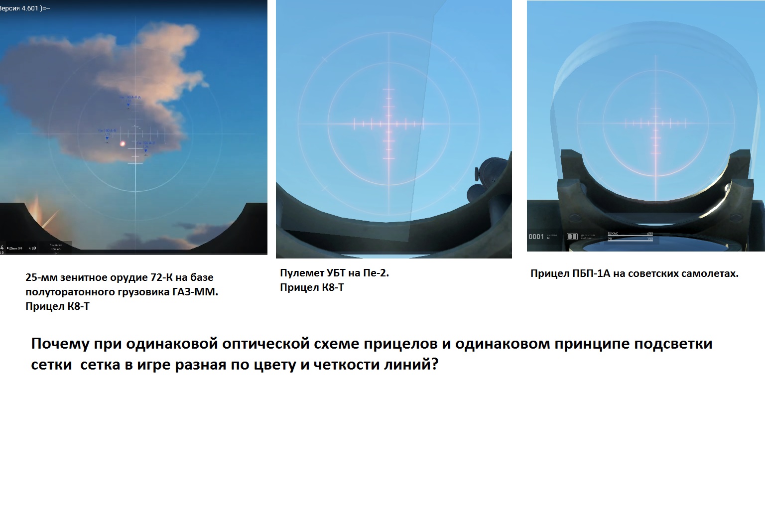 Хотелось бы задать вопрос разработчикам по поводу прицелов. Довольно давно на этом форуме поднималось обсуждение корректности исполнения сеток прицелов советских самолётов. В частности вопросы касались толщины и цвета линий сетки. После выхода управляемой ЗСУ можно обратить внимание на то, что в ЗСУ сетка отображена более корректно, чем в самолётах, при использовании одного и того же типа прицелов. Собственно сам вопрос: когда и стоит ли ожидать исправления сетки прицелов на остальных советских самолётах? Сравнение прилагаю на рисунке:
