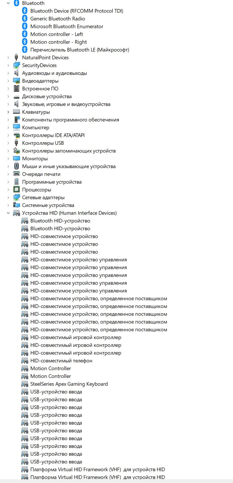 Rouslan Опубликовано: 17 сентября 2021 Автор Опубликовано: 17 сентября 2021 35 минут назад, Harh сказал: Т.е. контроллеры не со шлемом связываются, а с компьютером, получается. Через BT. Да, это понятно. Просто в характеристиках именно Odyssey+ прямо вот фишкой модели указывали наличие встроенного Bluetooth. Я вот на это и налетел сразу, не имея в свое время адаптера. Ибо свято верил, что он есть в шлеме, в смысле пофиг где физически он встроен- что не требуется ничего кроме того, что уже в коробке. Мне кажется что это всё таки был некорректный перевод чего-то типа "подключаемые по BT контроллеры". Что интерпретировали как "наличие BT в шлеме". А у всех остальных, у кого контроллеры работают- а просто либо мышь/клава с BT или ещё что встроенное. Вот даже самому стало интересно. Вот посмотрел на G2. Его контроллер называется тоже Motion Controller. При этом на неподключенном (тут я не вынимал USB, а отключил доп. питание ) шлеме он не появляется в системе. Вкладка Bluetooth в диспетчере устройств не отличается что с включенным шлемом, что с выключенным. При включенном шлеме и с одним контроллером в вкладке HID вылезает контроллер. Причем как можно заметить - вкладка Bluetooth то у нас похожая. У меня Intel Wireless, а у @-DED-Ron -Generic Bluetooth Radio. В обоих двух случаях это контроллеры BT похоже. Видимо как в старом анекдоте: -Доктор у нас кошка беременная, а мы на улицу её не пускаем. -Другие коты есть? -Нет. -Интересно, приеду посмотреть. Приезжает, а в квартире его встречает здоровенный котяра. -А это кто!? -Доктор, как вы могли подумать такое! Это же её брат! Ах да вот, скрин Кстати, а Generic Bluetooth Radio случаем не принадлежит ли Odysse-ю? Если USB вытащить он пропадет?