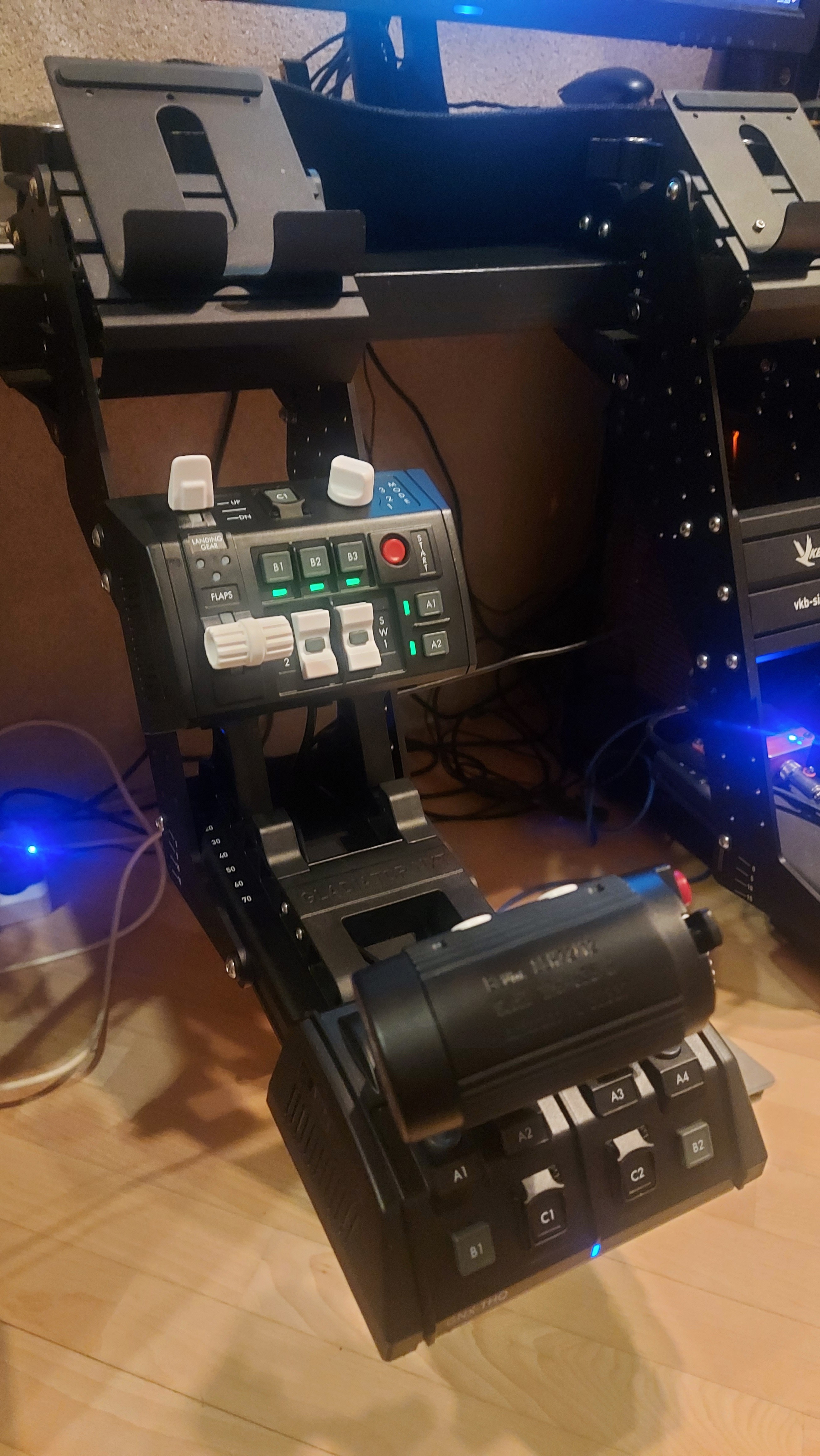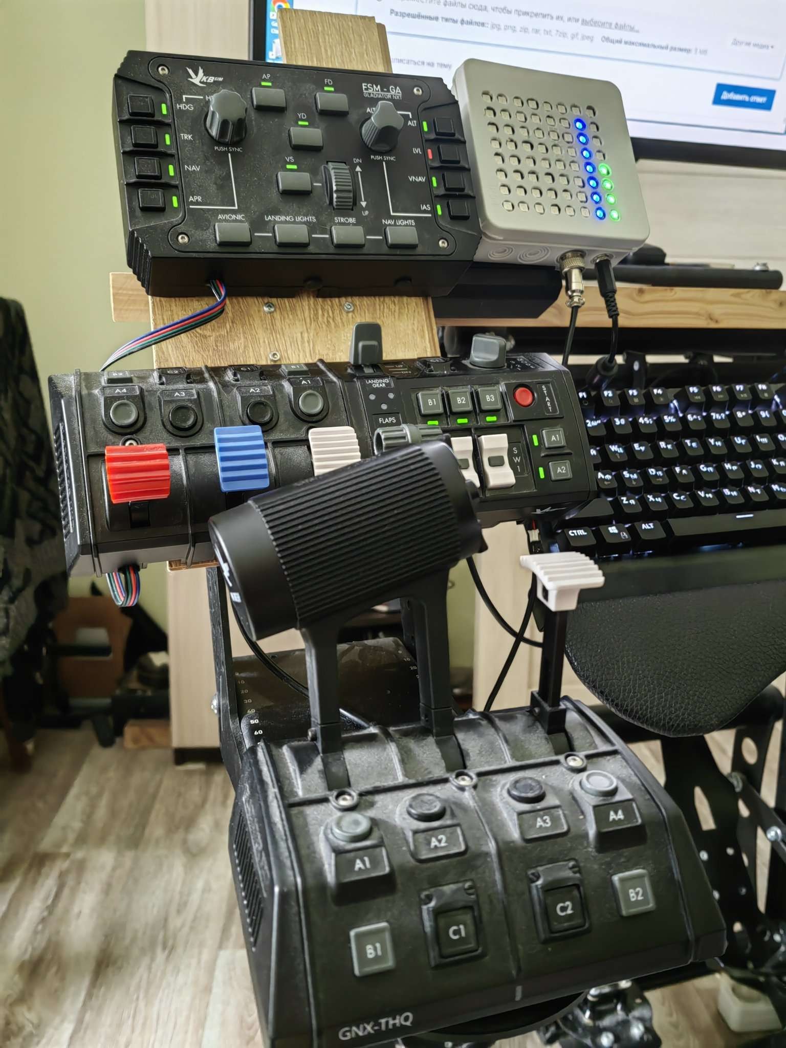 VictorUs Опубликовано: 4 февраля 2024 Опубликовано: 4 февраля 2024 Лучше разнести РУС и все остальное. Более естественное расположение рук. SEM и THQ объединить бок о бок, РУДы поближе, т.е. правее. Либо - тоже очень хороший вариант - на кронштейне. Больше зависит от конфигурации стола. THQ&SEM с одним GNX HID-Main, Гладиатор своим контроллером к USB. Энкодеры FSM в моей конструкцииколхозе для триммирования основных осей. Это уже так, для красоты. Связь по VKB-Link. Скрытый текст 1 1