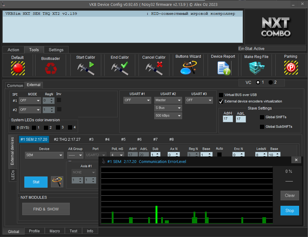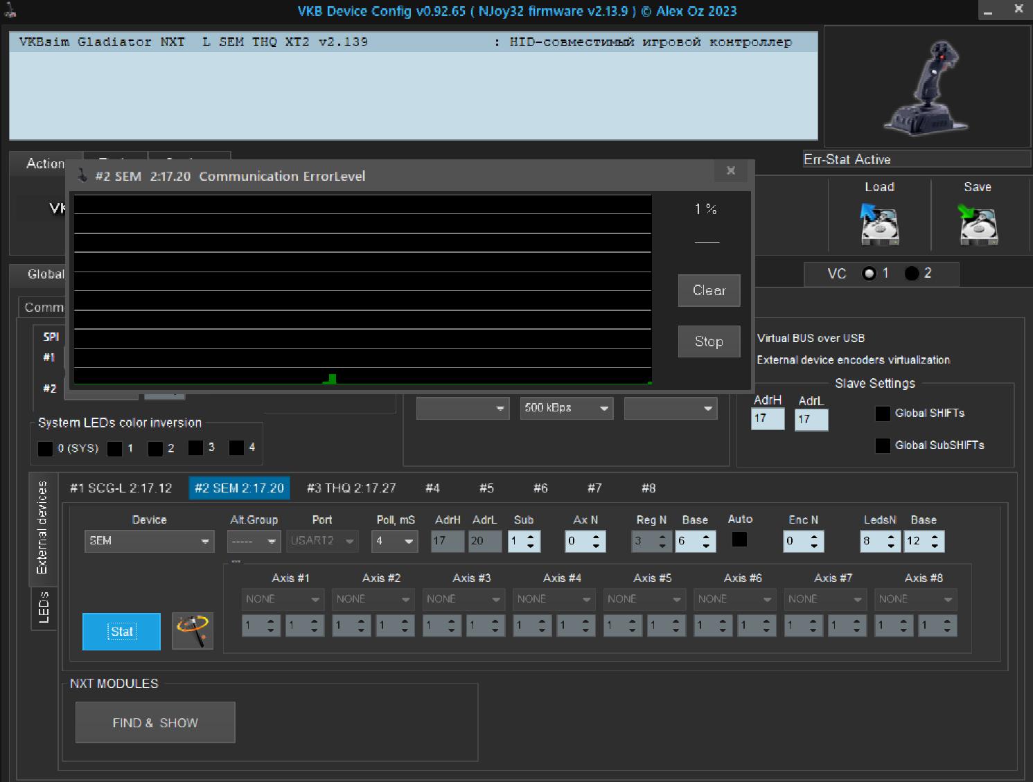 JuiceME Опубликовано: 27 января 2023 Опубликовано: 27 января 2023 Добрый вечер, Собран следующий сетап: "Модуль GNX-THQ" c "Ручка WWII THQ", также в модуль установлен "Контроллер GNX-HID Main", ко всему этому по шине четырёхпроводным кабелем подключен "Модуль GNX SEM". Если посмотреть статистику "Communication ErrorLevel" по модулю GNX-SEM на графике появляются ошибки иногда с пиками до 35%, никакие ручки или кнопки в моменты ошибок не нажимаются, всё в состоянии покоя (скриншот). Пробовал собрать "Модуль GNX SEM" с установленным "Контроллер GNX-HID Main" и подключать уже к нему по шине "Модуль GNX-THQ" c "Ручка WWII THQ" четырёхпроводным кабелем - график не меняется. Если собрать и подключить только "Модуль GNX SEM" с установленным "Контроллер GNX-HID Main", не подключая больше ничего - никаких ошибок на графике нет. На графике модуля GNX-THQ в любой конфигурации ошибок также нет. После сборки любого варианта производился сброс в Default с последующей калибровкой. Подскажите пожалуйста: стоит ли обращать внимание на эти ошибки или их всё пределах допустимого?