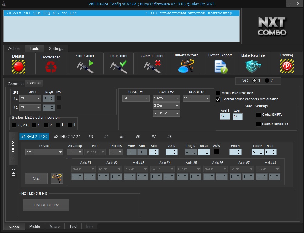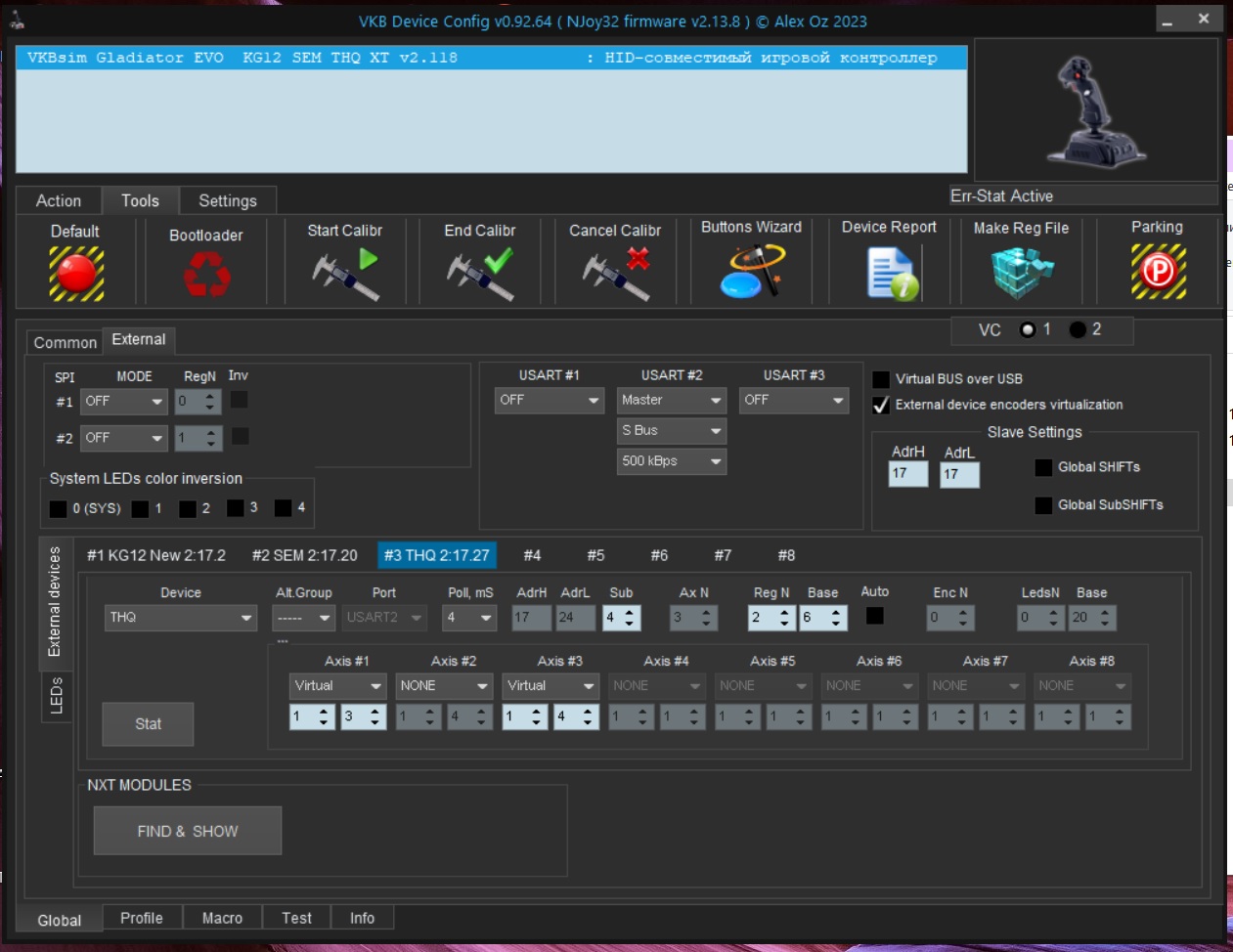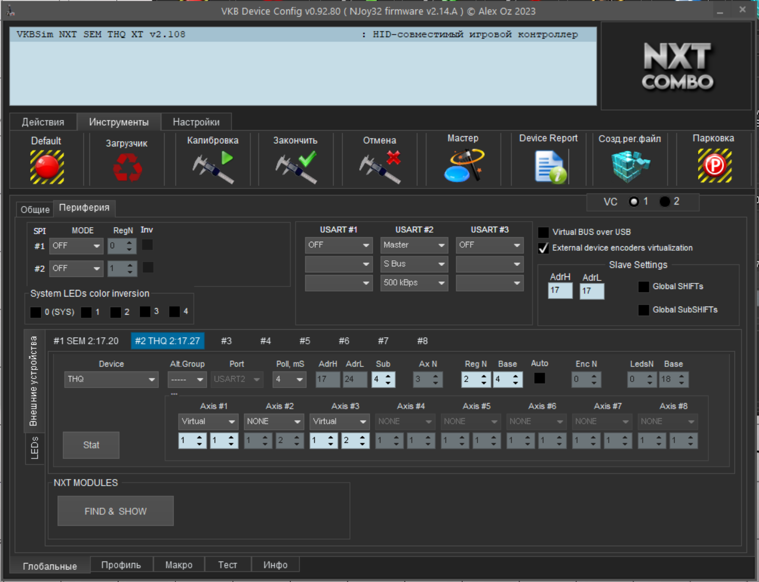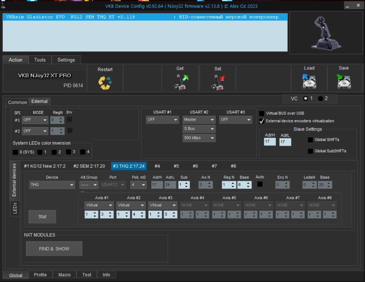 -DED-Ron Опубликовано: 22 мая 2023 Опубликовано: 22 мая 2023 У вас два модуля - SEM, THQ (ручка не в счет), которые подключаются к системнику именно посредством HID контроллера. Поэтому для него и нужно выбирать прошивку. Если бы модули были подключены к джойстику GNX (EVO), то прошивку нужно было бы выбирать именно для джойстика. А модули потом сконфигурировать кнопкой Find&AutoConfig. Замечу, что в самой верхней строке конфигуратора (шапке), в скобках, указана рекомендуемая версия прошивки именно для этой версии конфигуратора. Использовать прошивку выше номером - можно, ниже - нет. Соблюдайте это правило, чтобы не возникало вопросов - а почему не работают объявленные фичи?