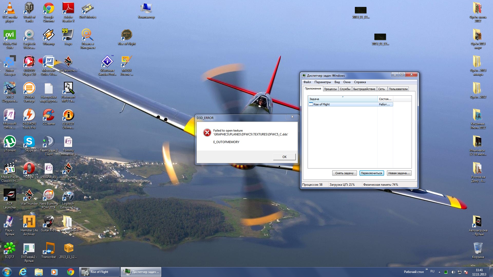 ARTUR Опубликовано: 12 ноября 2013 Опубликовано: 12 ноября 2013 (изменено) Не знаю почему , но из игры скрины не делает. А скрин настроек в игре пишет , что файл слишком большой и не проходит на форум.. Шаманю... Ошибки одни и те же , в основном, но на разные файлы. Заметил , что часто ругается на скины самолётов , но скины разные. Недавно заметил ещё одну ошибку (емнип D3D) . Только что пытался летать . Взлетел нормально , потом тормоза , потом вместо самолей только винты летят , а в моём внутренности видны... Изменено 12 ноября 2013 пользователем ARTUR