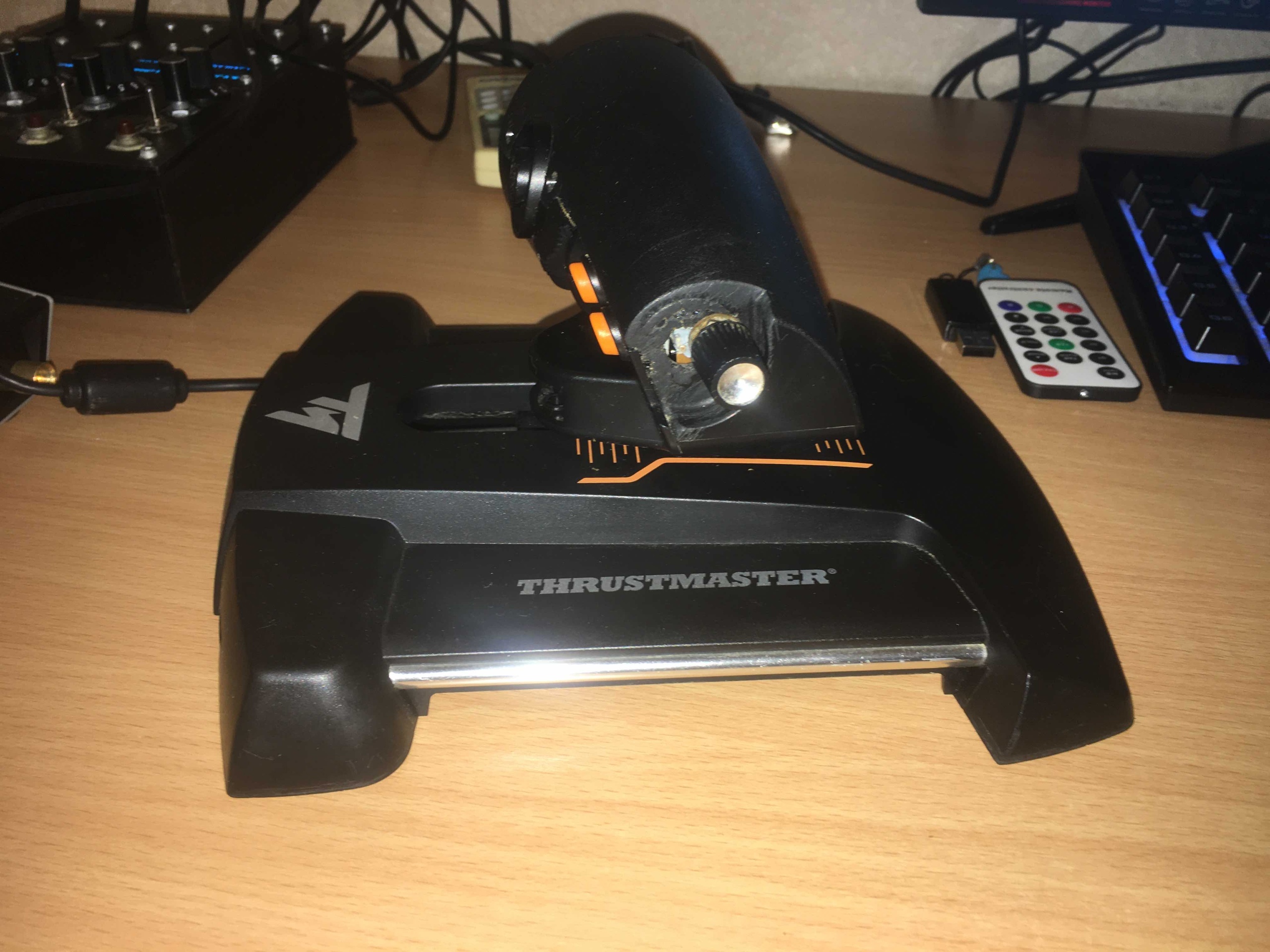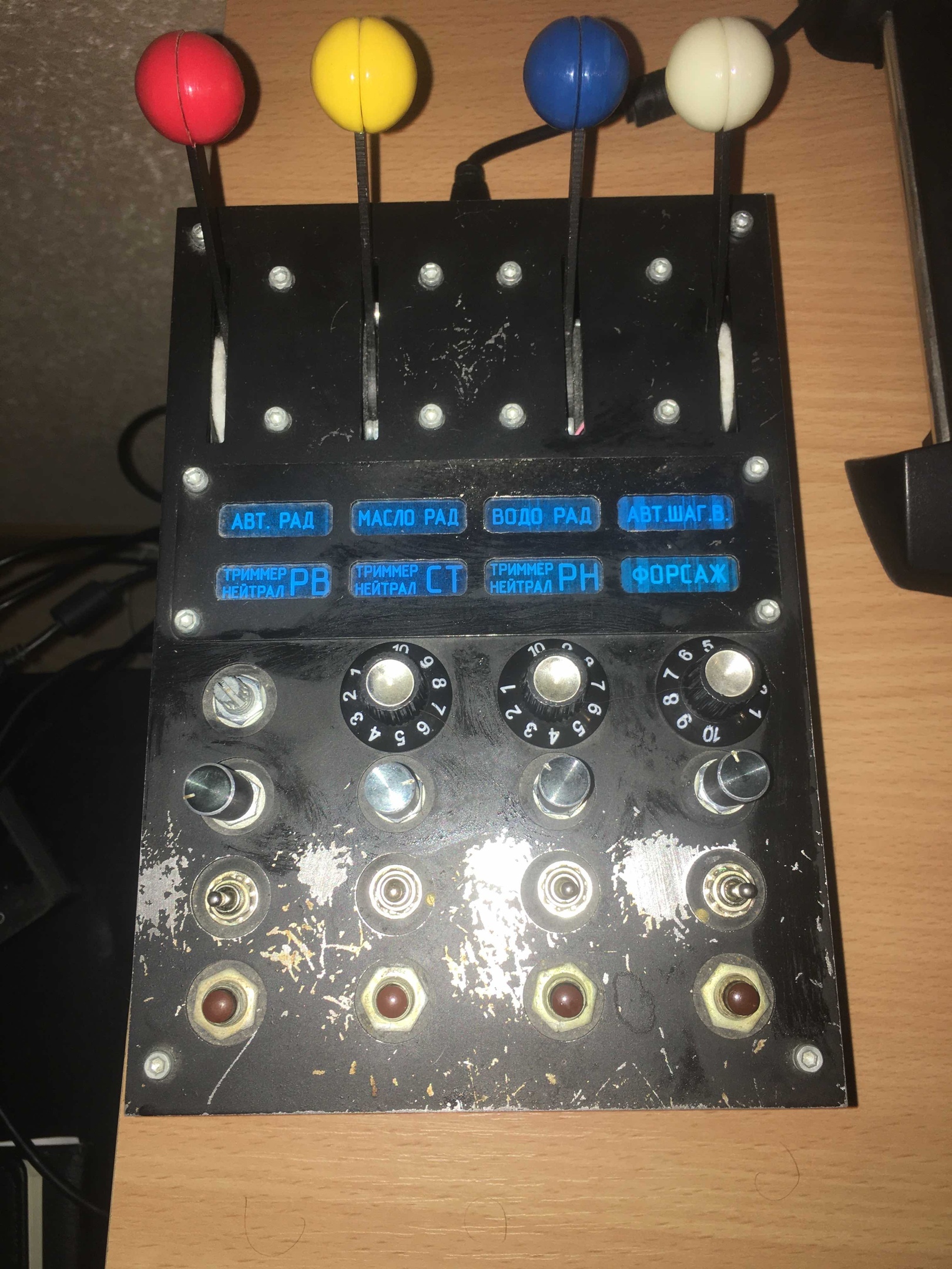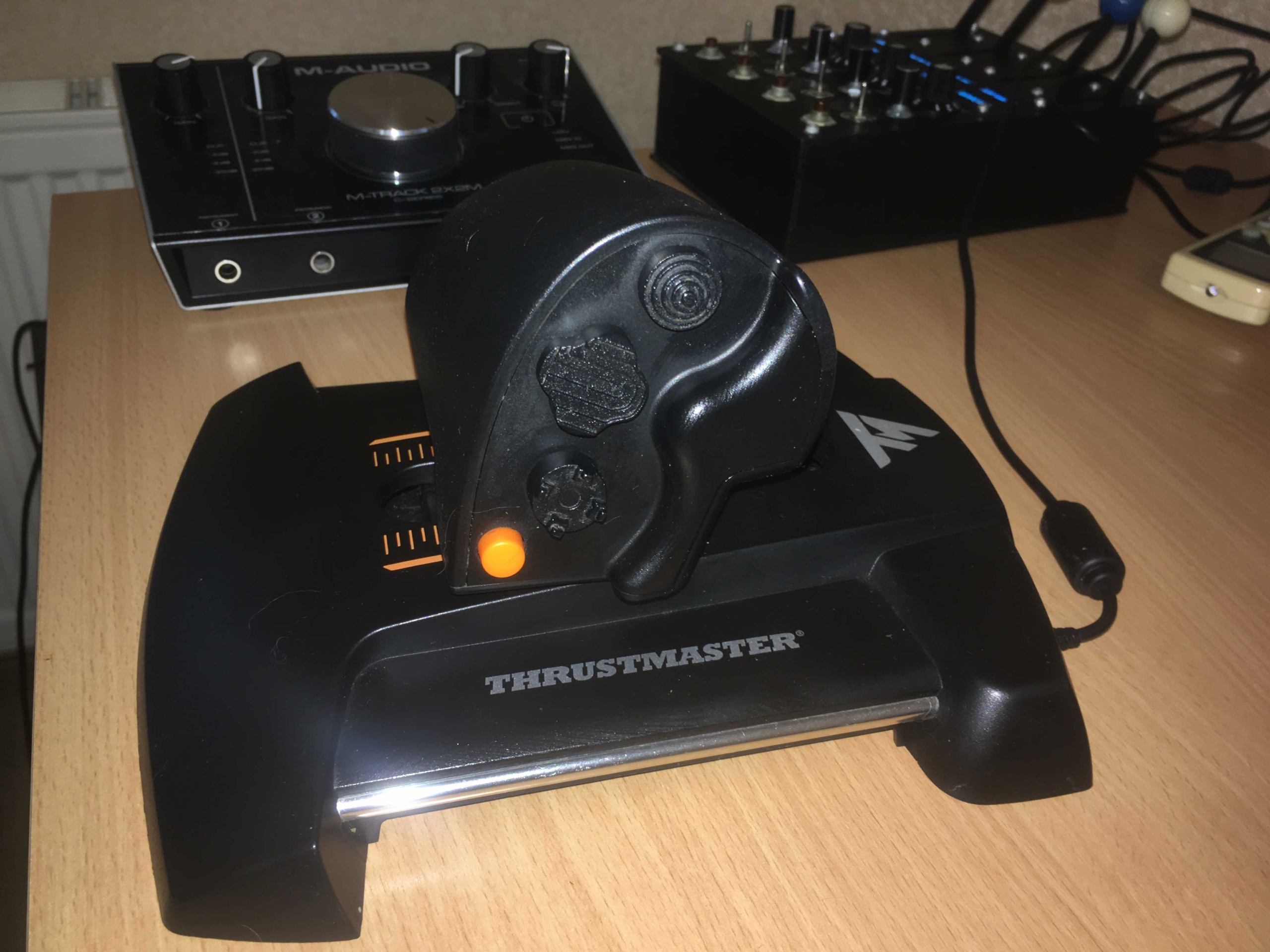 K_R_i_t Опубликовано: 24 сентября 2022 Опубликовано: 24 сентября 2022 Доброго времени суток, уважаемые вирпилы! Предлагаю вашему вниманию следующий комплект железяк: РУС: VKB Gunfighter 3 с ручкой Kosmosima Premium (с твистом, который можно заблокировать) с набором сменных кнопочек, пружинок, кулачков и инструментов. К сожалению коробка осталась в другом городе, но по договорённости могу дослать позже, когда появится возможность съездить туда. Джой в отличном состоянии, все оси и кнопки работают, пружины установлены средней жёсткости, при желании поменять на любые другие дело пяти минут. За джой прошу 22 000. (пружинок и кулачков на фото нет, они в другой квартире, на днях заберу) Дополнительная панель управления от товарища vumpel18 с восьмью осями (4 рычага, 4 крутилки), 4 двухпозиционных нефиксируемых тумблера, четыре кнопки. В комплекте есть программа для настройки. Все оси и кнопки работают превосходно, по большей части панель не использовалась, брал для ил-2, но позже с головой ушёл в ДКС, а там таких осей практически не требуется. Шляпки на одном потенциометре нет, он рабочий, всё в порядке, я его переставил на ручку громкости на электрогитаре, которая треснула ) Сама по себе шляпка копеечная, но мне было некогда за ней ездить, а потом и вовсе как-то забил. Также облезла краска в местах соприкосновения с пальцами. Может быть я какой-то рептилоид с кислотой вместо кожного жира, но мне все-таки кажется, что изначально она покрашена далеко не лучшей краской. В любом случае, снять щиток и перекрасить не проблема. Во всём остальном панелька хороша. 10 000 руб. Ну и напоследок РУД Thrustmaster. Работает всё кроме качельки на задней части, она была очень неудобной и я её снял, также заколхожен резистор сбоку. Изначально там стояло пластиковое колёсико с говняным пластиковым резюком, который сдох через полгода использования, посему в полевых условиях пьяным техником за бутылку беленькой, пациенту был имплантирован нормальный полноразмерный резистор с ближайшего радиорынка, внешний вид при этом пострадал, но функциональность осталась прежней и даже улучшилась, поскольку благодаря удлинённой крутилке мизинец теперь не соскальзывает с оси, а удобно на неё ложится. Фиг его знает, сколько за него просить, пусть будет 3 000 руб. С ценообразованием на железо знаком крайне смутно, поэтому, если кому-то кажется, что что-то завышено - можем обоснованно поторговаться. С продажей особо не тороплюсь. 1