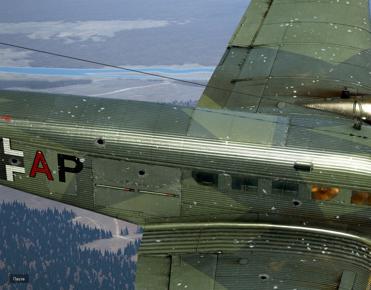 - ДИН. ПОВРЕЖДЕНИЯ: В оффлайне здесь всё круто, правда иногда текстура дыры от повреждения (особенно большие от 20мм пушек) не совсем удачно натягиваются на стык крыла и фюзеляжа, и выглядит просто как текстура дыры, натянутая на никак не изменившуюся геометрию самолёта)). Но на самом деле это не так страшно, понятно, что идеальную систему повреждений с динамическим изменение геометрии по всему самолёту сделать очень сложно. Всё равно сейчас намного лучше, чем просто заранее нарисованное состояние повреждения.