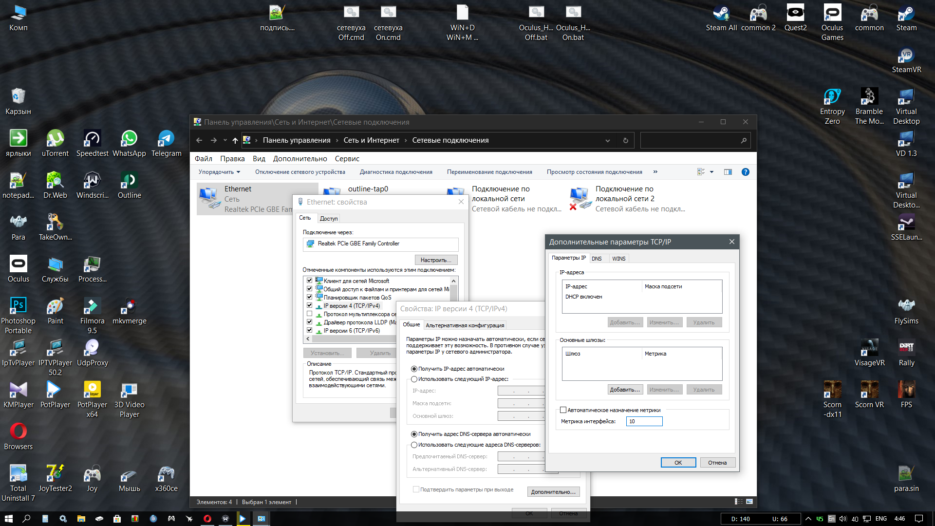 huligan Опубликовано: 26 декабря 2022 Опубликовано: 26 декабря 2022 (изменено) 3 часа назад, Bubi сказал: Как заставить работать через провод? ну для начала скачать 1.25.10 апкашку и ехешник и установить https://4pda.to/forum/index.php?showtopic=1056498&st=1400#entry118755132 запустить 1-й раз без патча с ехе и законнектится к стриммеру на ПК,потом подменить патч А теперь уже плясать с бубном для запуска VD по юсб(для начала в настройках шлема включить юсб модем в системных настройках,в которые войти можно через сеттингс апка или пи лаунчер) и курить эти темы https://www.reddit.com/r/virtualreality/comments/ybjpke/pico_4_vs_hp_g2_useful_pico_4_pcvr_tips_and_tricks/ https://www.reddit.com/r/virtualreality/comments/yfrisz/pico_4_pcvr_tips_how_to_make_the_pico_streaming/ заметить драйвер в винде+для именно него(у меня на скрине просто схема) выставить 10 и снять галку с ПК по adb запустить команду Цитата adb shell am start -n com.android.settings/.TetherSettings && adb shell input keyevent 20 && adb shell input keyevent 20 && adb shell input keyevent KEYCODE_ENTER && sleep 2 && adb shell input keyevent 4 альтернативный команд(хз,пишут,что работает на 4пда) Цитата @echo off SET LAN_Name=Ethernet SET PATH_ADB=C:\adb echo Disabling Ethernet adapter... netsh interface set interface %LAN_Name% disable TIMEOUT 5 echo Enabling USB Tether... %PATH_ADB%\adb shell svc usb setFunctions rndis TIMEOUT 5 echo Starting Virtual Desktop Streamer... start "" /B "C:\Program Files\Virtual Desktop Streamer\VirtualDesktop.Streamer.exe" echo Enabling Ethernet adapter... netsh interface set interface "Ethernet" enable echo Press any key when done to disable USB tether and exit... pause taskkill /F /IM VirtualDesktop.Streamer.exe /T adb shell svc usb setFunctions И есть ещё вариант через gnirehtet вообще без вайфая https://www.reddit.com/r/OculusQuest/comments/nxe88k/virtual_desktop_working_over_usb/ у меня работает,перед употреблением сделать ресет ПК,чтобы разрывов связи не было или сброс туннеля моя рабочая прога(апк в шлем установить) https://drive.google.com/file/d/1aoPkAtOms6YDWAw-QwoBaQHpPvQw9GOt/view?usp=share_link моя рабочая папка со всем барахлом https://drive.google.com/drive/folders/1CZNnMDmHZ0bHcDP2adHv-9pRyINv1bSa?usp=share_link Изменено 26 декабря 2022 пользователем huligan 2