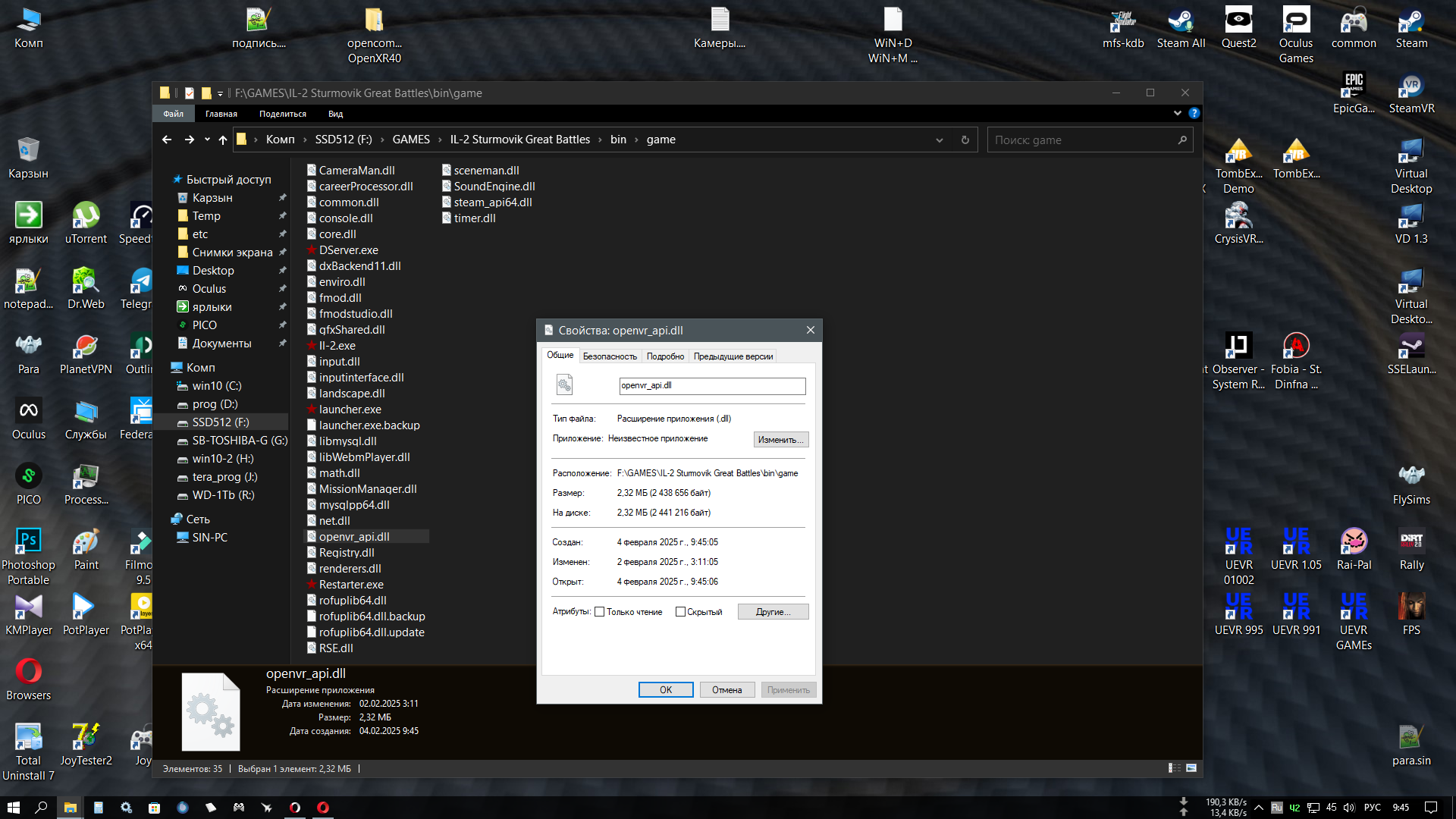 huligan Опубликовано: 4 февраля Опубликовано: 4 февраля (изменено) 16 часов назад, ROSS_Papa_JA2 сказал: обновления антивируса виндовского!! ты что,ещё не отключил его? эта и ниже вот хз,что там у тя не даёт VD в OpenXR работать.Запусти любую другую игру с ПК на OpenXR и проверь,что она работает в VD и без стимВР,например любую анрил игру с UEVR ну и покажи,что у тя в папке ...\IL-2 Sturmovik Great Battles\bin\game\ и на дллку наведи вот так во время загрузки ила вот такая картинка в шлеме дрова не имеют значения,у меня 572.16 имеет значение только правильно подмененная дллка и надетый шлем и в VD ты через него видишь раб.стол ...может у тя VD поломался? Проверь VDXR в других играх.можно в мфс2020,мфс2024,ДКС... тут что кажет? OpenXR-Runtime-xrpicker-gui-2.2.1.rar а тут что? OpenXR-API-Layers-GUI.rar 22 часа назад, ROSS_Papa_JA2 сказал: Удалось запустить ила в шлеме через ВД только по стимВР а с каким рантаймом? На OpenXR или на OpenVR ? Попробуй с подмененной дллкой в иле в VD выставить SteamVR и запустить ила,предварительно запустив стимВР Изменено 4 февраля пользователем huligan 1