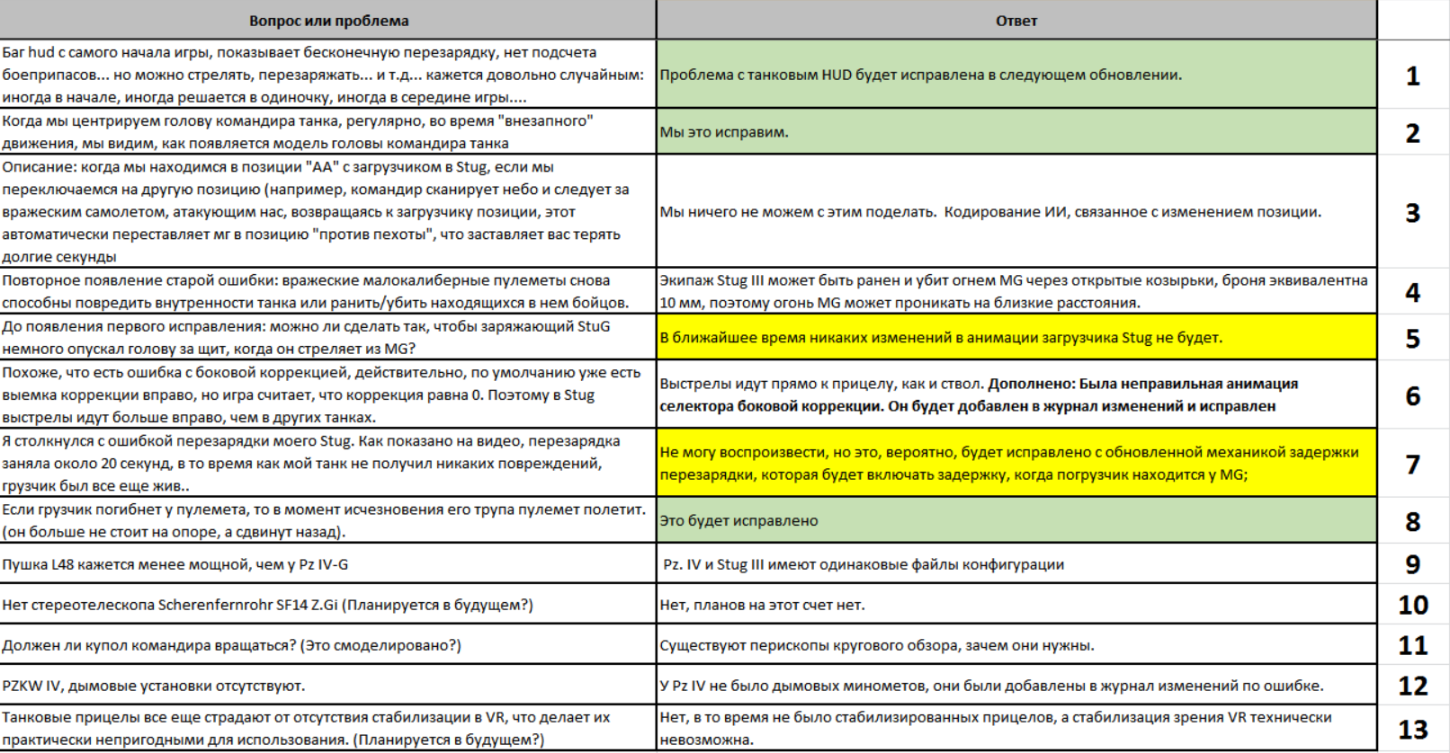 [SN]_Reaper_ Опубликовано: 7 декабря 2022 Опубликовано: 7 декабря 2022 (изменено) На com-форуме выложили табличку с ответами разработчиков относительно некоторых технических проблем Штуга. Я прогнал её через переводчик (без редактуры), пронумеровал для удобства пункты и выкладываю здесь для ознакомления Зелёный цвет – то, что будет исправлено в ближайшее время Жёлтый – может быть быть исправлено (либо нет) в будущем Белый – останется как есть: либо исправления не нужны – УНВП, либо – БЖСЭ (будем жить с этим). Мои комментарии по пунктам 10, 11 и 7. Касаемо стереотрубы и вращения комбашенки. ОК, решили не заморачиваться и не делать по тем или иным причинам. Конечно, хочется максимального соответствия модели и прототипа, вместе с тем, если приходится идти на определённые упрощения, желательно информировать об этом ещё на этапе дневников, чтобы предупредить "неудобные" вопросы в дальнейшем. Ну и, поскольку пдф-руководство пользователя у нас отсутствует, ничто не мешало в примечаниях к боевому посту указать как это было сделано на реальной машине и просто пояснить сноской или далее по тексту, что в игре такой-то функционал не реализован. А ведь люди, изучающие технику по игре, действительно будут думать, что вон тот маленький лючок в комбашенке исключительно для ракетницы. "StuG III Ausf.G также оборудован лючком для стрельбы из ракетницы при закрытых люках" – так в данный момент. Как могло бы быть. StuG III Ausf.G также оборудован лючком для вывода стереотрубы SF14Z для наблюдения за полем боя при закрытых люках. В игре стереотруба не реализована, поэтому данный лючок используется для стрельбы из ракетницы. Или же по вращению комбашенки. Командирская башенка оборудована перископическими смотровыми устройствами кругового обзора. Кроме того, она могла вращаться (в игре данная особенность не предусмотрена). Ладно, с этим понятно, идём дальше. По пункту 7 хотелось бы большей конкретики. На западном форуме отметили момент с неизменной скоростью перезарядки, когда заряжающий стреляет из пулемёта. https://forum.il2sturmovik.com/topic/81503-game-version-5003-discussion-c-47a-stug-iii-western-front-spring-1918/?do=findComment&comment=1234134 и в одном случае была слишком долгая перезарядка, видимо Штуг решил скосплеить СУ-152. Из ответа разработчиков следует, что возможно будет увеличено время перезарядки, когда заряжающий находится за пулемётом. И при этом никто не задался вопросом почему вообще происходит заряжание пушки в тот момент, когда сам заряжающий стоит в открытом люке? "А что будет, если мы здесь вот откроем люк. Он будет заряжать там?" ©️ Оказывается будет. Мало того он одновременно и из пулемёта может строчить, а снаряды при этом сами собой в пушку запрыгивают. Не иначе как автомат заряжания в Штуге появился https://youtu.be/a5AyLiTxpo4?t=5520 https://www.youtube.com/watch?v=a5AyLiTxpo4 тайминг 1:32:00, если по первой ссылке не сработает. Спасибо BarSS за обзор. Справедливости ради, в ролике это происходит при включённом автопилоте, но пользователи пишут, что и без автопилота такая же фигня. Рассмотрим три ситуации: и командир, и заряжающий находятся на своих местах внутри самоходки командир внутри, заряжающий стоит в люке оба: командир и заряжающий стоят в открытых люках В последнем случае абсолютно некому подавать и заряжать снаряды в пушку, но пушка при этом стреляет, что мы и видим в ролике. В первом случае, командир достаёт снаряды из задней укладки, которая распо