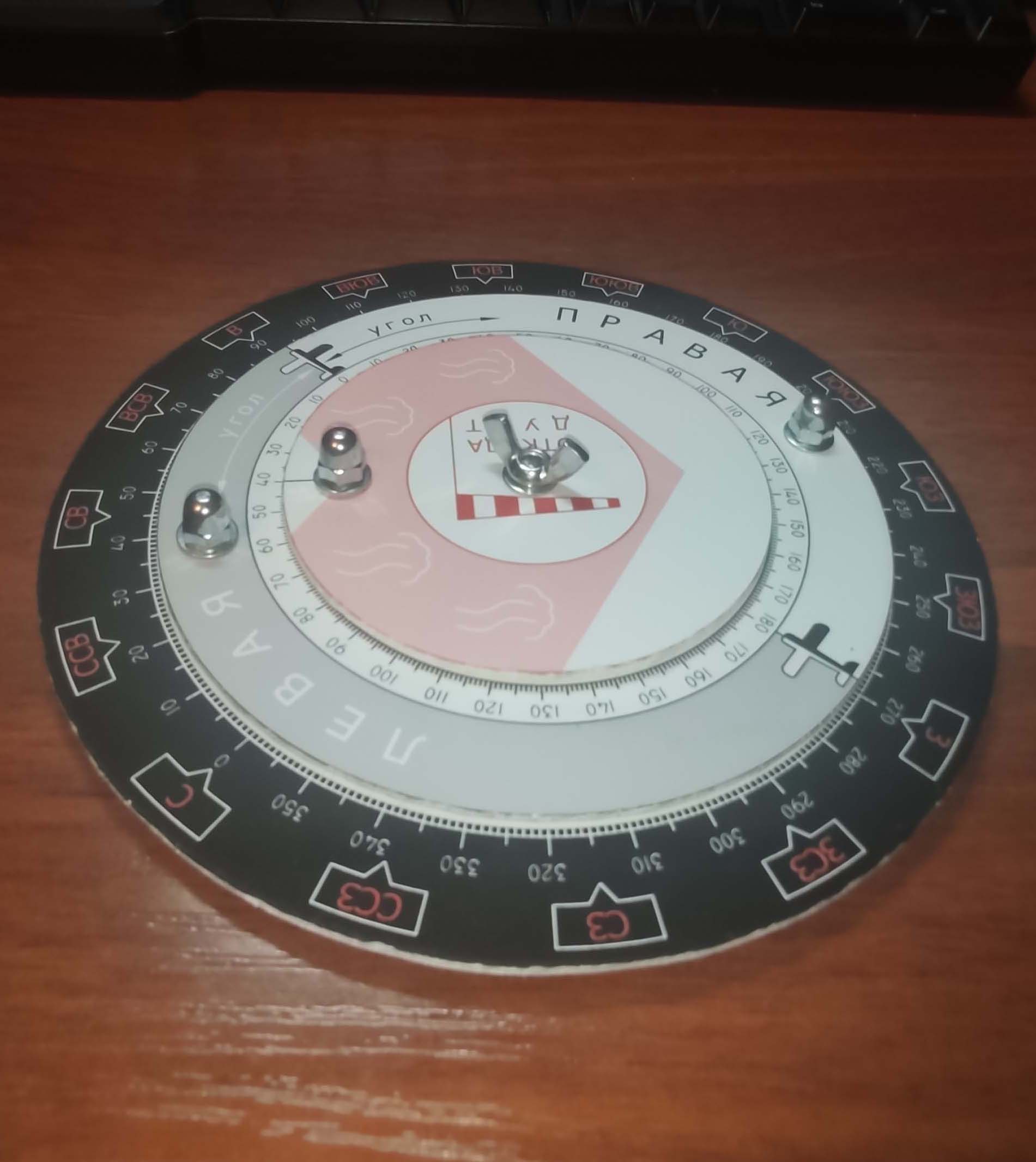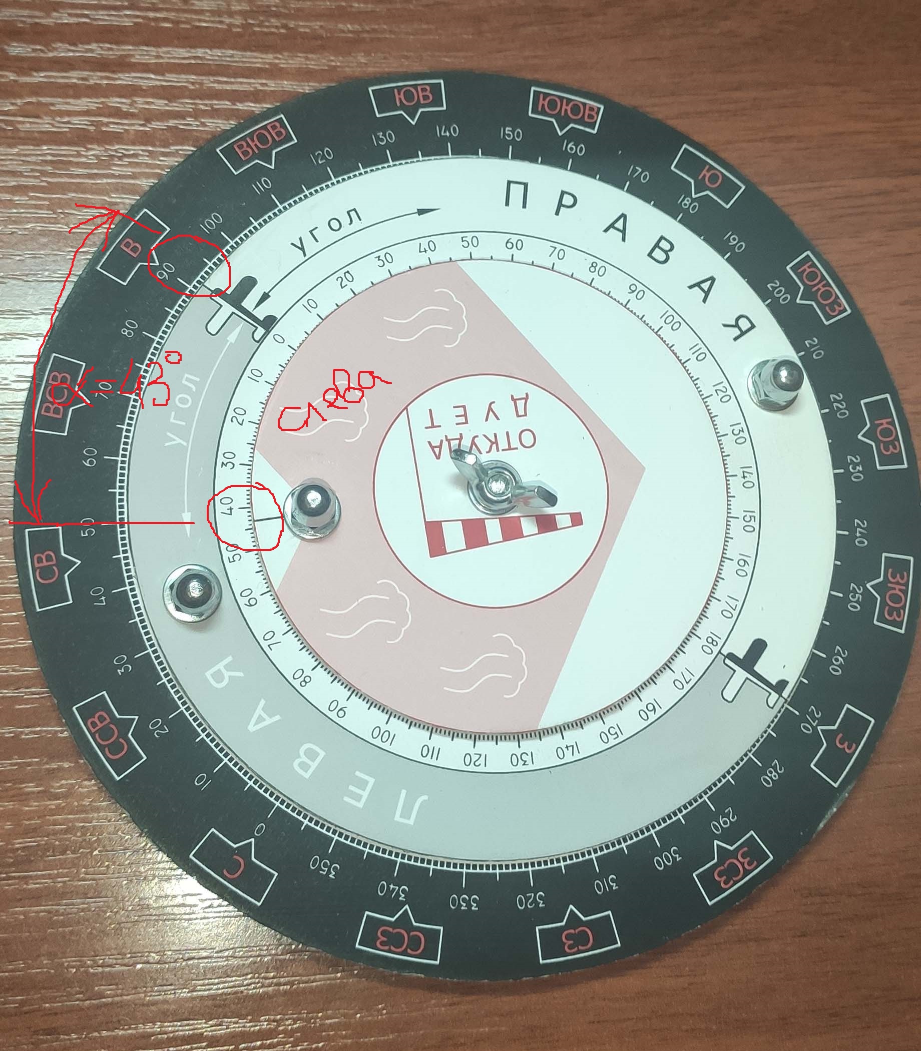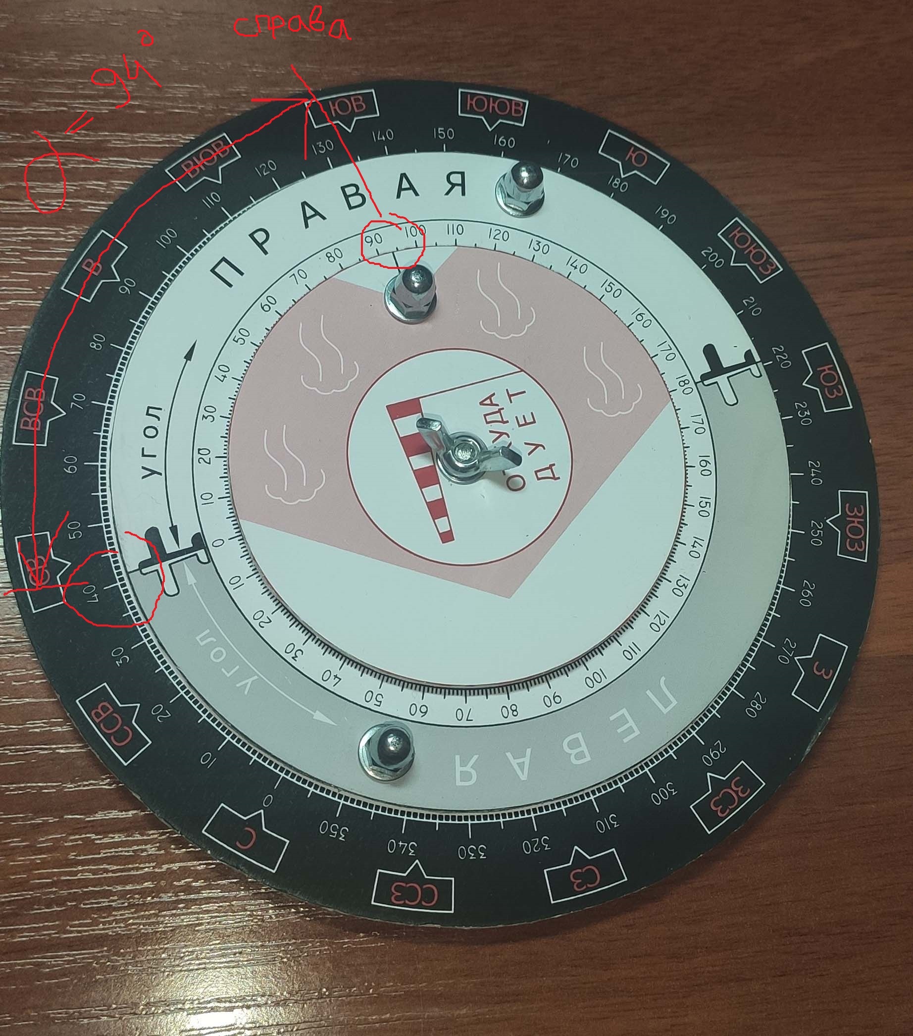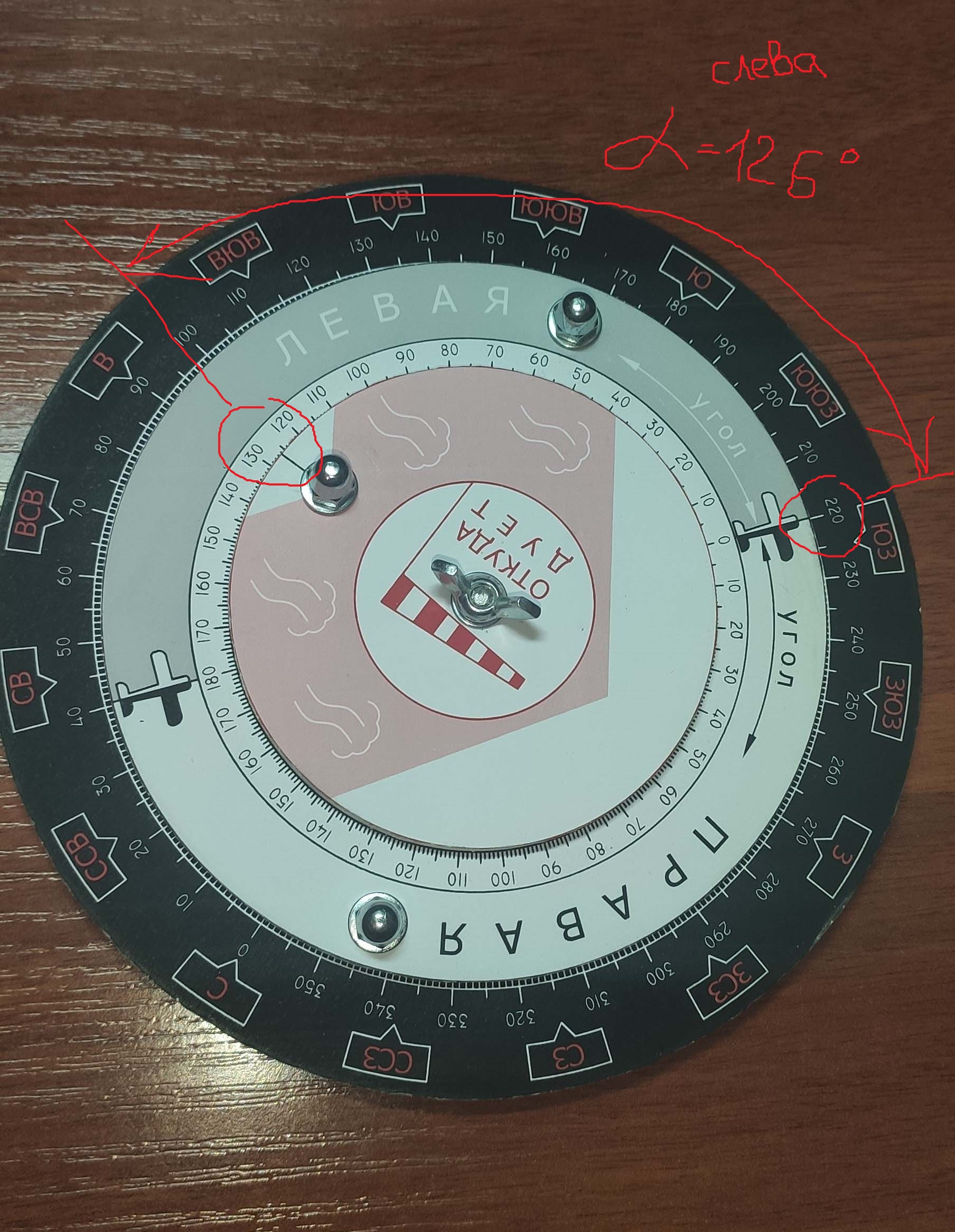 Ebot Опубликовано: 20 февраля 2023 Автор Опубликовано: 20 февраля 2023 (изменено) По случаю, сделал себе калькулятор для вычисления угла ветра Состоит из 3-х дисков, на каждом из которых есть соответствующие шкалы. Выставляя известные параметры в нужное положение можно увидеть угол под которым ветер дует на самолет. Пример 1 Курс полета самолета: 41° Ветер : ЮГО- ВОСТОЧНЫЙ (пишут в брифинге) Выставляем курс самолета 41° (по внешней шкале большого диска) Выставляем верхний диск в положение "ЮВ" ( по внешней шкала большого диска) И смотрим какой угол (внутренняя шкала среднего диска) соответствует риске на вернем диске. Видим искомое значение ветра = 94° Смотрим сторону - сторона правая Пример 2 Курс полета самолета: 220° Ветер : ВОСТОЧНЫЙ (пишут в брифинге) Выставляем курс самолета 220° (по внешней шкале большого диска) Выставляем верхний диск в положение "В" ( по внешней шкала большого диска) И смотрим какой угол (внутренняя шкала среднего диска) соответствует риске на вернем диске. Видим искомое значение ветра = 126° Смотрим сторону - сторона левая Пример 3 Курс полета самолета: 91° Ветер :СЕВЕРО - ВОСТОЧНЫЙ (пишут в брифинге) Выставляем курс самолета 91° (по внешней шкале большого диска) Выставляем верхний диск в положение "СВ" ( по внешней шкала большого диска) И смотрим какой угол (внутренняя шкала среднего диска) соответствует риске на вернем диске. Видим искомое значение ветра = 43° Смотрим сторону - сторона левая Если что, файл дисков во вложении Я себе сделал так. Распечатал на самоклеющейся бумаге (такая продается для принтеров А4 ) и наклеил на лист пластика . Отрезал ножницами и соединил болтиком по середине. Чтоб диски могли прокручиваться. Ну и для удобства вращения - ручки в виде гаек. Изменено 20 февраля 2023 пользователем Ebot 1 2 2