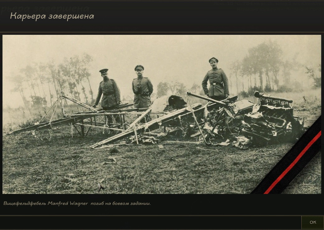 Ebot Опубликовано: 9 января Автор Опубликовано: 9 января 210 дней Карьера летчика истребителя Manfred'а Wagner'а ( Эскадрилья Jasta 2 ) "Роковой вылет ..." 16 -ый боевой вылет для Manfred'а Wagner'а оказался последним. Запись из рапорта: 29 Марта 1917 Во время воздушного боя столкнулся с вражеским истребителем. Планер получил критические повреждения и рухнул на землю. Пилот погиб Пилот прослужил : 20 дня Потеряно пилотов в карьере: 4 Хронология рокового вылета : Задача - Вылет на сопровождение Взлетаем А вот и наши разведчики по прозвищу - "Хрен догонишь" Нарисовался противник Атакуем в лоб, на проходе! ... Разворот... и ! Одна ошибка - и ты ошибся! Финальный аккорд по вражеским позициям и одно поле на двоих для Manfred'а Wagner'а