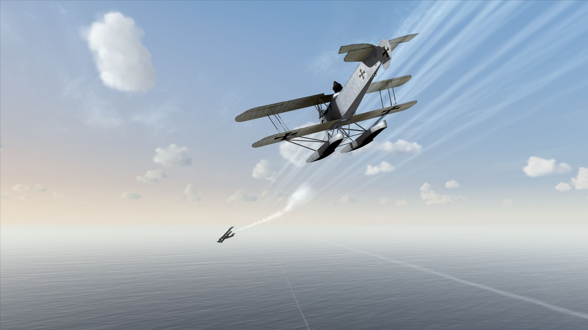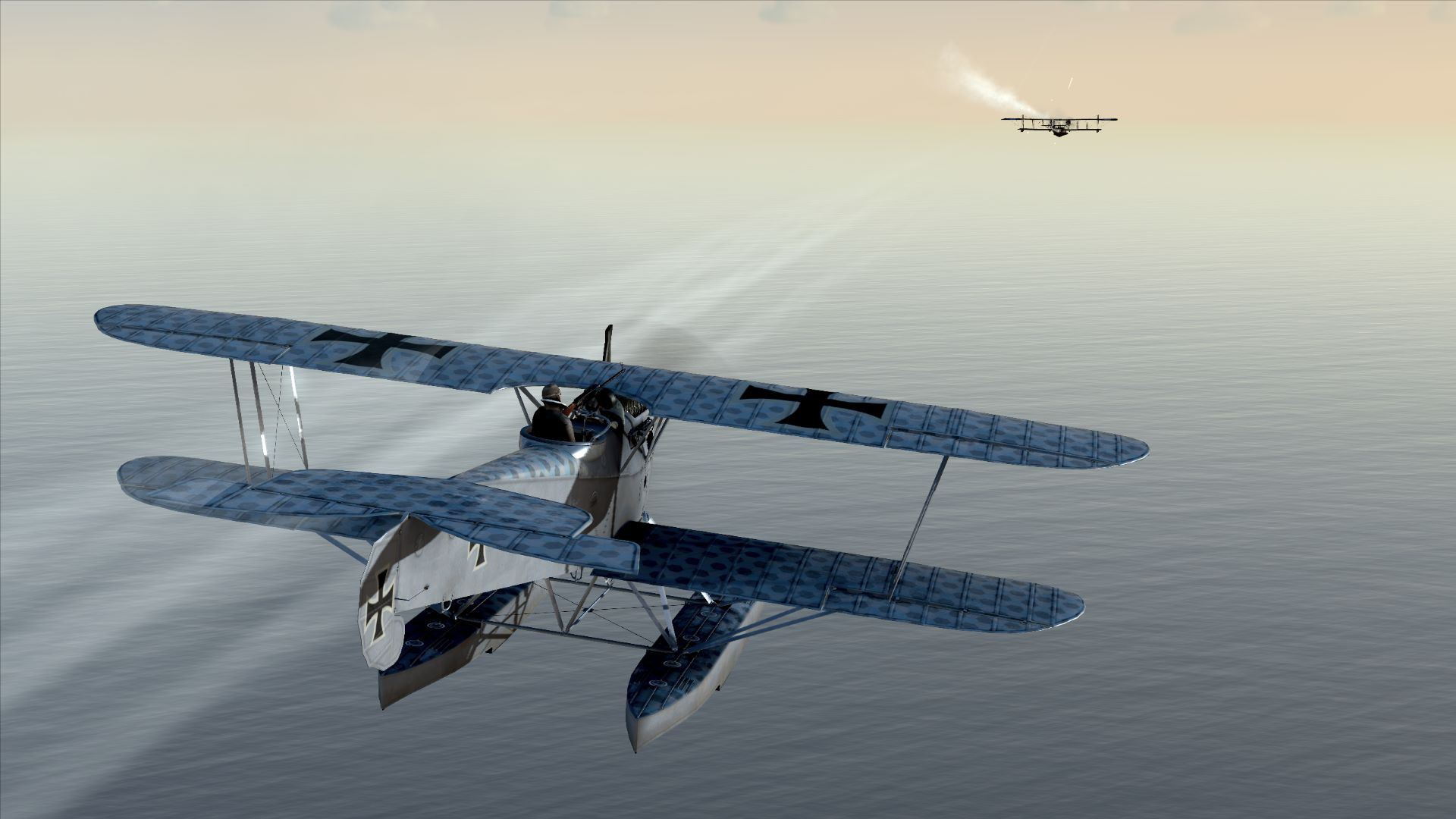 Ebot Опубликовано: 28 января Автор Опубликовано: 28 января (изменено) Карьера морского летчика истребителя Фридриха Вебера. (Эскадрилья: Seeflugstation Flandern II) Место действия - Ла-Манш 13 день 4 - боевой вылет (Патрулирование береговой линии) "Первое боевое ранение" Запись из рапорта: 13 Сентября 1917 Во время воздушного боя получил повреждение двигателя , что привело к резкой потери его мощности, и как следствие невозможности продолжать полет. В добавок, при выходе из боя попал под огонь вражеского бортового стрелка в результате чего и пилот был ранен. Но несмотря на все, лётчику удалось благополучно посадить самолет на воду , в 15 км от берега. Однако в следствии полученных в бою пробоин в правом поплавке, самолет стало затапливать, что вынудило экипаж покинуть воздушное судно. Через 1,5 минуты самолет полностью затонул. Благодаря усилиям бортового стрелка, раненому пилоту удалось выжить , оставаясь на плаву до прихода спасательной бригады. В этом боевом вылете экипаж уничтожил две вражеские летающие лодки. В строю: 13 дней Хронология вылета: Команда на взлет Взлетаем Группа в сборе . Следуем по маршруту согласно полётного задания. Внезапно , замечаю в дали силуэт противника. Летающая лодка!!! До этого я видел ее лишь на фотографиях. При этом остальные участники группы даже не посмотрели в строну появившегося противника и продолжили полет по маршруту. Что ж! действуем в одиночку. Начинаю перехват. Достигнув цели открываю огонь ... Противник огрызется . Но я повторяю атаку снова... и снова ! И вот, после непродолжительного боя - вражеская лодка, уже изрядно потрепанная, вынужденно разрезает водную гладь В полученные пробоины неумолимо поступает вода... Я тем временем , истратив весь боезапас , возвращаюсь в строй Спустя некоторое время, уже на обратном курсе , в небе появляется еще одна летающая лодка. Поскольку патронов у меня нет. Первое время наблюдаю. что будет делать группа . И быстро понимаю что группа будет делать ... и ограничится лишь предупредительным выстрелами Такой расклад меня не устраивает. И я даю знак бортовому стрелку о том, что пришло его время! И начинаю преследование Нагнав неприятеля , бортовой стрелок, который сразу все понял, начинает палить на все деньги ! Через несколько очередей, у вражеской летающей лодки загорается двигатель! Не успев порадоваться очередной победе! Вдруг двигатель собственного самолета, внезапно теряет обороты ... Похоже в какой то момент словил таки пулю. Выхожу из атаки И в этот момент получаю смачную очередь прямо в правый борт. Стрелок лодки тоже оказался не промах. В глазах потемнело и покраснело! Но контроль не потерян. Иду на вынужденную. Лодка тем временем тоже отдельными частями пошла на снижение Готовлюсь к посадке. Один из поплавков имеет пробоину. Но я об этом еще не знаю. Не смотря на ранение , проблем с посадкой не возникло Проблемы возникли после Через 1,5 минуты самолет затонул (примерно в 15 км о берега) Благо мы со стрелком успели выбраться , в первую очередь благодаря ему. На наше счастье неподалёку проплывало дружественное гражданское судно , которое наблюдало наш бой. Оно нас и подобрало на борт. Изменено 28 января пользователем Ebot