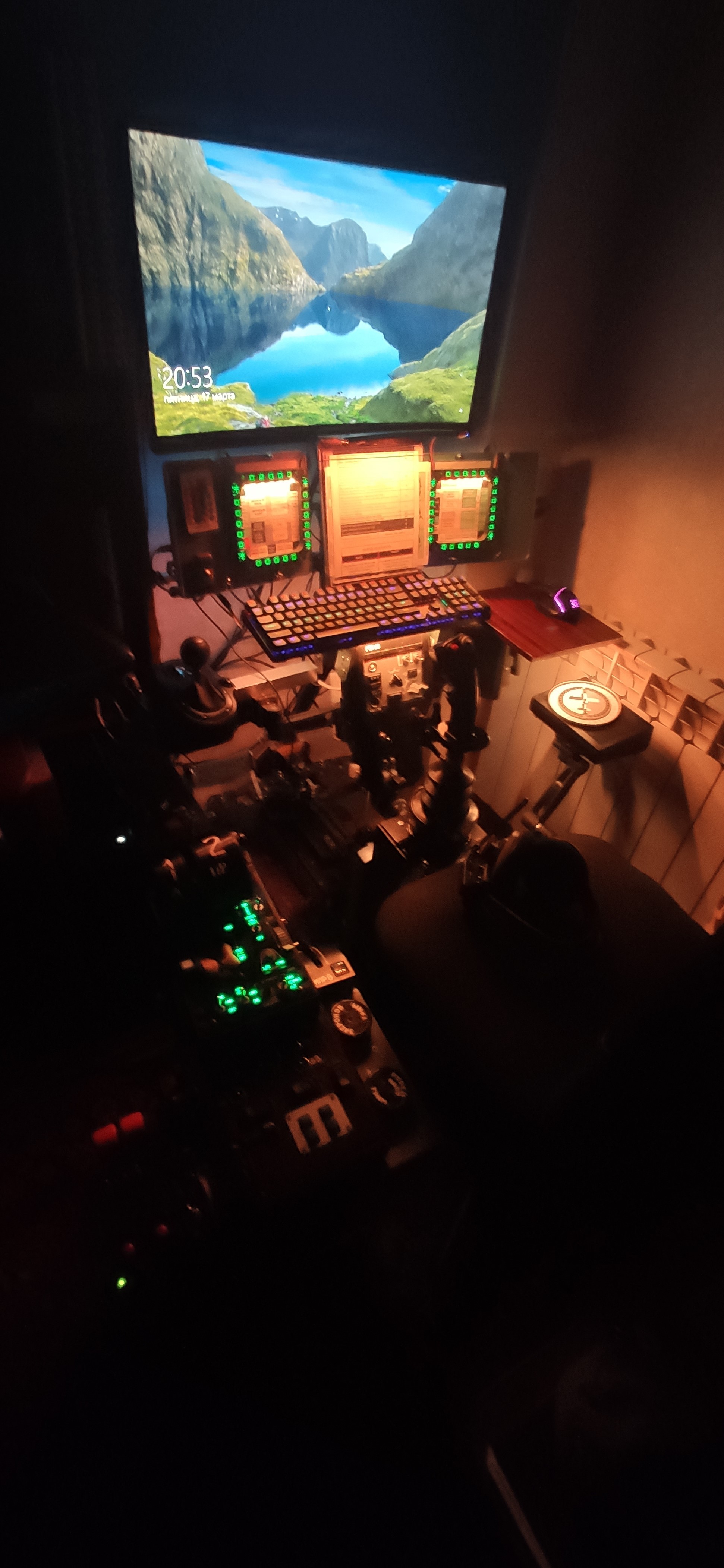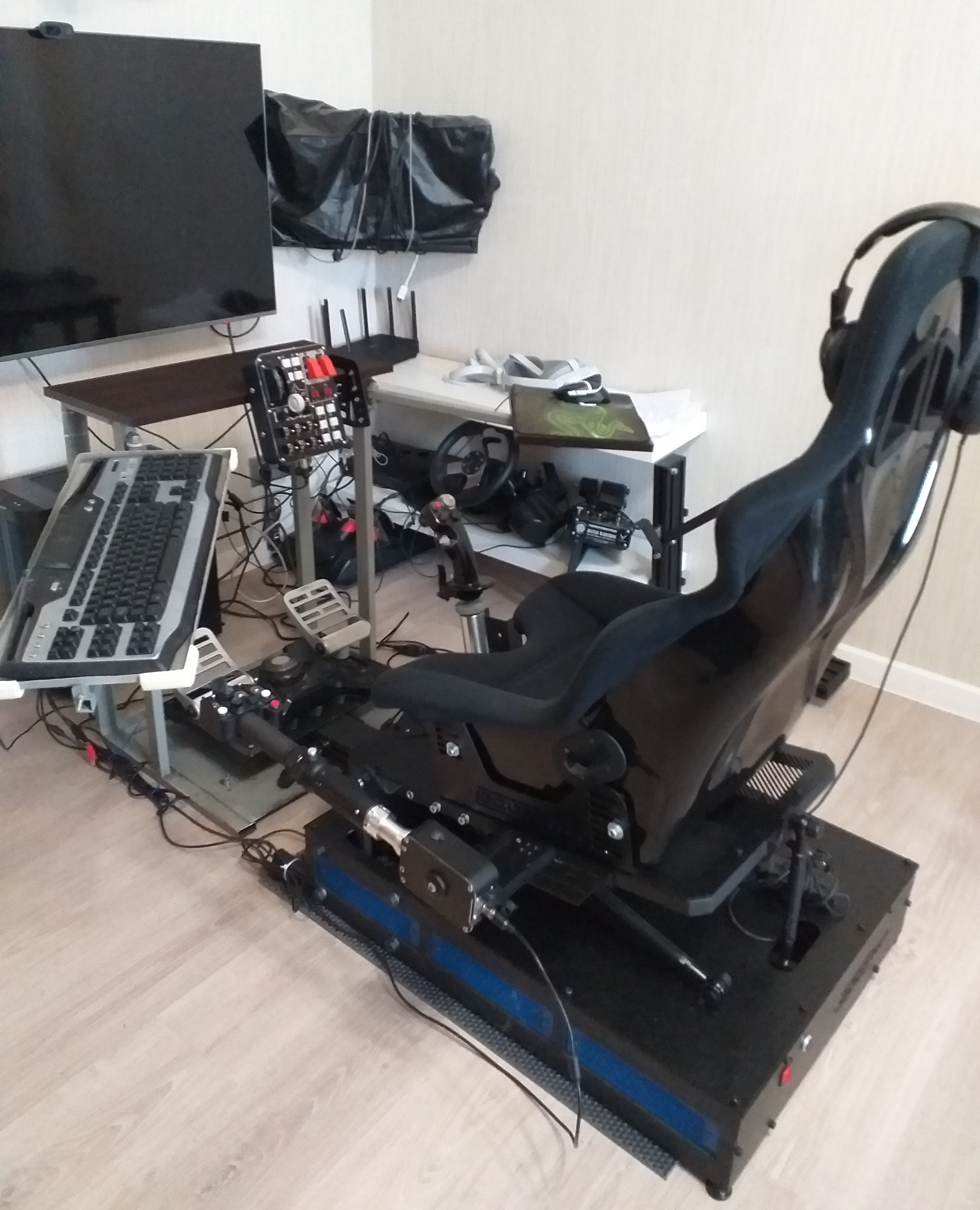 diagnost Опубликовано: 14 апреля 2023 Опубликовано: 14 апреля 2023 Понятно, что в симуляторе, даже самом навороченном, никогда не будет, как в жизни. Но все же хорошо, когда периодически появляются устройства, позволяющие выйти на новый уровень приближения к реальности. В моей симмерской жизни были 2 таких момента: когда приспособил к голове Трекир и когда надел на голову 1-й ВР шлем. Ну а теперь, похоже, 3-й момент наступил, когда уселся в кресло 3dof платформы. Опробовал ее в 3-х основных авиасимах и в ETS 2. Первые впечатления весьма положительные. Вообще-то, если рассуждать о симуляторах в игровом аспекте (а наши авиасимы - это прежде всего игры), чрезмерный реализм не всегда может быть уместен и востребован. Я вон глянул ролик с 360-градусным кокпитом, выложенный выше в этой теме, и меня на ржач пробило, когда представил, чтоб со мной было после игровой сессии в такой вот шайтан-клетке. Нет, какому-нибудь парню с еще не потрепанным здоровьем, готовящемуся стать или уже будучи летчиком-истребителем, или же просто ради острых ощущений, такая конструкция и покажется интересной. Ну а мне, например, для домашнего расслабона что-нибудь попроще и поспокойней, плиз. И вот такая 3dof платформа - самое то будет. А в своем случае выигрыш получил еще и в плане эстетики и эргономики. Хотя и грустно было резать родное рукотворное изделие, с которым годами был доволен, как слон, но все же фирменный вариант посимпатичнее выглядит. До: После: Единственный сравнительный минус - расположение РУСа. У меня база от VPC T-50CM2 с кабаньей ручкой. К этой базе от 2dof.ru прилагается дополнительный кронштейн с безвариативной фиксацией на платформе. И при наклоне влево-вправо до крайних положений ручка в ноги упирается, хотя сиденье отодвинуто до упора назад. У меня раньше была регулировка положения базы как по вертикали, так и вперед-назад и с этой оказией не сталкивался. Ничего, гарантия закончится, что- нить придумаем. Ну и модули симовские раньше быстрее менялись, но это не суть: не каждый день из авиа в авто перехожу и наоборот. А в целом, конечно, доволен модернизацией своего игрового кабинета, не говоря уж о новизне ощущений. 2