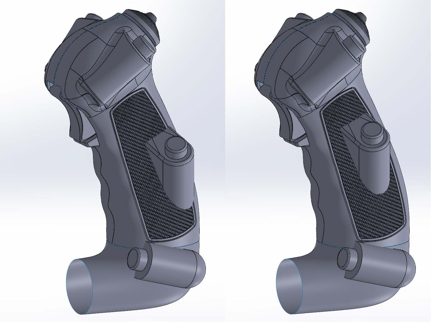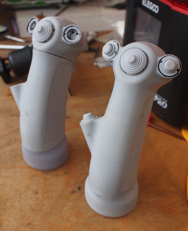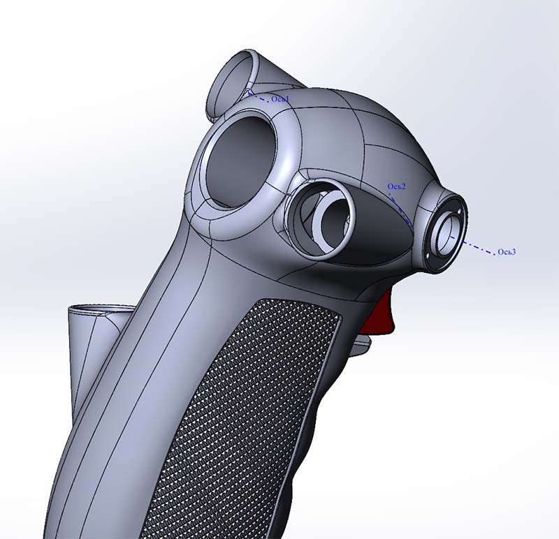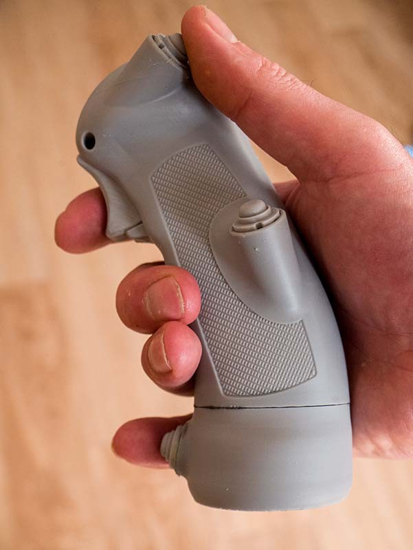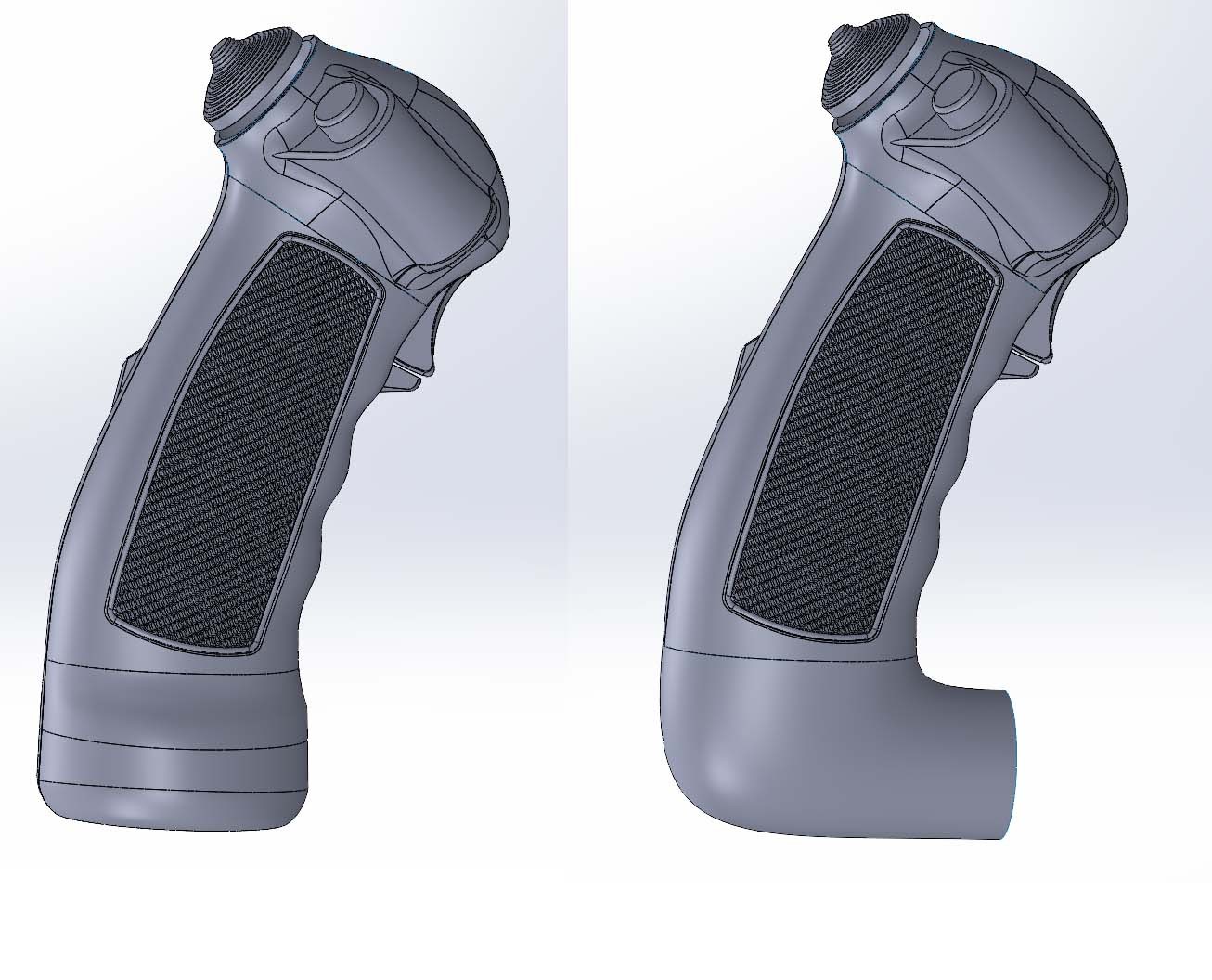 micro-flight Опубликовано: 20 мая 2023 Автор Опубликовано: 20 мая 2023 Напечатал пробную ручку, чтобы оценить возможности фотополимерной печати и проверить идеи по модульности ручки. На снимке совсем необработанная модель, вообще никаких абразивов кроме тонкой подгонки нижней части. Модель печатается точно как спроектирована. В сравнении с ручкой FDM печати, которая долго шкурилась. Можно было печатать цельную ручку, но интересно было бы попробовать составную для комбинаций. Первое впечатление, что ручка лишенная наплывов, более гладкая и более упорядоченная по поверхностям, очень удобна. Но, вместе с тем до момента добавления модулей есть над чем работать для доведения ручки до рабочей эргономике. Например выход в виде кольцевой площадки хатки слишком высок. Большой палец испытывает напряжение при плотно взятой ручке. Насечка мелковата, надо бы перенарезать на более глубокую. Но, тем не менее, прикидки по расположению кнопок можно делать. Вот сравнительный снимок. В первом случае большой палец зажат между наплывом кнопки на голове ручки и кнопкой снизу. При первом впечатлении может показаться, что в целом достаточно комфортно. Но это пока не начинаешь использовать. Когда рука и тем более пальцы ограниченны, очень быстро наступает дискомфорт и усталость, а ощущение удобства идёт только от базовой формы ручки. Красным цветом отметил текущее положение наплыва кнопки и желаемое положение кнопки. При втором положении рука будет иметь большую свободу для микродвижений и перехватов, средний палец не будет упираться в наплыв и можно будет плотнее удерживать ручку. Возможно имеет смысл обрезать и нижний наплыв, так как он не несёт в себе функционала и ставить полноразмерную авиационную кнопку не надо. И еще тогда появится возможность нижнего удержания ручки пальцами. Например для лёгких коррекций при полёте. Список изменений следующий: Подвинуть положение хатки вперёд, будущее положение кнопки на голове тоже вперед и вправо ближе к оси ручки. Продумать форму наплыва кнопки на ручке и что-то сделать с насечкой. 4