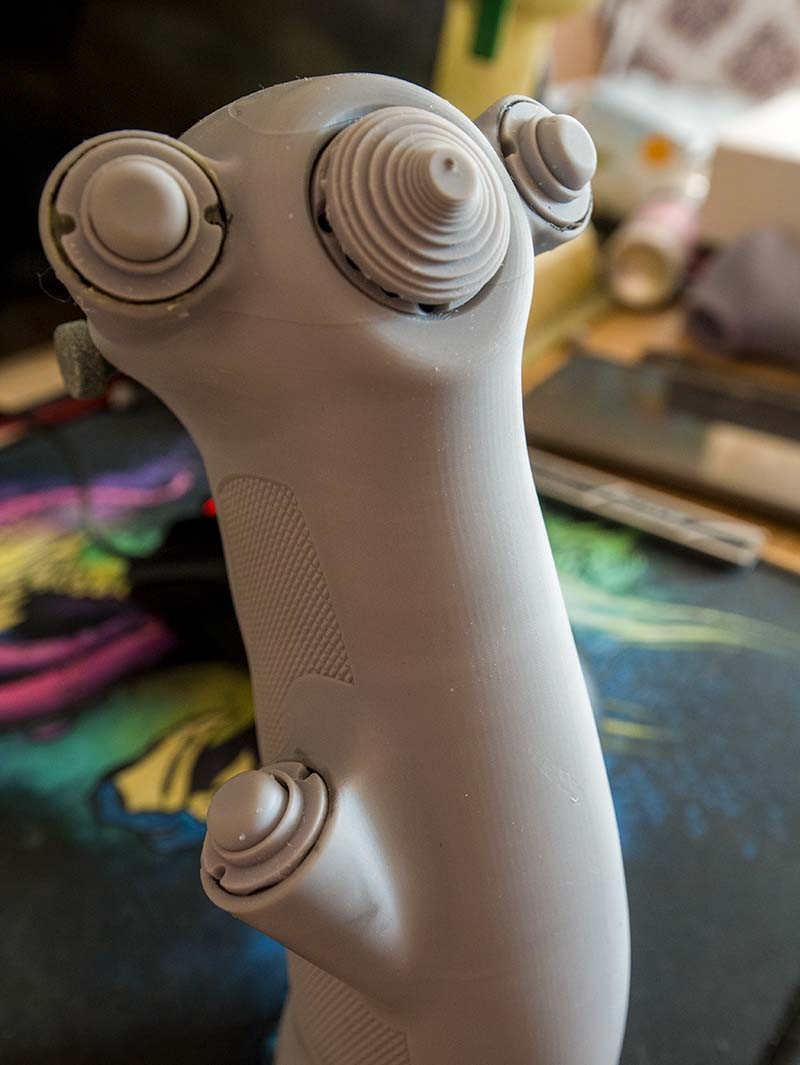 micro-flight Опубликовано: 4 июня 2023 Автор Опубликовано: 4 июня 2023 В общем метод вполне рабочий. Беру базовую поверхность, добавляю нужное, печатаю, примеряю, повторяю. На снимке результат на котором остановился. Она же с другим фокусным расстоянием Остановился на варианте самой простой формы наплыва под кнопки, он же оказался и самым эффективным. Ручка получилась очень просторной, ничего не мешает, но вместе с тем под рукой. И ручка оказалась самой маленькой из всех какие пробовал, очень долго добивался такого эффекта, чтобы маленькая для настольника, но просторная. И не получалось, пока эту не сделал. Сравнение с текущей ручкой которая уже отлажена донельзя по эргономике. С присоединенной нижней базой по высоте она оказалась выше всего на 1-1.5 см, всего навсего. Но если отстегнуть базу, то становится на столько же и и ниже! То есть общую высоту джойстика можно снизить еще на пару сантиметров без потери удобства, а если ставить на напольник, то будет просто обычная ручка. Кстати углы наклона ручки вперед совпали, только на предыдущей я наклонял вперед последовательно пока не нашел удобный угол, а тут уже такой. Решил еще попробовать делать внутреннюю структуру. Самый верхний шпангоут, который в темноте, имеет отверстие ø12 мм и если крепить ручку на что-то, то это что-то может иметь трубку или стержень, который будет проходить через всю ручку и принимать нагрузку на себя. Тем самым можно ставить даже напечатанную ручку. Кнопки, кстати, в макете полностью функциональны. Немного доработал свои стандартные корпуса кнопок под микрики 6х6 и они стали рабочими Хатка рабочая тоже. Прямоугольники на тыльной стороне ручки я глазами не особо вижу, становятся видны только при съемке с увеличением, но это не следы печати, а сетка меша модели))) Курок сделан из расчёта под микрик с роликом. Микрик крепится на подрамок, который прикручивается к внутренним крепежным отверстиям. То есть еще удалось добиться минимума крепежных отверстий снаружи ручки. И еще интересный момент, оригинальная ручка Фантома, как и многие другие имеют кнопку под мизинец. Она на правой ручке находится слева и жутко мешает и неудобна в плане нажатия. Кнопку я поставил по центру и в самом низу базы слегка развернув вверх В результате, она совершенно не мешает. Выступает своего рода ограничителем если брать ручку низко и оказалось, что можно одновременно и удобно нажимать 3 кнопки сразу в любом сочетании. Играть, так сказать, аккордами. По ощущениям хатка чуть менее удобна чем на текущей ручке в стиле сайдстика. И правая верхняя кнопка немного не то, чтобы неудобна, просто связка чуть тянется. Но там и кнопка менее востребованная и можно ставить другие элементы, тумблер например, переключатель. В целом эти неудобства именно в сравнении есть, но общие выгоды пока делают ручку очень перспективной. Работы впереди тоже очень много, в первую очередь связано с параметризацией модели, ну и технологически продумывать. Наилучший вариант все таки композит как ни крути. 3