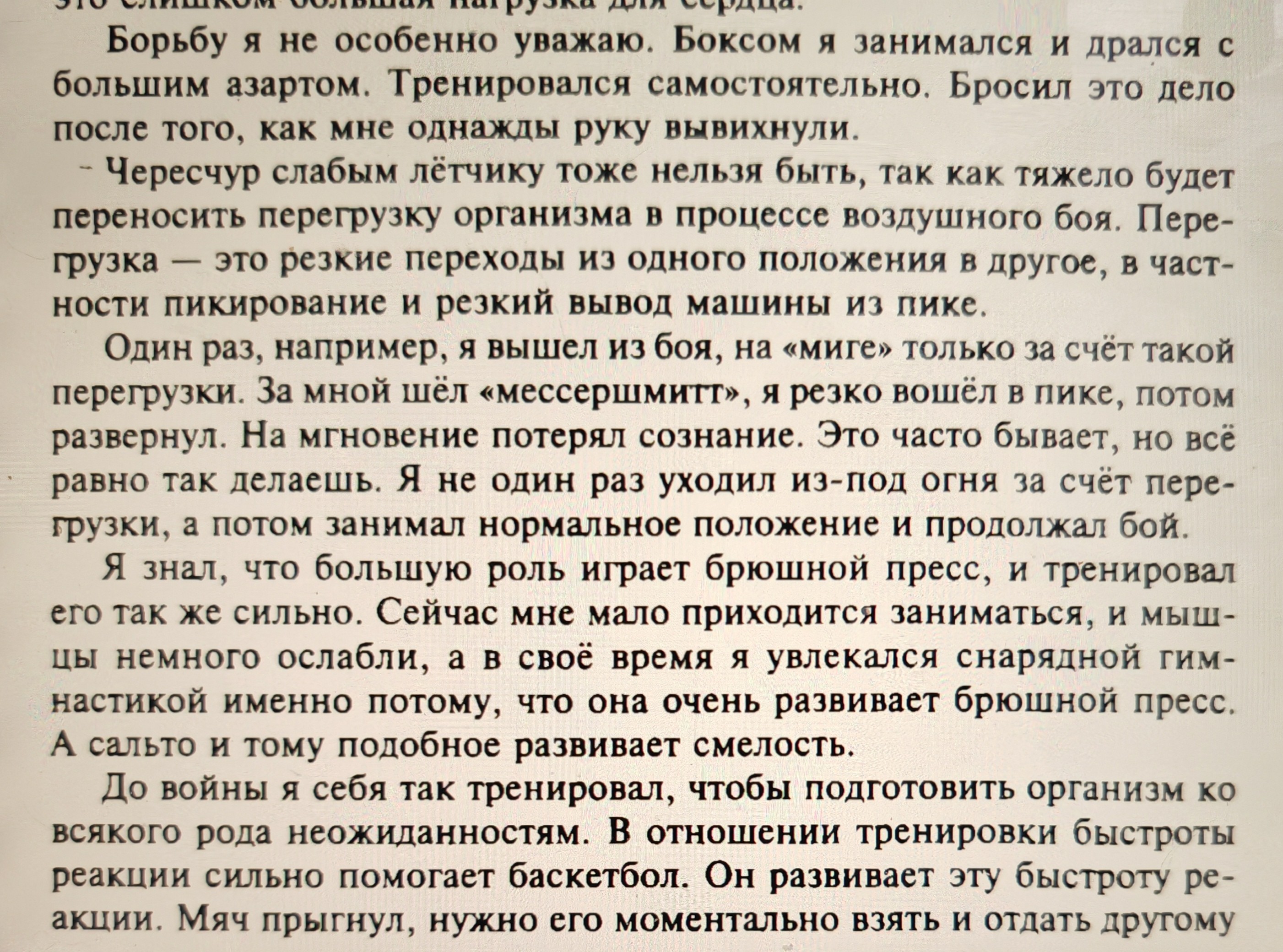 pepper9881 Опубликовано: 3 октября 2023 Опубликовано: 3 октября 2023 1 hour ago, AnPetrovich said: Было на эту тему исследование хорошее, сколько лётчиков-истребителей анонимно признавались в потере сознания за свою лётную практику, и сколько испытуемых при тестах в принципе не помнили, что они вообще-то сознание теряли. Вот из из интервью Покрышкина комиссии МО в 1944. Там же как раз про противоперегрузочные хитрости с напряжением пресса. 1 1