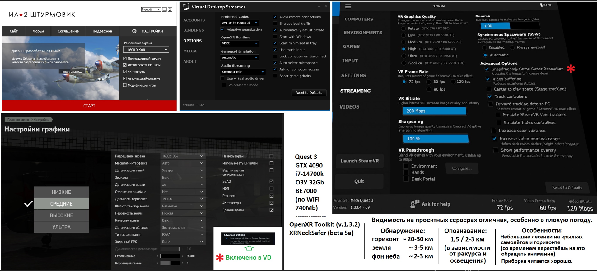huligan Опубликовано: 6 апреля Опубликовано: 6 апреля (изменено) 2 часа назад, Trac_82 сказал: Хоме- это мета квест линк? да,раньше он окулус хом обзывался,мы привыкли 2 часа назад, Trac_82 сказал: Ожидал увидеть заметное улучшение графики там асинхронка к графике отношения не имеет же ж! Какое улучшение? оно просто режет частоту пополам(если 90 стоит,то на 45,если 72,то на 36 итп),если фпс в игре проседает ниже установленного(90,72...) и грубо говоря просто удваивает каждый кадр,иногда пытаясь в доп кадре промежуточный изобразить,что у него получается,как у пьяной балерины:))) ASW с SSW дают артефакты при быстром движении объектов,например двояться пролетающие мимо самолёты ,ломается винт,если в настроках в файле стартап.кфг включен реальный винт,а не полупрозрачный блин итд итп... 2 часа назад, Trac_82 сказал: сообщение что что-то там включилось фпс в игре,которое по кнопке бэкспейс,после отключения asw будет постоянно меняться ,если карта не вытягивает стабильные 90(72...) , а не стоять на 45(36...) А с включенным ASW там фпс или 90 кажет или сразу 45.Ну совсем слабые компы я не рассматриваю,где ваще ниже 45 может фпс падать(или 36 при 72 выставленных) Изменено 6 апреля пользователем huligan