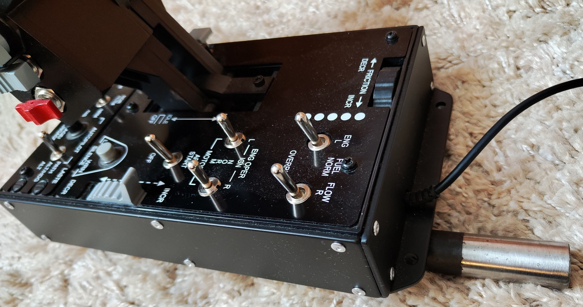 sergeype Опубликовано: 29 сентября Автор Опубликовано: 29 сентября Ну что же; в прошлый раз с продажей основной части комплекта не сложилось, освежим тему. Из непроданного остались: 1. Сам моноблок со съемной ручкой VKB KG-12 (первая версия). Напомню, что электроника в нем- от VKB, с возможностью подключать как ручки от VKB (с заменой разъема в ручке на пятиконтактный, соответствующий шлейф- в комплекте, при необходимости могу изготовить еще несколько штук), так и ручки Cougar/ Warthog/ F/A-18 (2 адаптера под них- в комплекте). Ну, и кнопочно- энкодерная панель управления. 39 тыс. руб. 2. РУД Hotas Warthog c радарным министиком ALPS от Delta Sim Electronics и соответствующей прошивкой. 15 тыс. руб. 3. Съемный кронштейн-рамка для установки панелей MFD Cougar (или экранов аналогичного размера). Бонус к моноблоку. Все фото- в теме выше, ну, разве что еще адаптеры: Скрытый текст