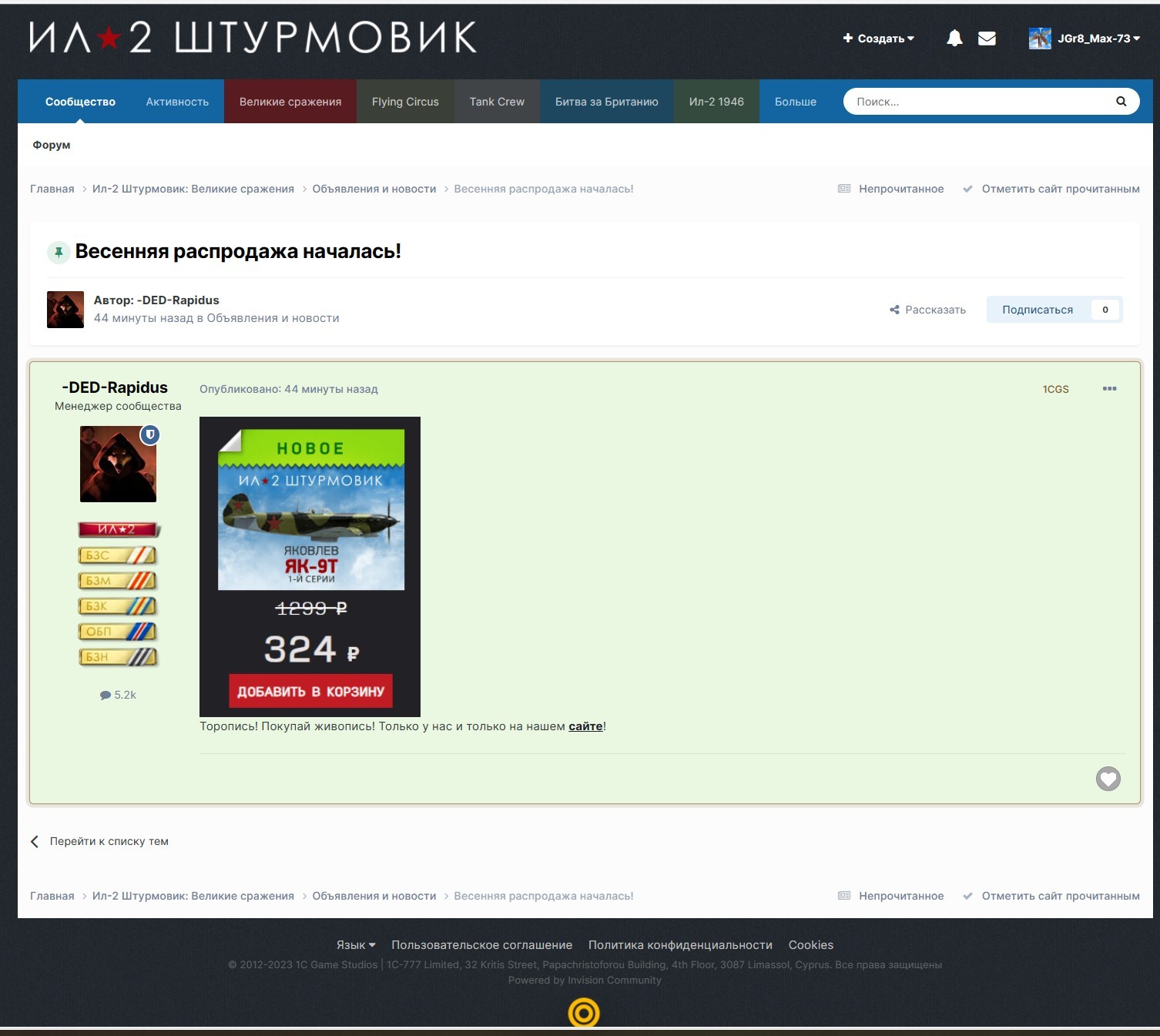 Marque Опубликовано: 9 марта 2024 Опубликовано: 9 марта 2024 (изменено) 9 часов назад, Da_ktoo сказал: Обвинение в зачеркнутой истории вообще откуда? Кто ее зачеркивал? ..ну ладно, ну не то чтобы совсем "зачеркивал" прям.. "Недописал" - скажем так, в нашу общую летопись симулятора "Ил-2" (О, как теперь жить?!! ?) Ежели там новый проект уже маячит, так я, право, уже и не надеюсь, что будут "МОИ" скромные пожелания исполнены..(( ..не, а вдруг??? "Вижу тень наискосок, рыжий берег с полоской Ила.. я готов целовать песок где разрабы наши ходили.." Ну ладно, давайте и доброе помянем.. Проект есть? - есть! Развивается? - Вполне! Ну пусть манёха не в те стороны, что нам бы всем хотелось. Но самолетики делаются? - Делаются! Общение с нами хотельщиками так или иначе идёт? - идёт! - Так что-ж ты грустный такой, Макарыч?!!! - Девятку жалко...ПРО СКИДКИ 8 МАРТА (а не 23-го) Не, хоть ругайтесь хоть нет, а любой день для скидок, я считаю хорош! Я как узнал, опа.. - и две модельки еще прикупил! ? Классно? - Классно! Так что давайте, товарищи друзья, пожелаем команде НОВЫХ чётких успехов! Продуктивной работы! Новых интересных идей и их воплощения! Ну и поблагодарим уже за то, что имеем! Я вчера вот просто летел и наслаждался в симе погодой, красивыми облаками и "красивой зимой"! Как некогда Альберт сказал когда они решали какую карту первой делать: -"А давай..., сделаем красивую зиму!" Получилось? Я думаю - таки ДА! Так что простите великодушно старого больного брюзгу..! Будем ждать и радоваться новым моделькам и картам (постепенно, не сразу..) Пы Сы JGr8_Max-73 благодарю за еще один ролик и еще одно напоминание ПРО ИЛ-4 "Оружие победы"!!! От души! Изменено 9 марта 2024 пользователем Marque 1