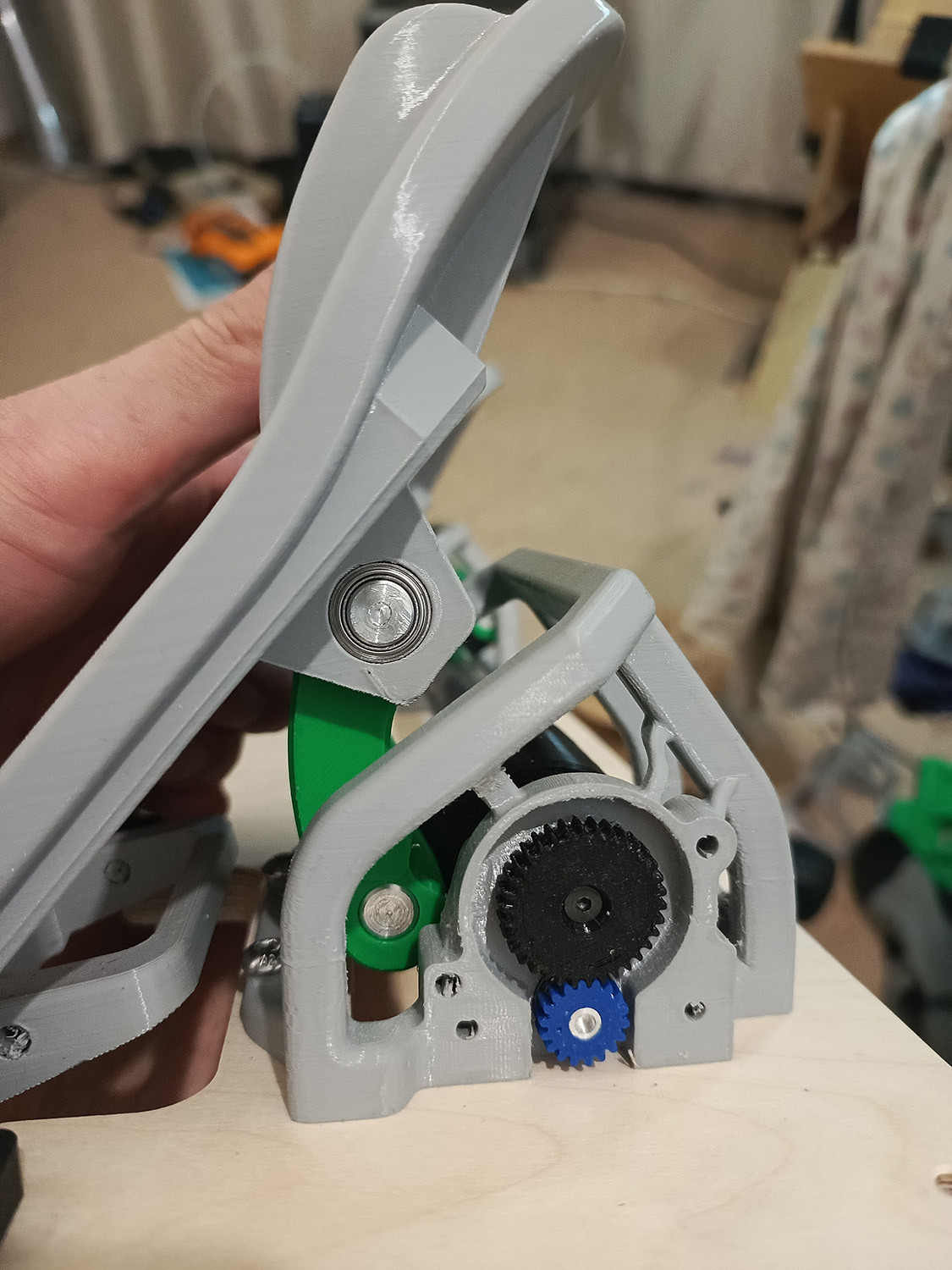 micro-flight Опубликовано: 19 октября Автор Опубликовано: 19 октября Уже второй час ночи, уже вырубает просто и датчик не смогу установить. Но пересобрал с новыми деталями и установленными шестернями. Всё, крутится, работает. Посмотрим, как будет в паре с электроникой. Шестерни всё таки печатаются не идеально, а чистить зубья уж слишком муторно. Но вроде как приработалось и очистилось. В левой педали где-то трется поскрипывая пластик, что создает странное ощущение, но вроде работает. И да, ажурная опора с шестернями, сегодня была перепечатана на новую и зеленый рычаг тоже, с добавлением нужных вырезов и новых углублений. Детали тоже отлично взаимозаменяются, что очень хорогий признак. Следующий этап это запуск с электроникой и интенсивная проверка на выносливость. 1