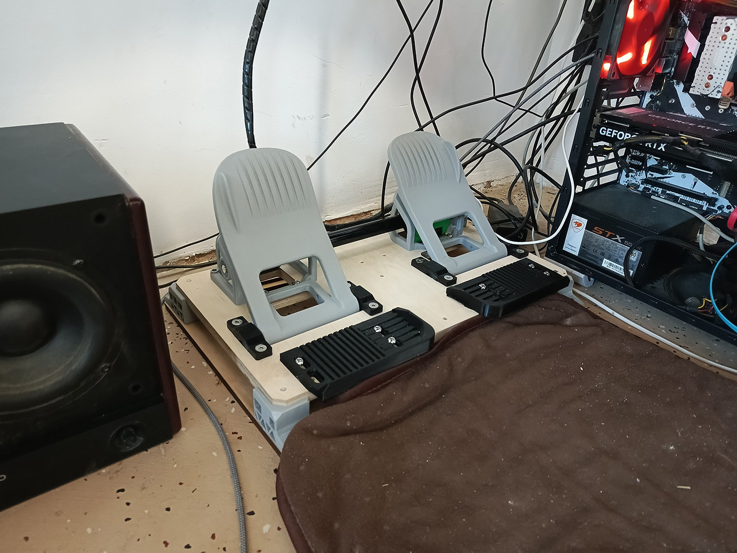 micro-flight Опубликовано: 22 октября Автор Опубликовано: 22 октября (изменено) Ну вот, какое-то число налетал. Можно и что-то рассказать. Доделал кое-какие второстепенные сервисные штуки, вроде расположения контроллера. Когда снял коробочку с контроллером, увидел небольшой сюрприз - винт удерживающий плату контроллера, вылез на какой то лишний миллиметр и вкрутился в ведущую шестерню. Я чувствовал какое-то непонятное трение, но причину установить не смог, так и летал. Винт, между тем проделал приличную борозду, которую виндно на снимке. Вывод простой, поставить винт покороче. Второй вывод состоит в том, что шестерня оказалась способна переносить значительные нагрузки без потери качества для сигнала. Добавил крепление провода на крышку, чтобы нельзя было случайно испортить гнездо USB на плате. Коробка контроллера спокойно выдерживает вес около ста киллограм, плюс предохранитель для провода. За этот узел можно быть спокойным. Еще деталь, вместо того, чтобы делать втулки проставки для датчика, я просто распечатал рамку и это оказалось лучше. Избавился от лишней работы на токарном и так проще ставить плату. Решил попробовать немного приподнять педали, чтобы найти наиболее оптимальную эргономику для педалей. Вроде даже как удобнее и такие ножки можно сделать в виде части быстросъемных креплений, но вопрос к чему крепить крепления на полу? У меня с прошлых педалей лежит уже сколько лет временно сделанный лист фанеры с гнездом под педали и под колесики кресла. Пока что просто прикрутил шурупами педали к этому листу, буду пользоваться и изучать. Лист, кресло, все равно имеют подвижность, но так хоть сохраняется расстояние между креслом и педалями. А вообще надо делать кокпит отдельный. Вот так выглядит в рабочем положении. В целом, ещё всё равно далеко до однозначных выводов. Для упрощения конструкции я делал так: все радиальные нагрузки на подшипниках, осевые - контакт пластика и только для защиты от смещения. И вроде всё подогнал так, что должно если и скользить пластик по пластику, то минимально. Но все равно где-то сохраняется излишний контакт и ощущается некоторое затирание. Давая ощущение "дешевого пластика" и эти микрострагивания могут дать всплеск если смотреть в джойтестере. Первое использование было сразу в ил-2 на Берлоге. Поначалу был сильный дискомфорт в правой ноге. Но у меня от частой езды на машине как раз правая нога вынуждена парить над педалью газа и уже болезненно реагирует на такие движения. Но, в какой-то момент стал замечать, что результативность то сразу заметно выше стала! И это несмотря на неудобство и недоработки. Видимо, сама схема рычагов в этой модели педалей дает такую кривую отклика, что она несколько нелинейна и в околоцентральных движениях всё очень плавно, без дерганья. Прицельная стрельба в самых невероятных ракурсах... очень даже запросто. Стрельбы на упреждение - вообще прекрасно. Поэтому стал обращать внимание на результаты. В гражданских симуляторах, на вертолётах в висении выполняя упражнение поворота обратил внимание что не то что могу вращать вертолёт на 360° не выходя из диаметра в 1 метр, а вообще на месте. В общем, впереди ещё немало исследований. Изменено 22 октября пользователем micro-flight 3