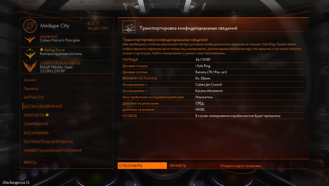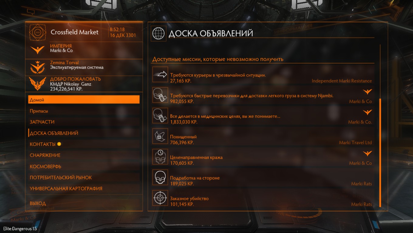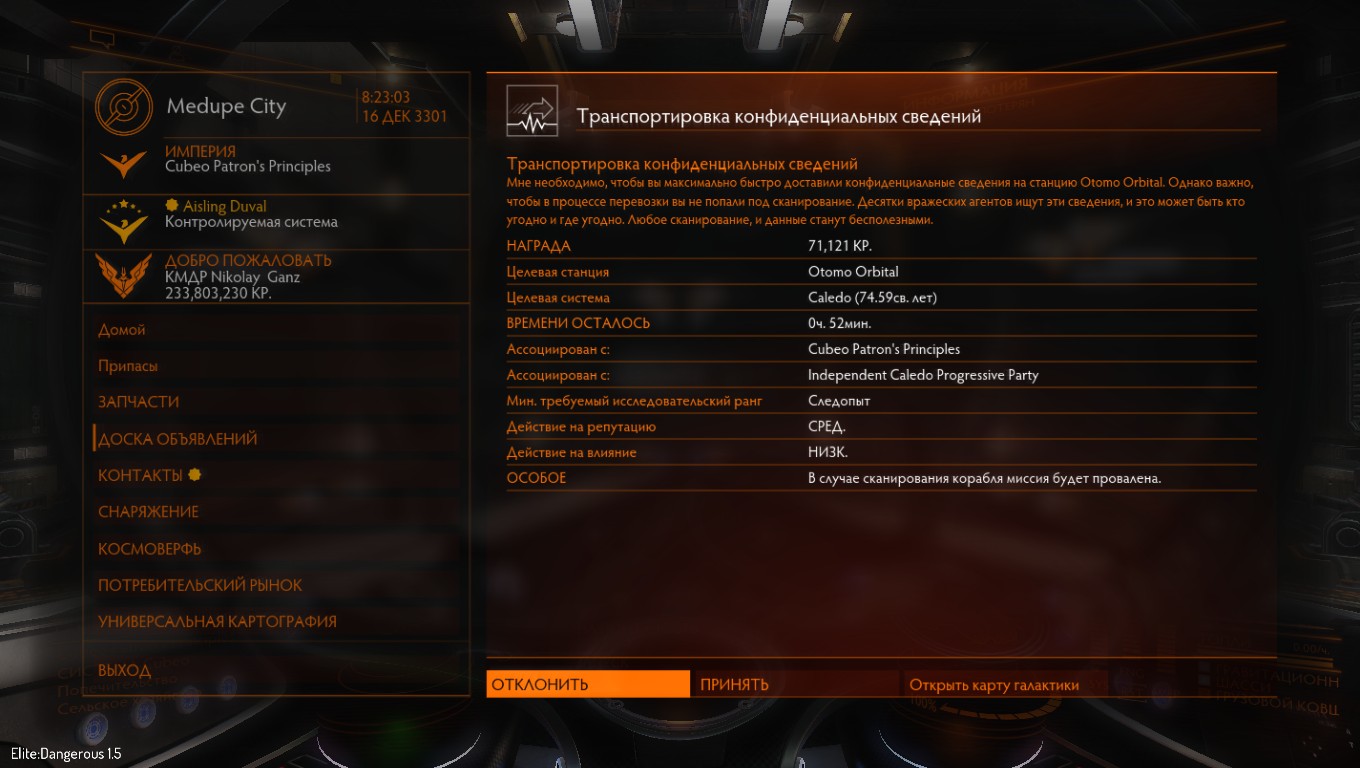 GANZ Опубликовано: 16 декабря 2015 Опубликовано: 16 декабря 2015 Да ... с новой иконкой. Предлагают доставить данные в систему ,получить деньги и новые инструкции - это как раз то о чём Брабен говорил - ветвистые задания.Только вот в моей системе я не увидел строк о получении дополнительных инструкций - выглядят миссии примерно так