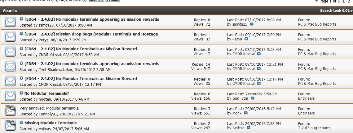 GL-ER Опубликовано: 11 октября 2017 Опубликовано: 11 октября 2017 (изменено) А модульных терминалов нет. Нигде нет. Кто-то уже запостил баг репорт 07.10.17 Ответа нет. Description Over the course of the last 2 days I have been board flipping and running missions in the toolfa/mildeptu region doing quick runs to attempt to stock up on modular terminals and have found no missions offering them as rewards, however I checked other surrounding star systems(especially high tech. or industrial boom systems) and found that there are no modular terminals showing up anywhere else. Steps to Reproduce 1: go to any station with a mission board 2: open up the mission board 3: scroll through available missions with commodity rewards, there will be none offering modular terminals. https://forums.frontier.co.uk/showthread.php/382849-No-modular-terminals-appearing-as-mission-rewards?highlight=modular+terminal PS Я ветку профессора Палина не открывал, мне хватило других четырех, катаюсь с третим грейдом движков бабы Фили. Изменено 11 октября 2017 пользователем GL-ER