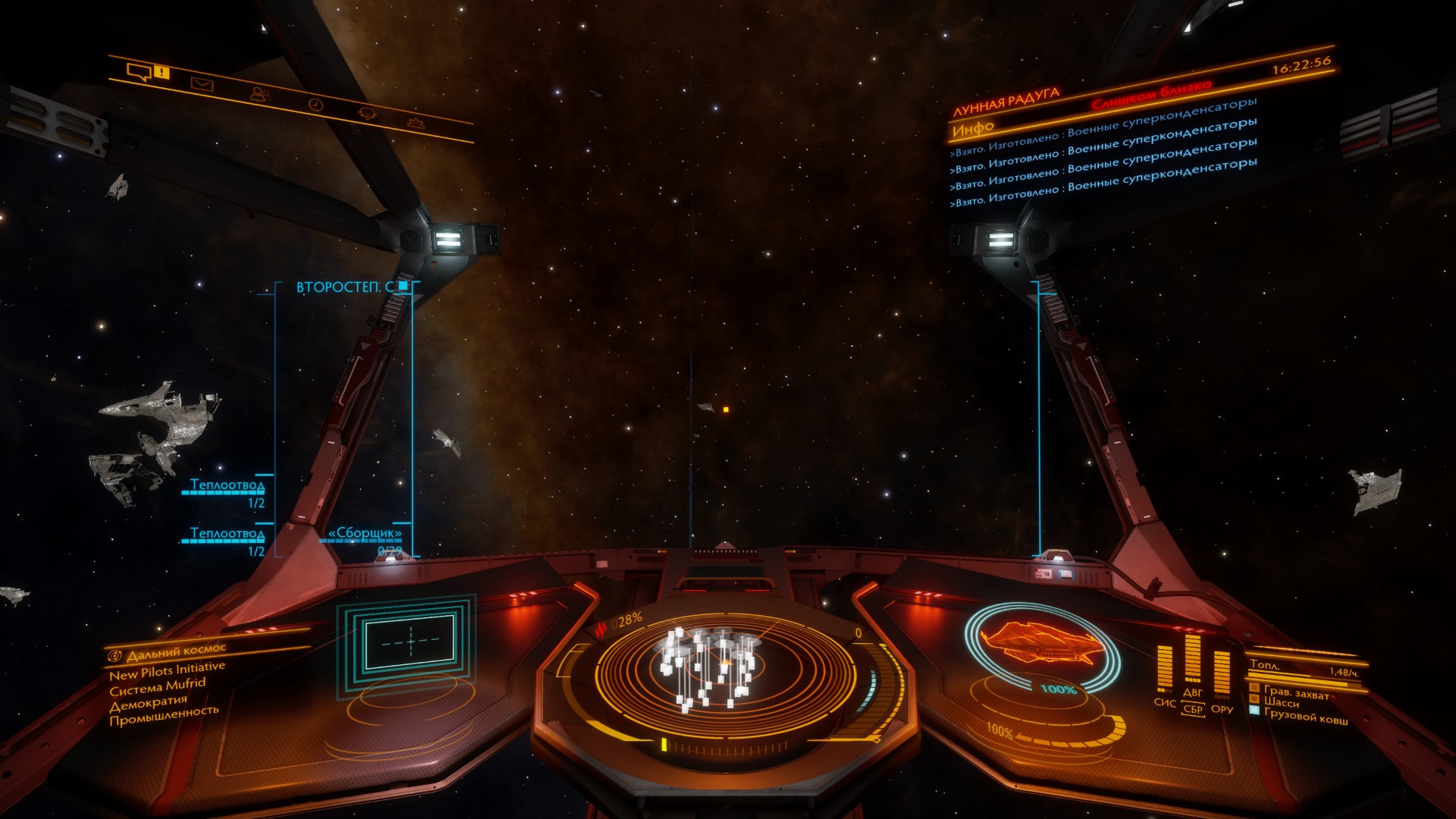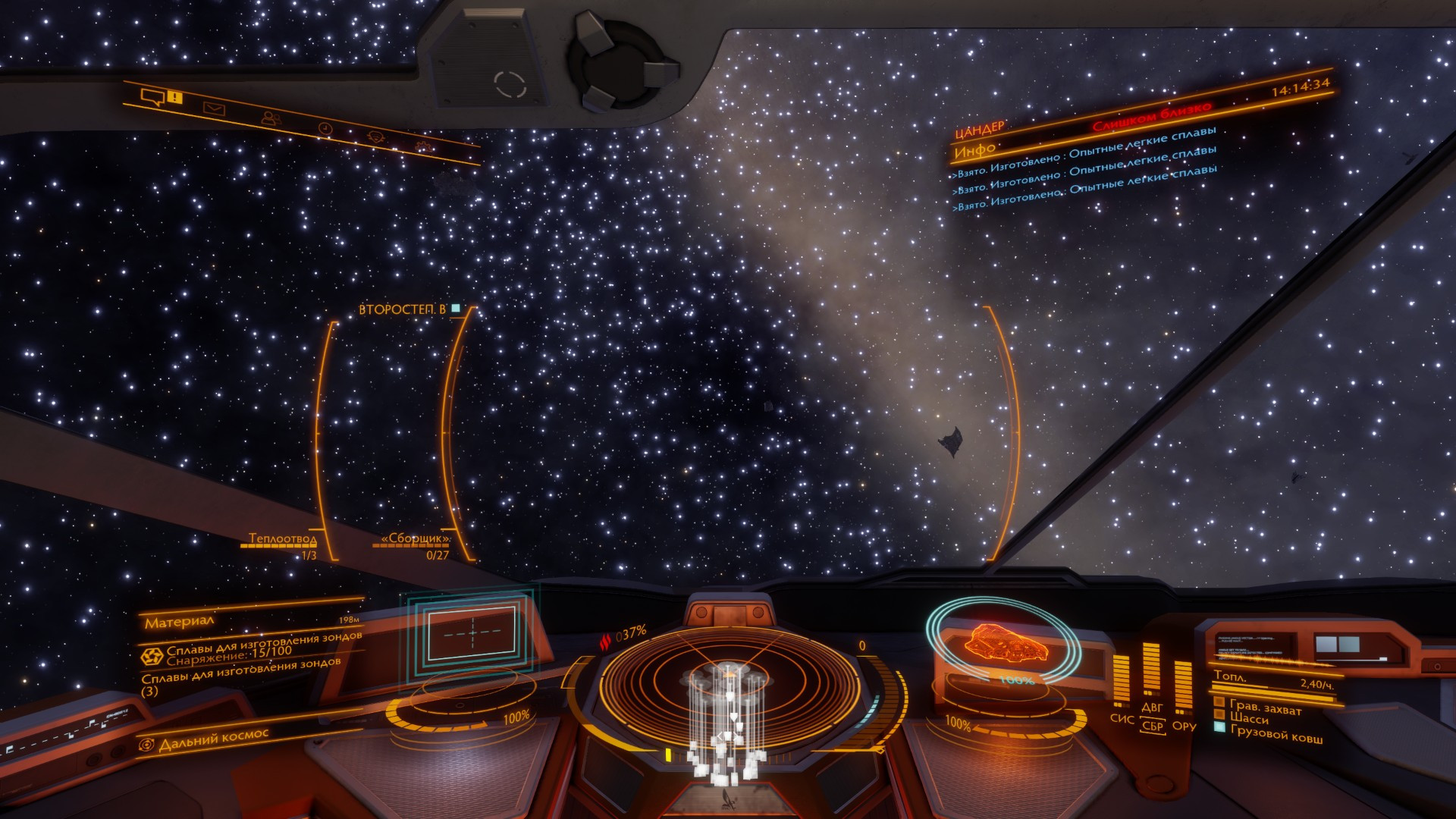 RRR_39 Опубликовано: 14 ноября 2024 Опубликовано: 14 ноября 2024 Сейчас эвакуировал пассажиров из атакованной таргоидами системы. Для эвакуации использовал пассажирский Катер заточенный под это дело. Поскольку репутация была начальная, набрать удалось только чуть больше 100 человек на 168 мест. Остальные беженцы со мной лететь не захотели, хотя там были контракты на 18 и 19 миллионов. Лететь до спасательного корабля 230 св.л., раньше вроде такие корабли были ближе, но это не точно. В первом прыжке перехватила судя по скорости Глефа, но я успел от нее свалить. Еще пришлось в пути заправляться на станции, так как топливозаборника у меня не было. И еще кто то из пассажиров был в розыске, постоянно нервировала красная надпись. В общем на все ушло примерно полчаса, получил 58 миллионов. В принципе не плохой способ заработка кредитов. Но проблема в том, что завтра, максимум послезавра лавочка закроется до следующего четверга, так как все атаки на системы будут отбиты. 1