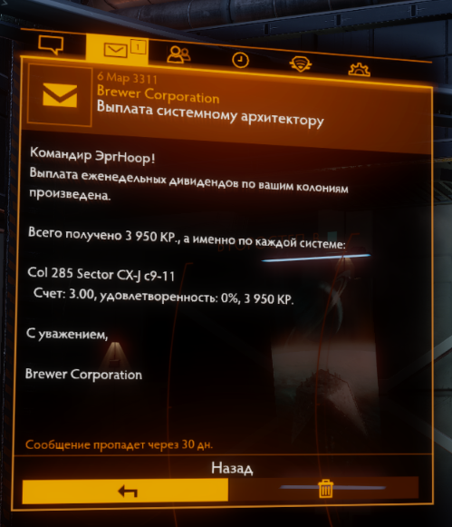 Rasim Опубликовано: 6 марта Опубликовано: 6 марта (изменено) 17 часов назад, RRR_39 сказал: Тогда будет создана фракция с именем эскадрильи. Если я правильно понял, самому проверить не удалось. Так то да, но это уже БГС - придется следить не только за благосостоянием системы, но и за политическим весом своей фракции в системе, а так же за ее состоянием; выполнять за нее миссии, возить медикаменты и еду, воевать иногда. Думаю можно и без нее, просто стричь купоны(когда ни будь, со временем) и не важно кто у власти. 2 часа назад, RRR_39 сказал: Первая получка. Мажор!) А если без шуток, система пока голая, потому и доходов нет. Изменено 6 марта пользователем ross_Rasim