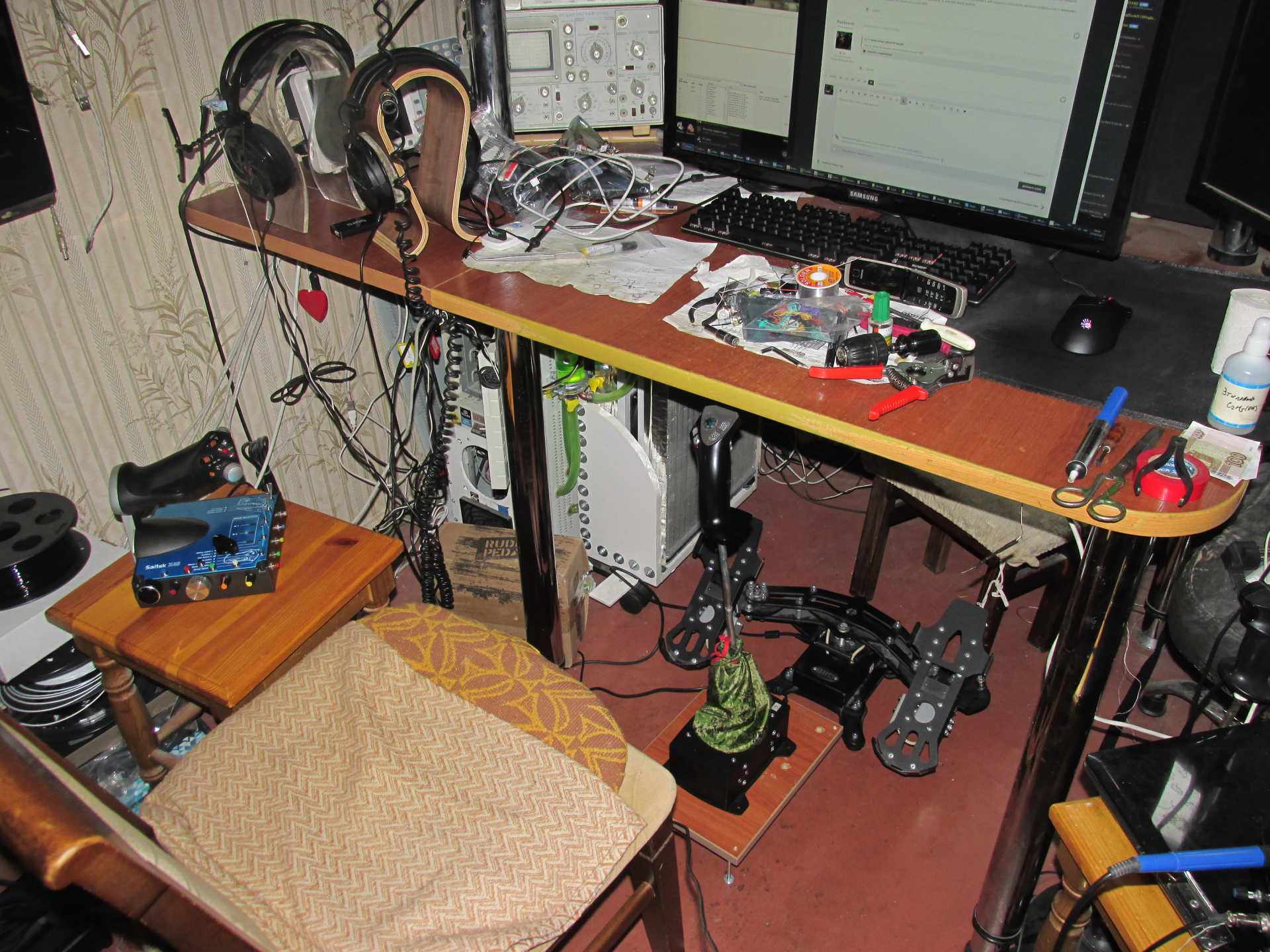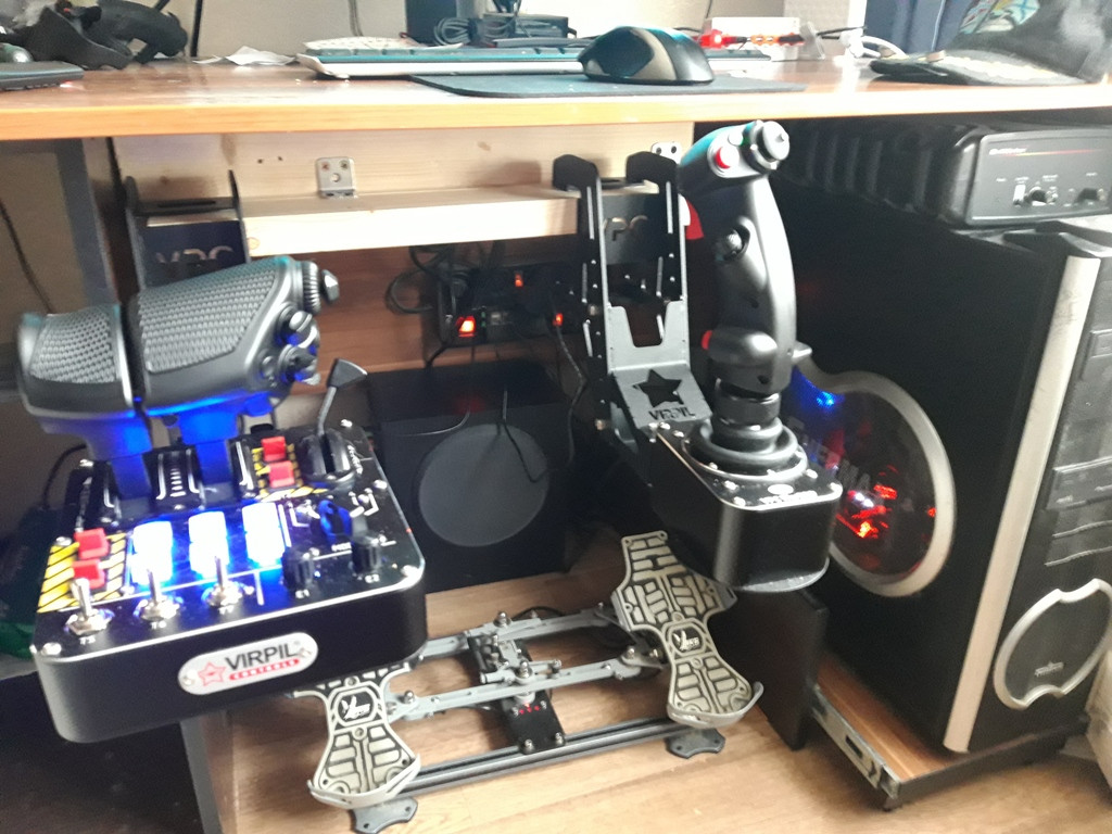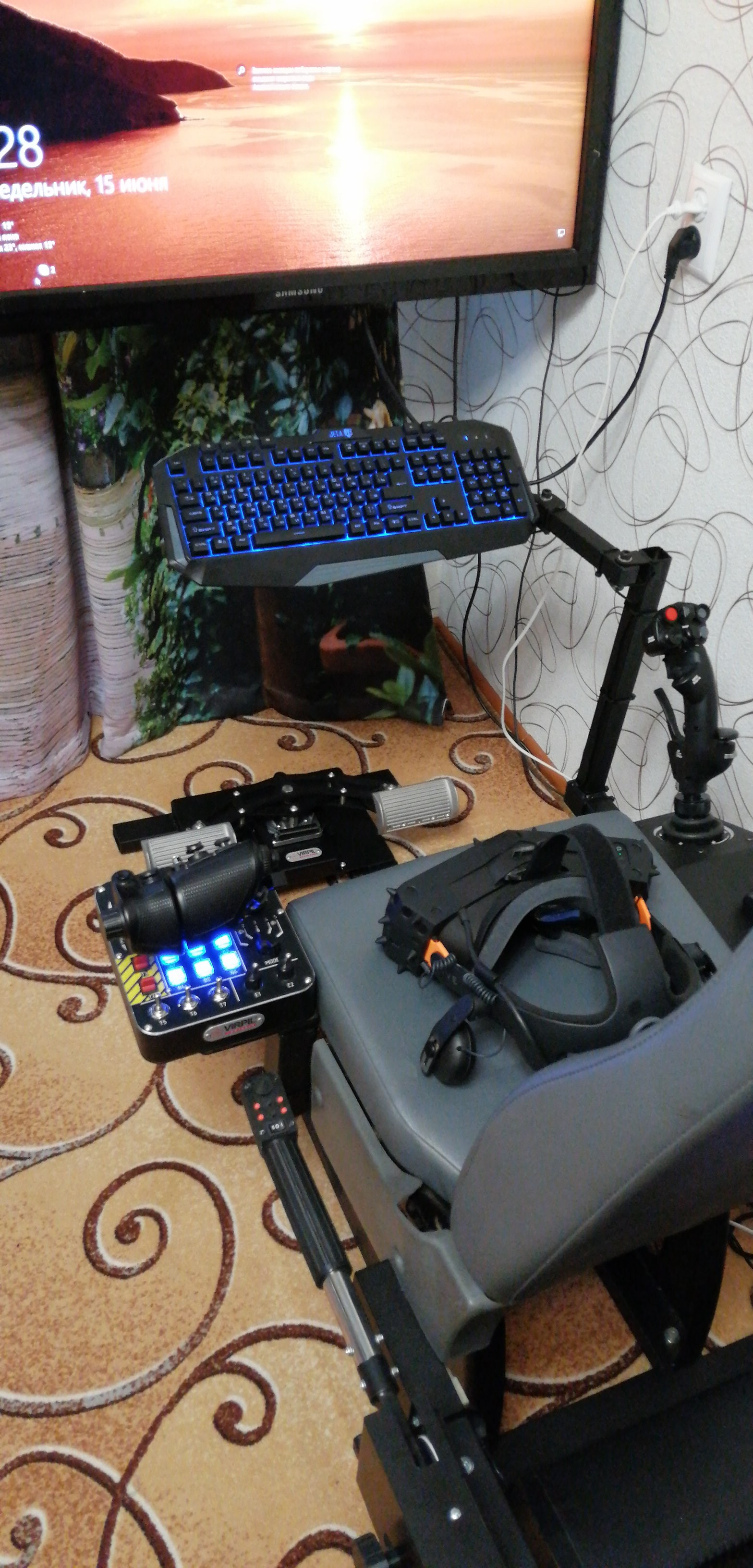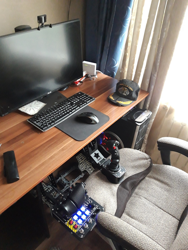 Painbeaver Опубликовано: 28 августа 2020 Опубликовано: 28 августа 2020 Что ж, вот и у меня наконец появилось то, что я могу назвать "домашним кокпитом": Всегда хотел универсальное решение, чтоб можно было и в симуляторы летать без каких-либо компромиссов, в остальные игры играть и работать за нормальным столом. И чтобы всё это не требовало получасового раскладывания-складывания. Сетап на кронштейнах мне не зашёл, обвешать геймерское кресло со всех сторон мне показалось какой-то полумерой, поэтому мой выбор пал на Monstertech MTX Sim Rig и полноценный стол. Вышло то, что вы видите на фото. Это не абсолютный идеал, к которому я стремился, но достаточно близко. Вся установка на колёсиках, легко ездит и так же легко блокируется намертво, если нужно. Надо поработать за столом ? Снял кронштейн, подъехал вперёд, выдвинул кресло - всё делается довольно быстро. Хотя вариант с кронштейном ВКБ, каким бы он крутым не был, я буду ещё пересматривать. Забавный факт - парни из Monstertech сказали, что я первый дебил из России кто заказал их кокпит. В связи с этим возникли проблемы с доставкой, а именно ограничение по длине посылок, отправляемых в РФ - 105см. Мне предложили два варианта, либо полный возврат денег, либо разрезать два основных профиля. Очевидно, я выбрал второй вариант. Парни всё сделали быстро и качественно, функционал не изменился ни на йоту, просто соединил профиль крепёжными элементами. Я прекрасно понимаю, что всё это можно было сделать самому, нарисовать схему\модель, всё измерить, просчитать, заказать профиль у нас и остаться с двумя почками вышло бы минимум в два раза дешевле, но мне моё время дороже. 13 2 6
