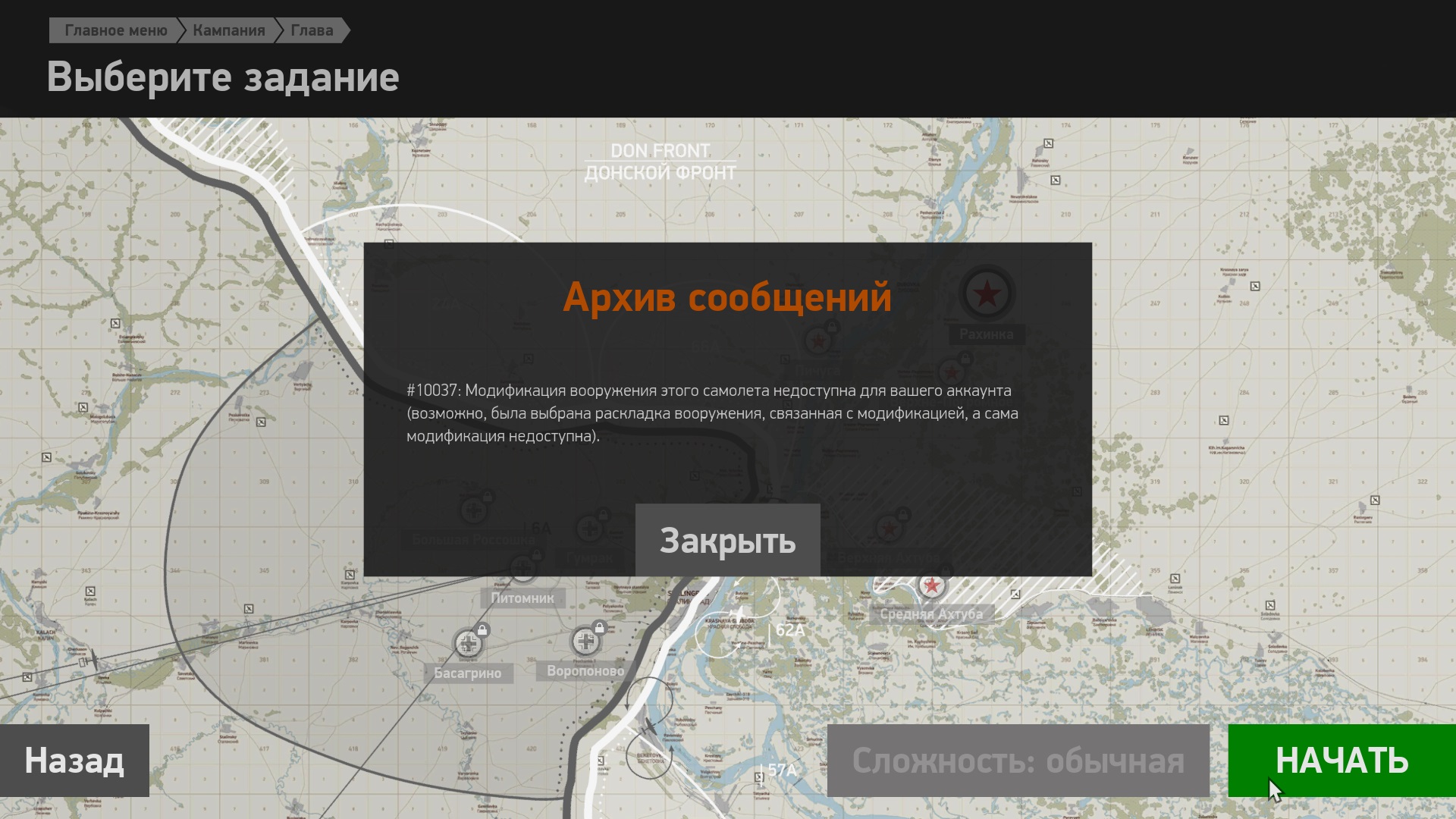 Antimesser Опубликовано: 5 октября 2014 Опубликовано: 5 октября 2014 (изменено) Недоступная ВЯ23 - два предположения: 1. перед тем как летать 1ю миссию вы летали на кастомной сложности где-то? 2. В процессе выполнения 1й мисси вы разбились и пидот погиб (вам показало красный квадратик "погиб" после миссии)? Я летал на кастомной сложности в простом редакторе. Первую миссию в кампании отлетал, но завершать на точке отхода не стал, долетел до аэродрома и приземлился на пузо, отломив крыло. ( перед вылетом настройки сложности почему-то были недоступны). На второй миссии из-за недоступности ВЯ ошибка. Так же замочек висит и на типе миссии "Штурмовка" Изменено 5 октября 2014 пользователем Antimesser